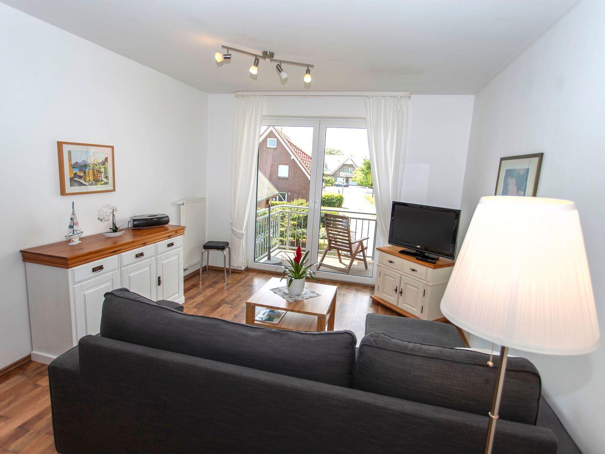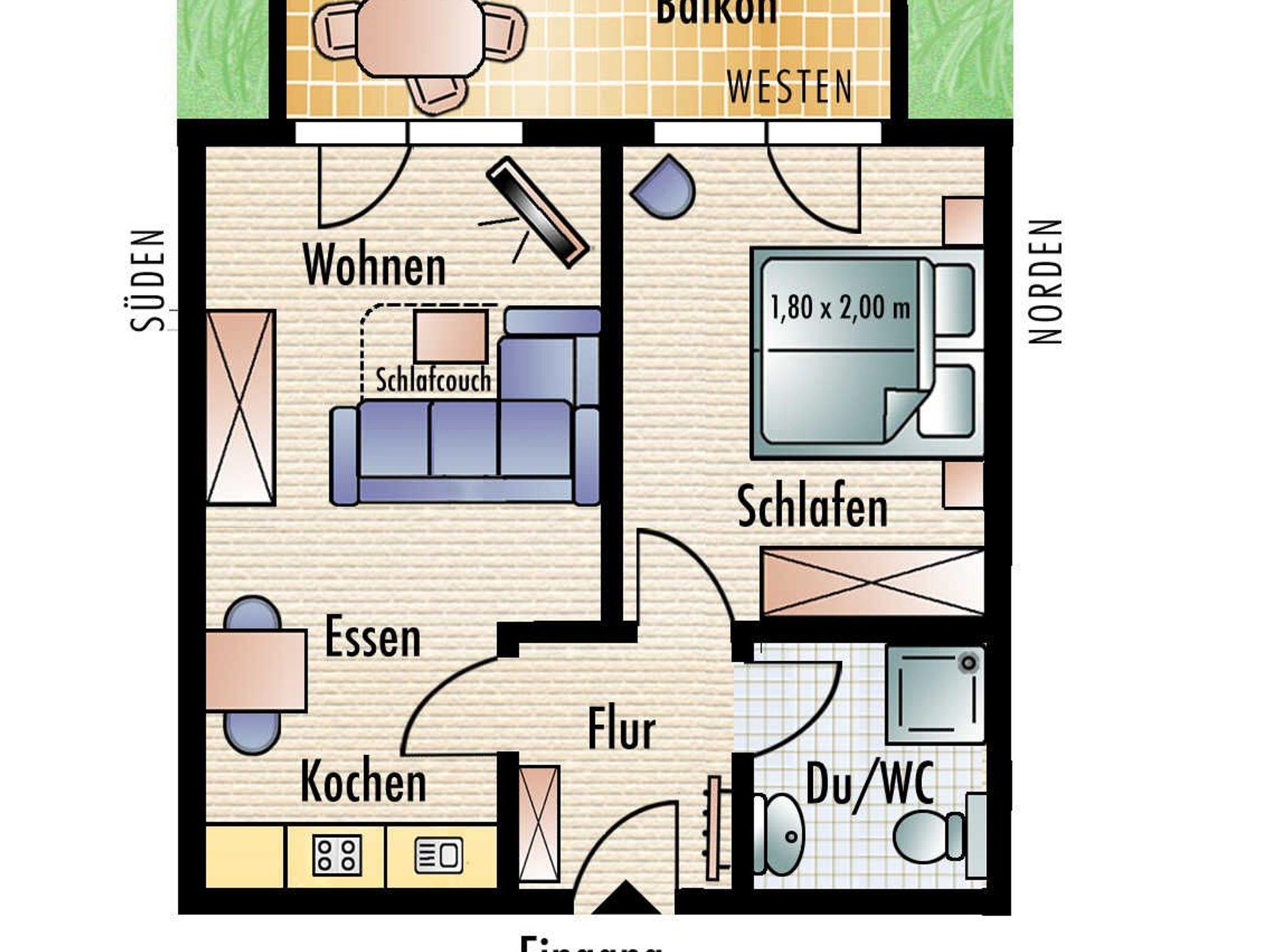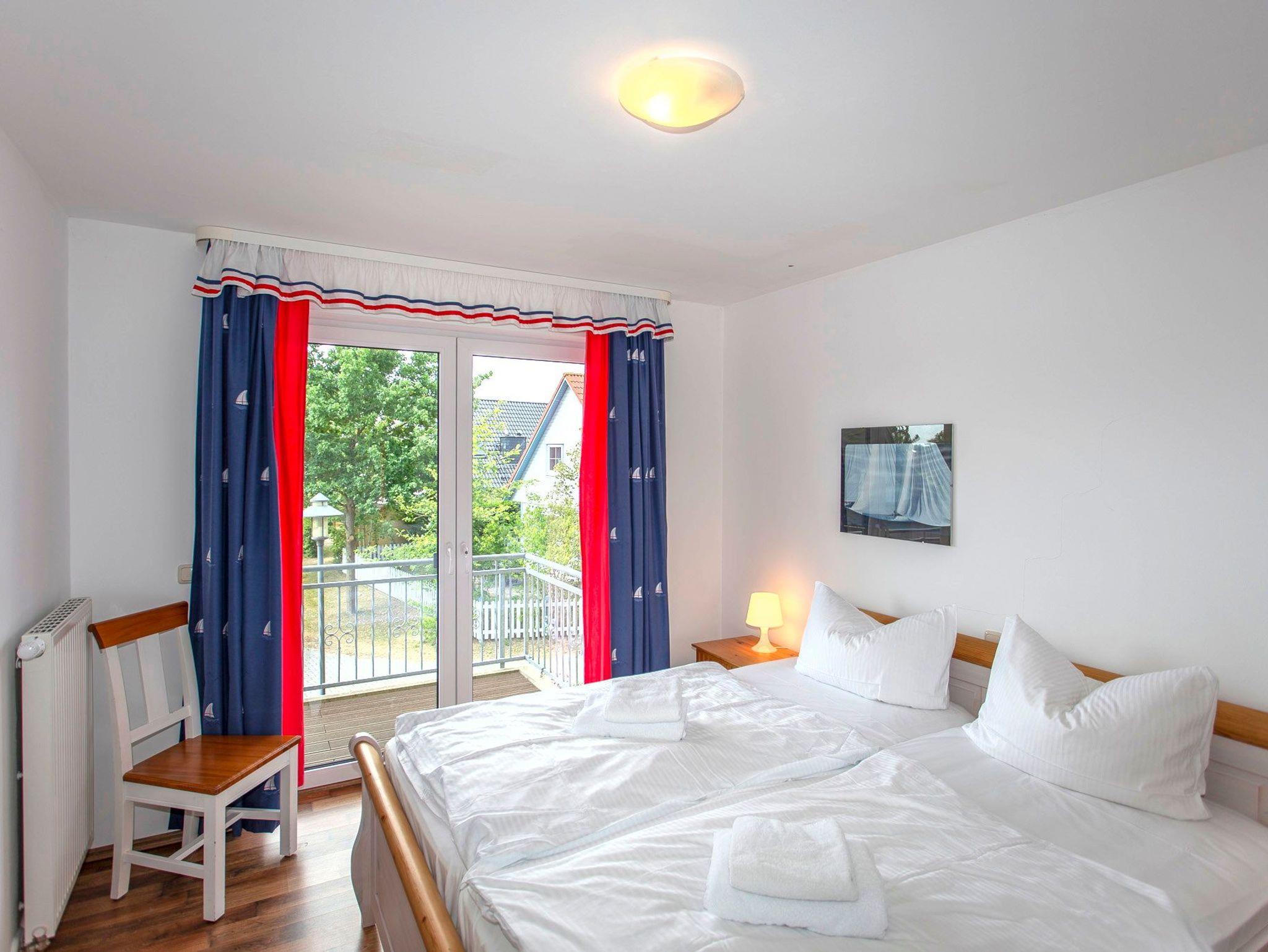 Die modern und individuell eingerichtete 2-Raum Ferienwohnung in Wiek auf der Insel Rügen befindet sich im 1. Obergeschoss im Haus Boddenblick. Sie hat eine Grundfläche von ca. 40qm. Vom Wohn- und Schlafraum gibt es direkten Zugang zum großen Balkon, von den aus man einen Blick durch die Gärten der benachbarten Wohnhäuser bis zum Bodden hat.