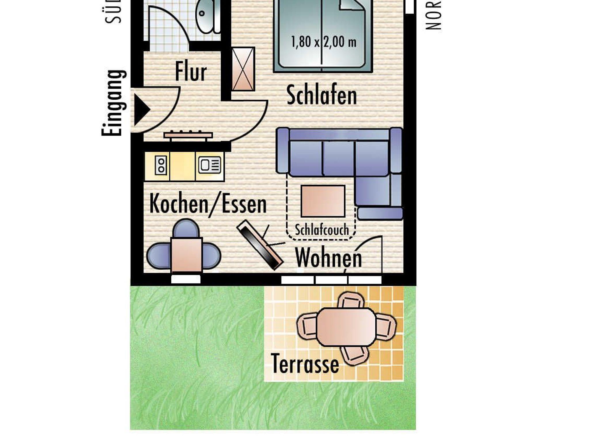 Vom Wohnraum aus ist der Zugang zur Terrasse mit Gartenmöbeln gegeben. Im Flur ist eine Flurgarderobe angebracht. Das Bad (innen liegend) ist mit Dusche/WC und Waschbecken ausgestattet.