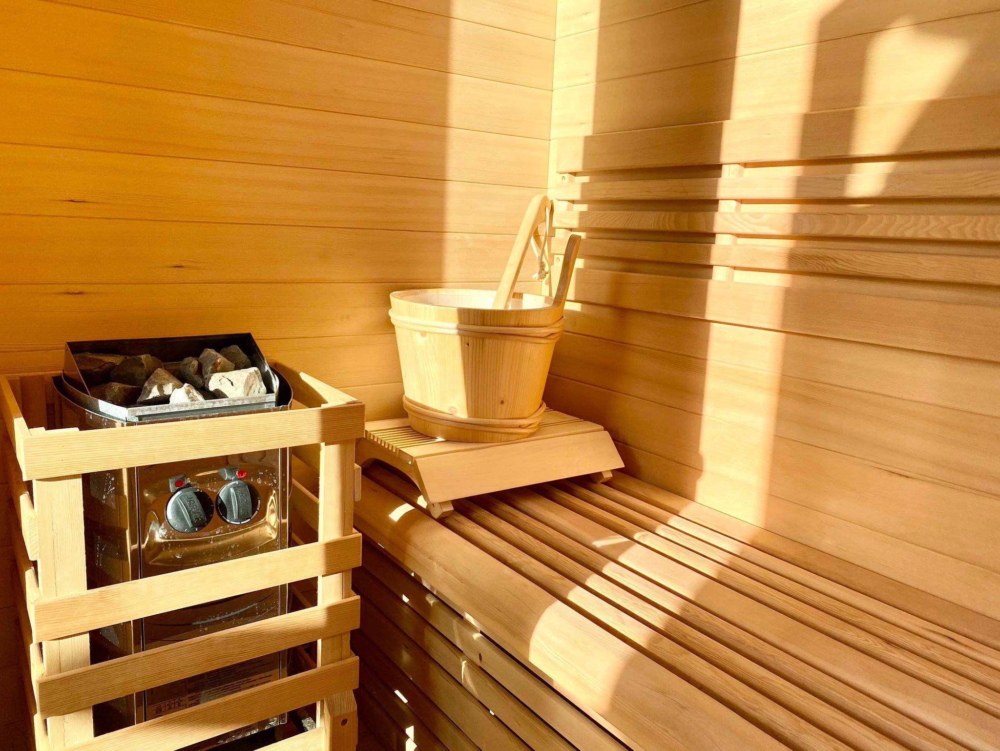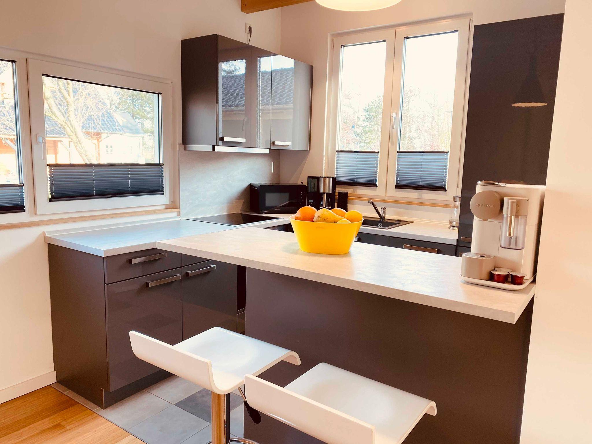 Das behagliche, offene Wohnzimmer mit bodentiefen Fenstern und direktem Zugang zum Garten, ein großer Smart-TV mit Blu-ray-Player, eine Bluetooth-Stereoanlage und der Essbereich mit Kaminofen und offener Küche sind Kommunikationsmittelpunkte des Hauses. Die Ausstattung der Küche bietet: eine Spülmaschine, Kaffeemaschine, Nespressomaschine, Milchaufschäumer, Mikrowelle, Wasserkocher, Toaster sowie umfangreiche Küchenutensilien. Im EG ist ein zusätzliches Bad mit Dusche, Waschmaschine und Trockner vorhanden. Zwei Schlafzimmer mit Doppelbett im Obergeschoss, jeweils mit Flachbild-TV und jeweils eigenem En-Suite-Bad und eine kleine Sauna, die von beiden Badezimmern aus zu betreten ist, bilden zusammen mit der Loggia ein weiteres Highlight.