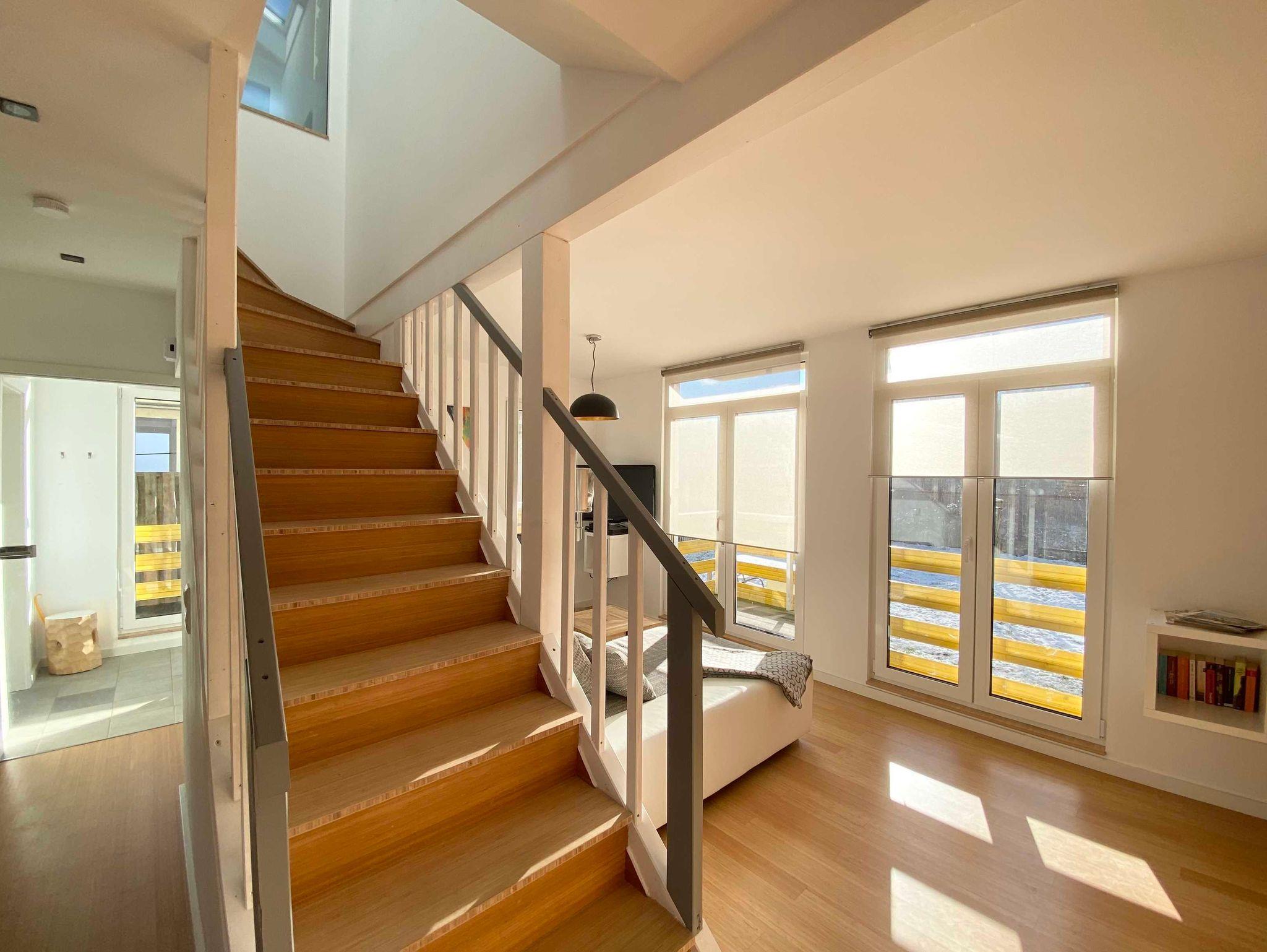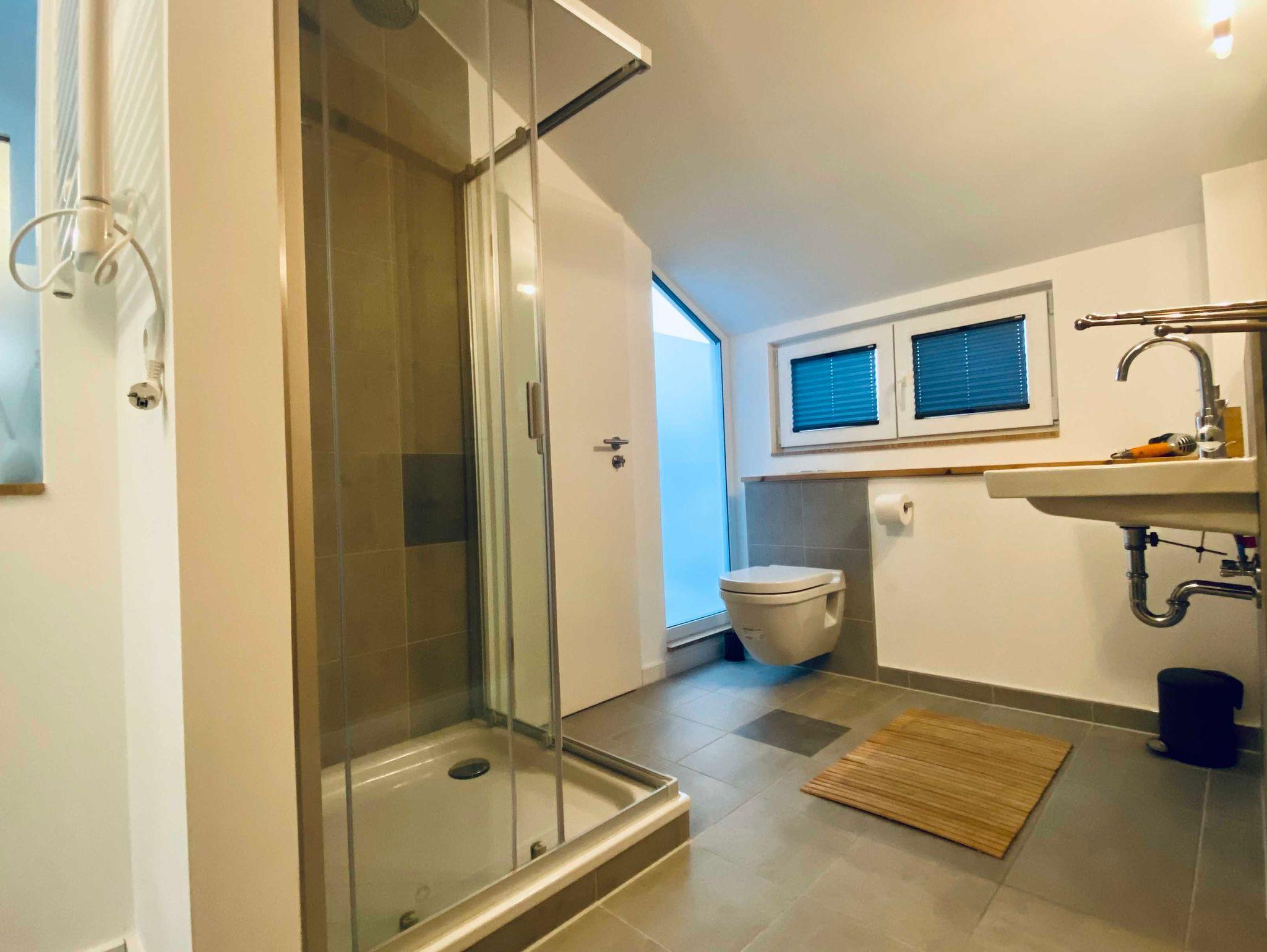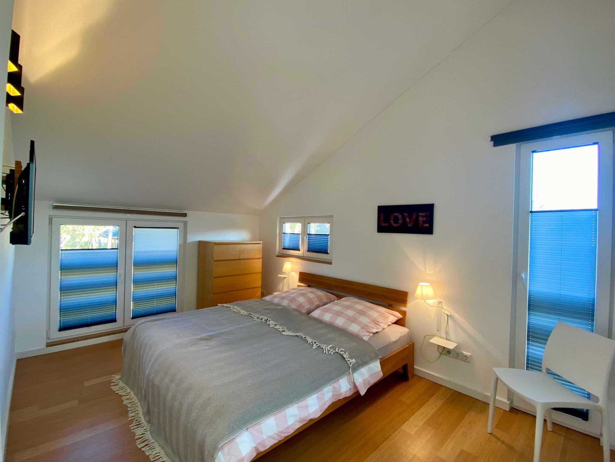 Behagliches, offenes Wohnzimmer mit bodentiefen Fenstern. Kommunikationsmittelpunkt ist der Essbereich mit Kaminofen und offener Küche. Ausstattung der Küche: Spülmaschine, Kaffee- und Nespressomaschine, Milchaufschäumer, Mikrowelle, Wasserkocher, Toaster sowie umfangreiche Küchenutensilien. Im EG befindet sich ein zusätzliches Bad mit Dusche und Waschmaschine, sowie Trockner. 2 Schlafzimmer mit Doppelbett, Flachbild-TV und jeweils eigenem En-Suite-Bad. Eine kleine Sauna, die von beiden Badezimmern aus zu betreten ist, bildet zusammen mit der Loggia ein weiteres Highlight.