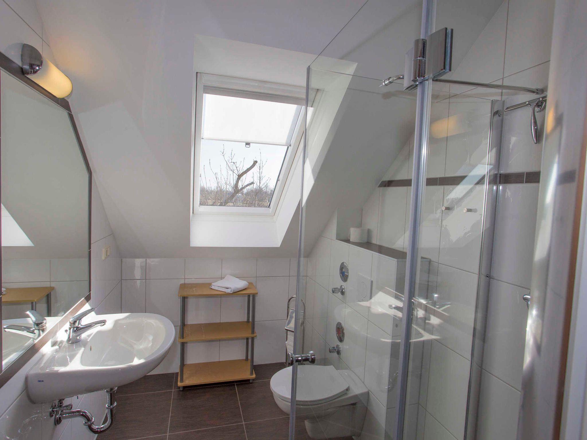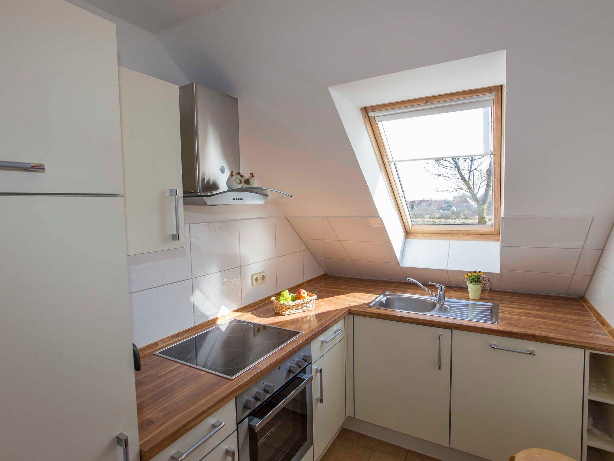 Die Küche ist mit AEG-Geräten ausgestattet: Geschirrspüler, Backofen, 4-Platten-Ceranfeld. Der große Kühlschrank mit Gefrierfach ist von Privileg. Die Küche ist weiterhin mit Toaster, Kaffeemaschine, Wasserkocher, Messerblock, Töpfe, Pfanne sowie ausreichend Geschirr und Besteck ausgestattet. Das separate Bad mit ebenerdiger Glasdusche, WC, Waschbecken und großem Spiegel hat ein großes Dachfenster mit Ausblick ins Grüne.