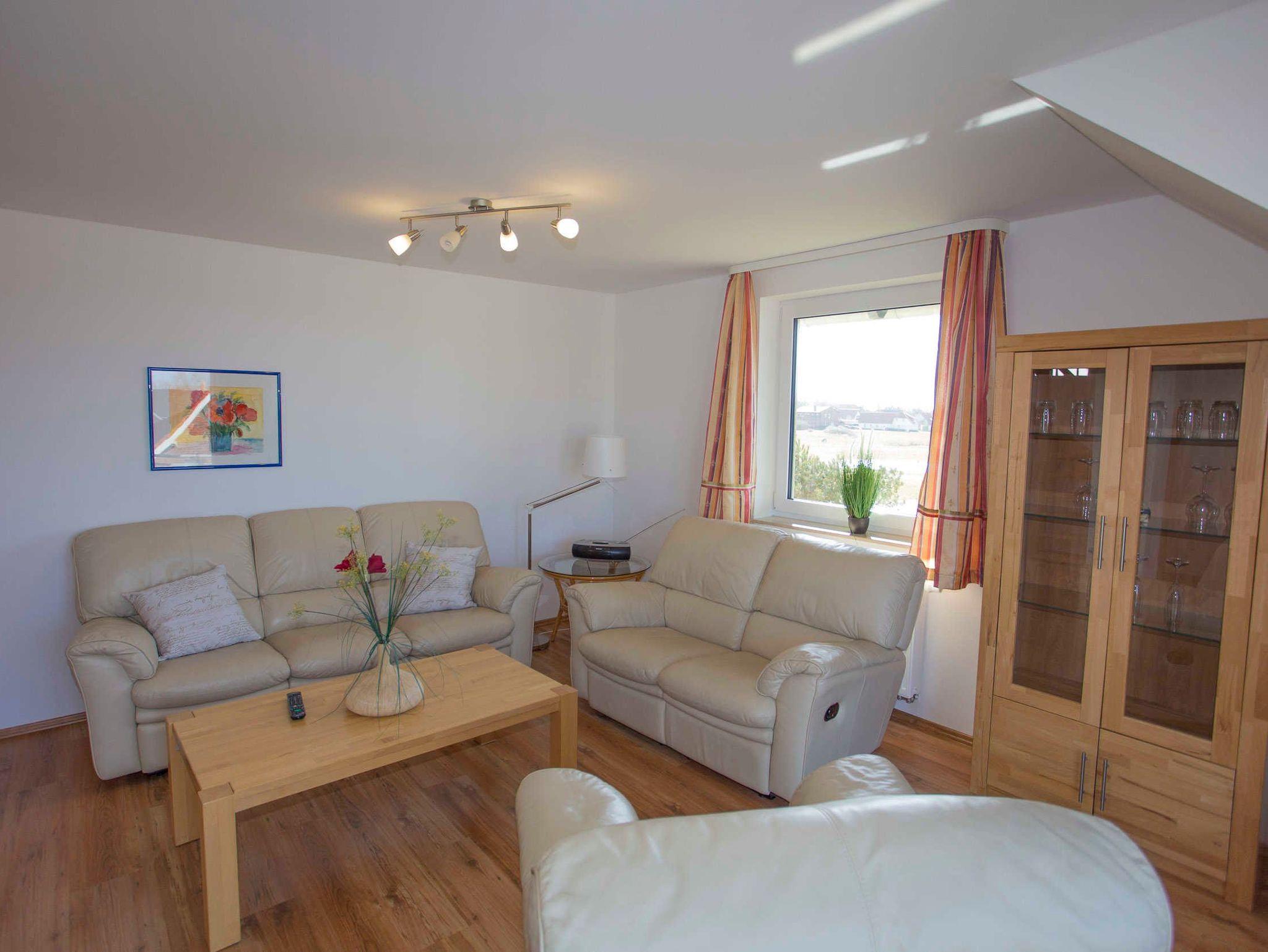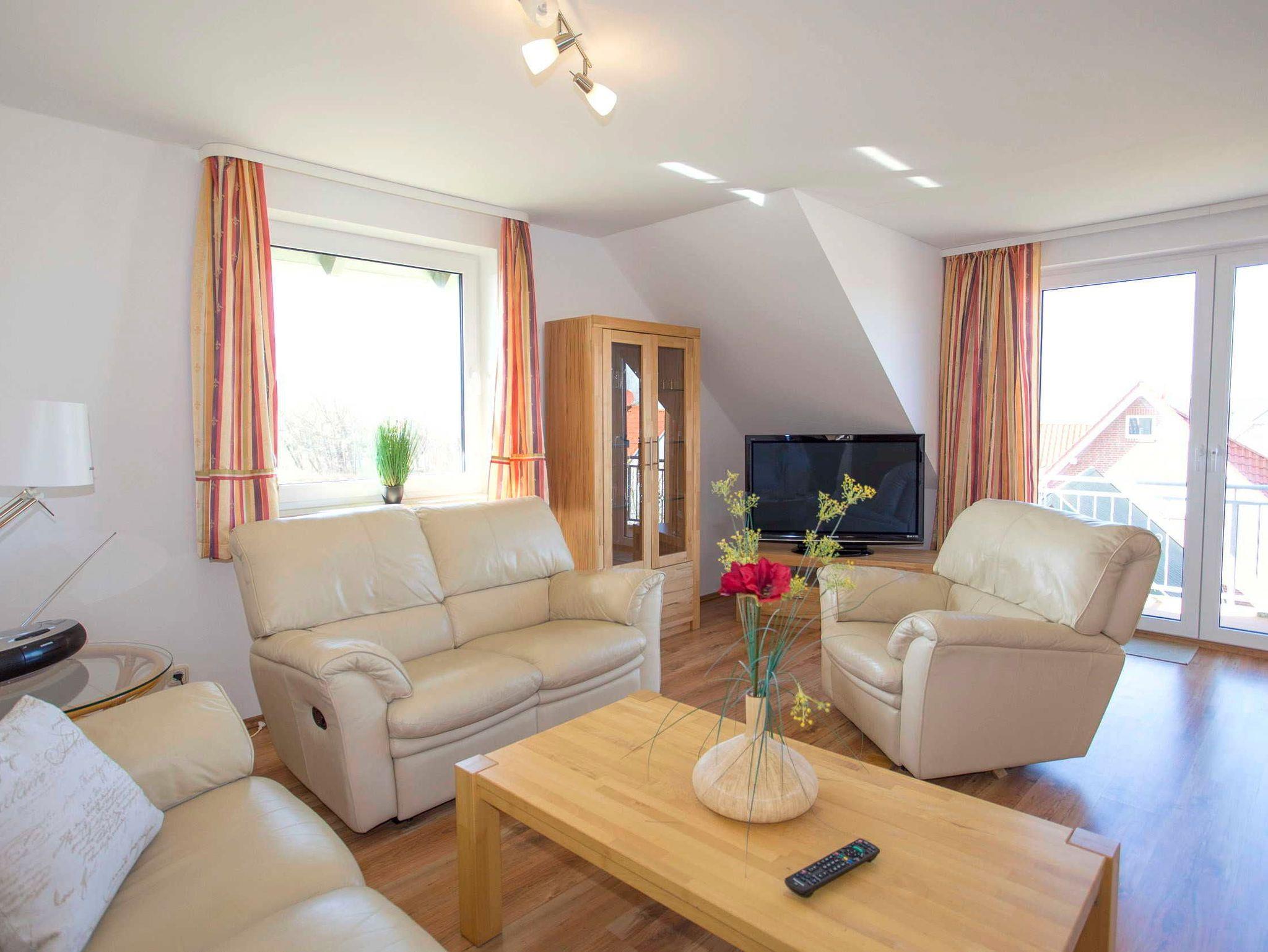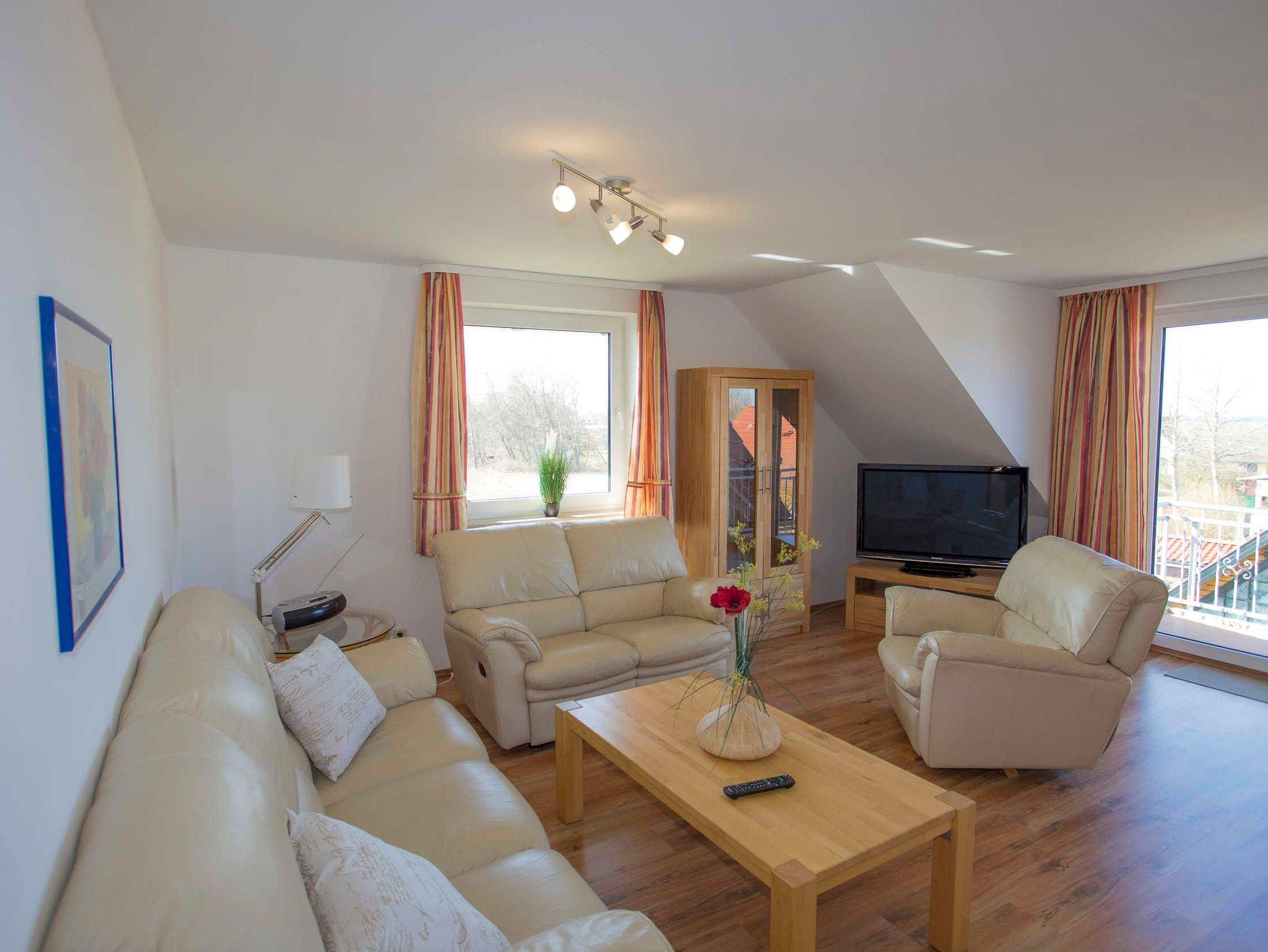 Der Wohnraum ist modern eingerichtet und verfügt über einen großen Flachbild-TV, einem Lowboard und Highboard sowie einer hellen Kunstledercouch (3-er Sofa, 2-er Sofa und verstellbarem Sofasessel) und einem großen massiven Esstisch mit passenden Holzstühlen. Vom Wohnraum ist der Zugang zum Balkon gegeben, von wo Sie aus einen tollen Blick auf den Wieker Bodden haben.