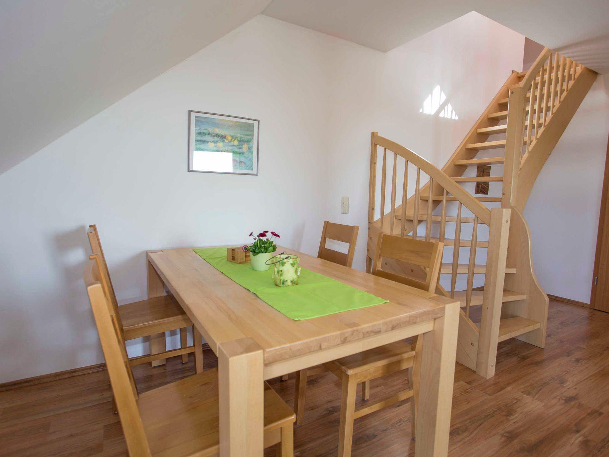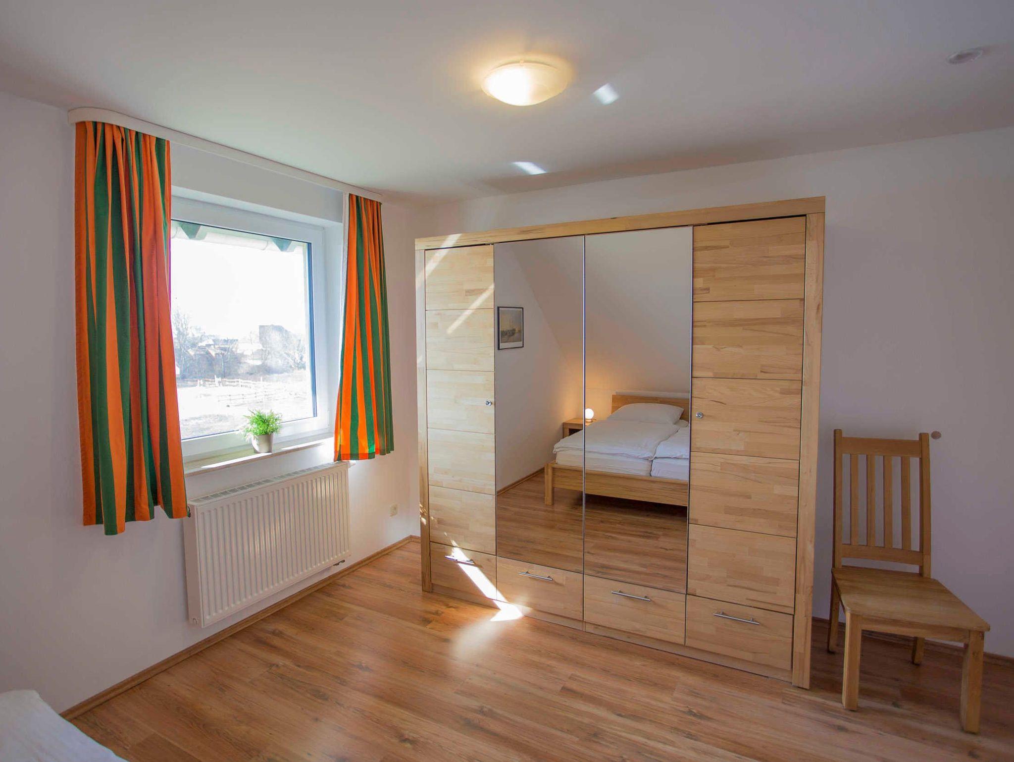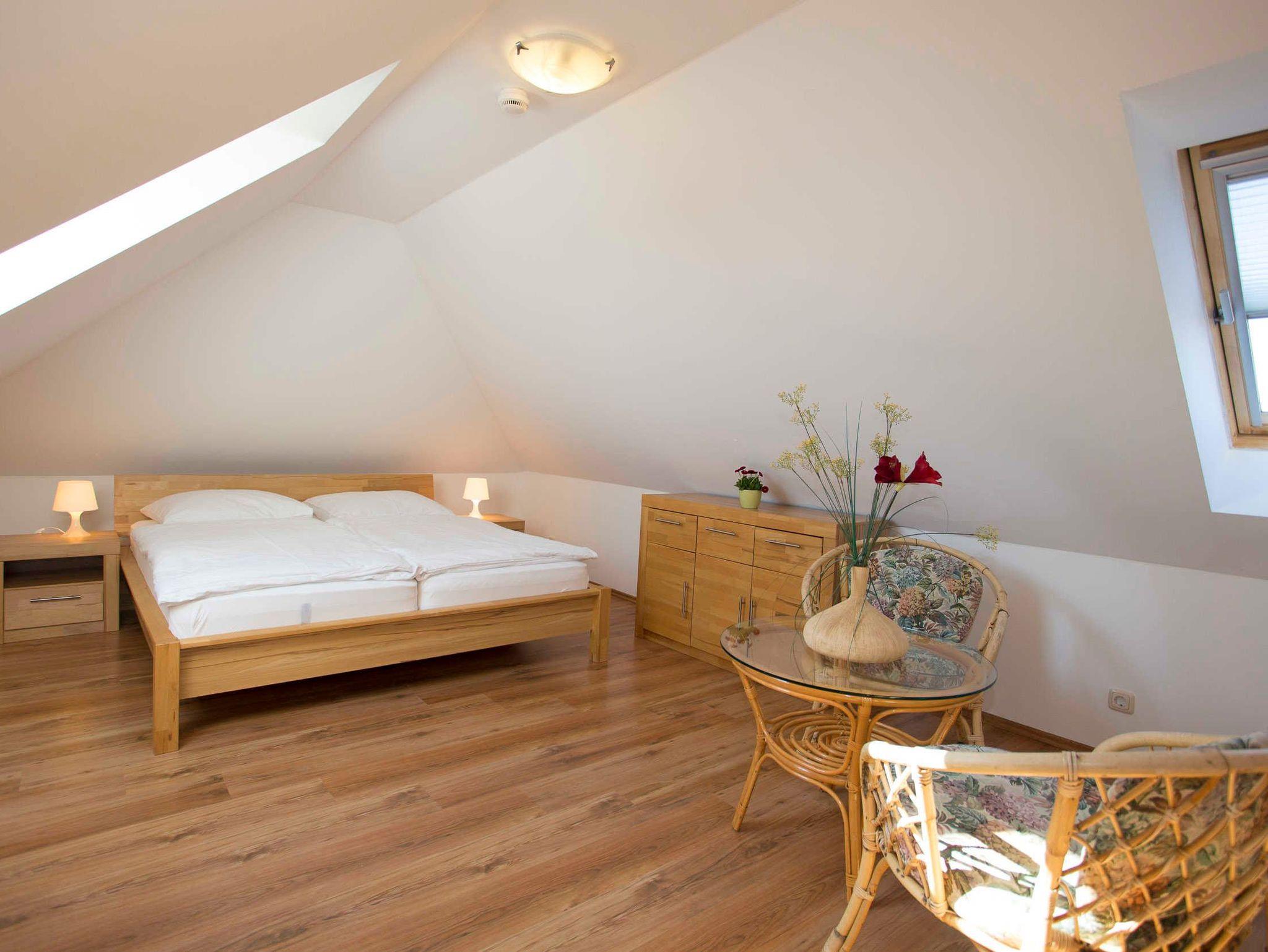 Die Ferienwohnung verfügt über zwei separate Schlafzimmer mit jeweils einem Doppelbett (2,00 x 1,80m, einzelnen 21cm dicken Komfort-Kaltschaum-Matratzen sowie sehr guten Lattenrosten). Ein Schlafzimmer befindet sich im Dachausbau und ist über eine offene Treppe vom Wohnzimmer aus zu erreichen. Es ist mit einem Sideboard ausgestattet. Im zweiten Schlafzimmer befindet sich ein großer Kleiderschrank.