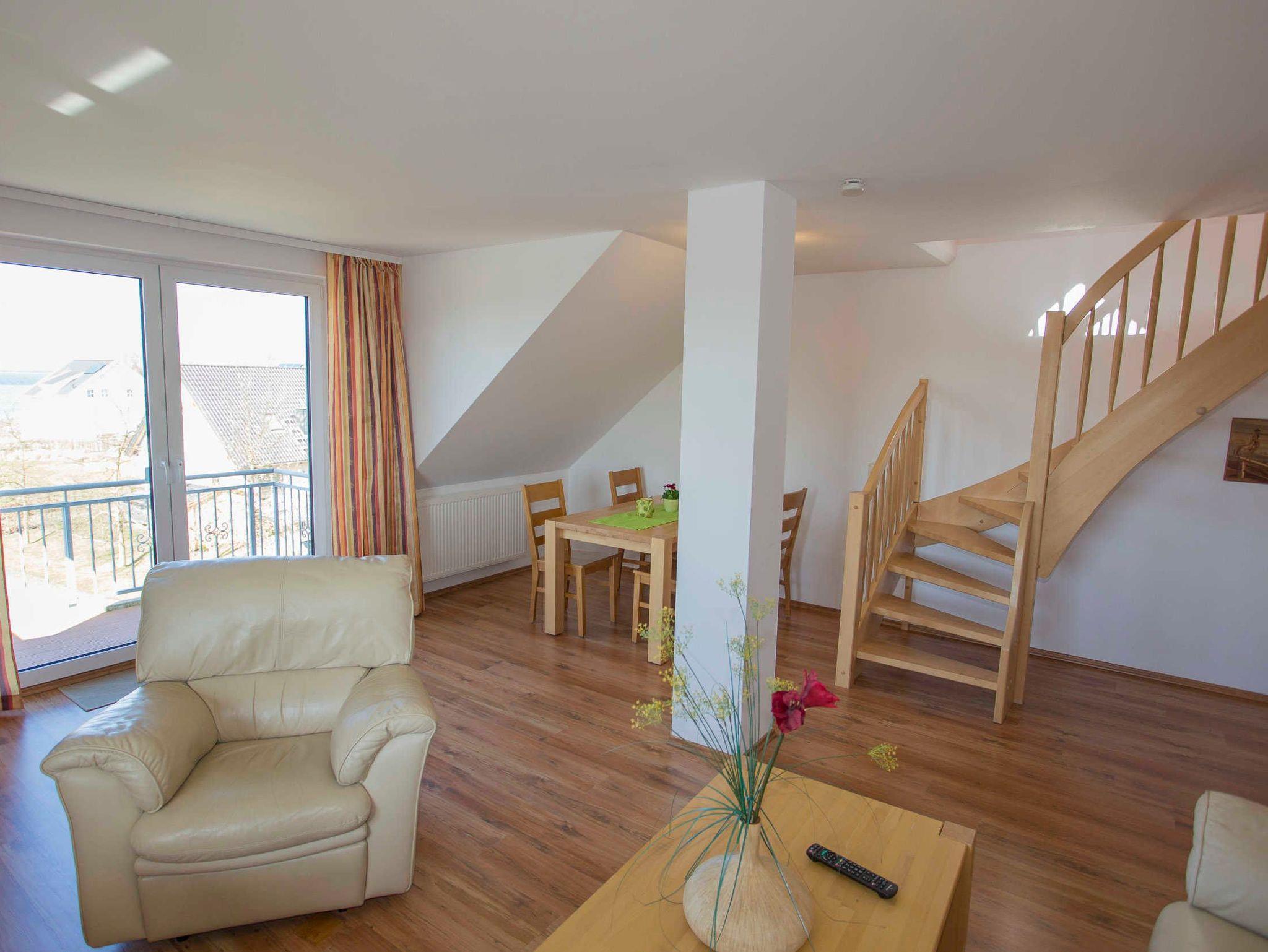 Die modern, hell und individuell ausgestattete 75qm große 3-Raum-Ferienwohnung in Wiek auf der Insel Rügen befindet sich im 2. Obergeschoss im Haus Boddenblick. Sie erstreckt sich über 2 Etagen und bietet einen herrlichen Blick sowohl über den Wieker Bodden als auch über das grüne Achterland.