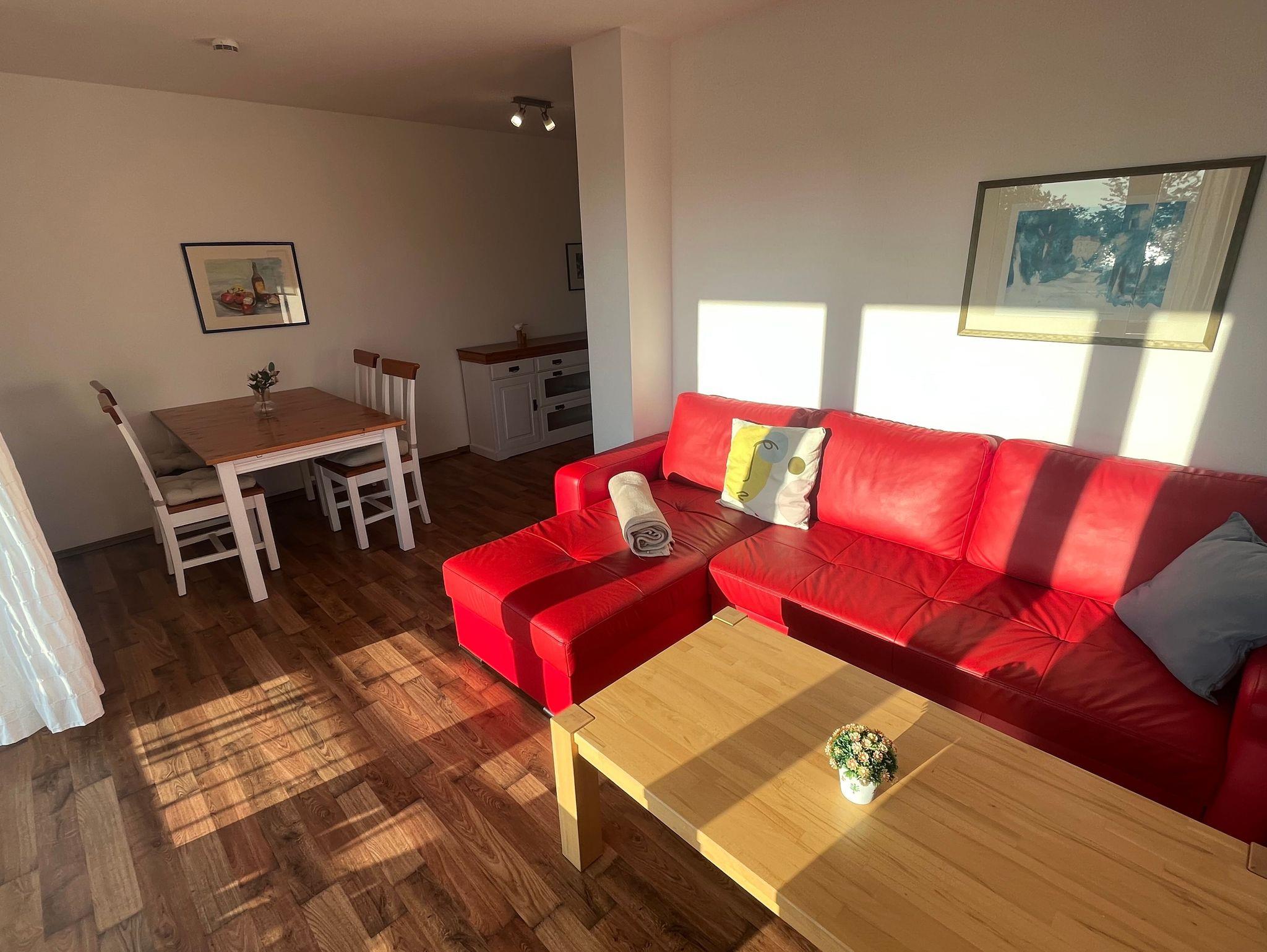 Der Wohnraum ist geschmackvoll eingerichtet und verfügt über einen Flachbild-TV, einem Lowboard sowie einer ausziehbaren roten Couch und einem großen massiven Holzesstisch mit 6 Stühlen. Vom Wohnraum ist der Zugang zur großen Terrasse gegeben.