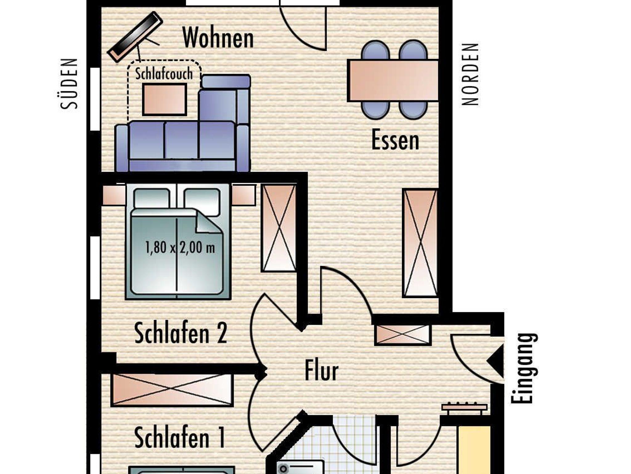 Die Ferienwohnung verfügt über zwei separate Schlafzimmer mit jeweils einem Doppelbett (2,00 x 1,80m, einzelnen 21cm dicken Komfort-Kaltschaum-Matratzen sowie sehr guten Lattenrosten) und jeweils einen großen Kleiderschrank.