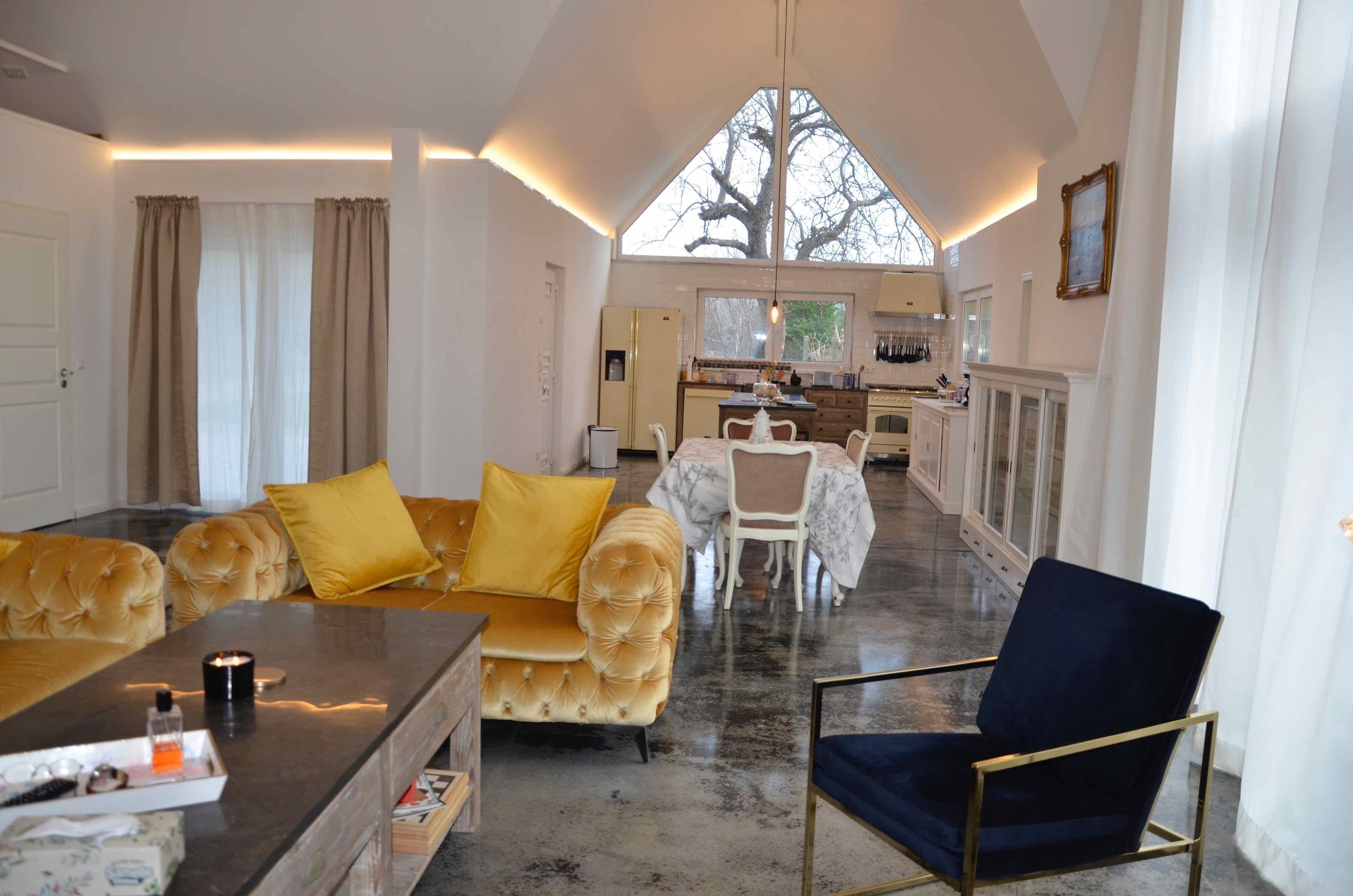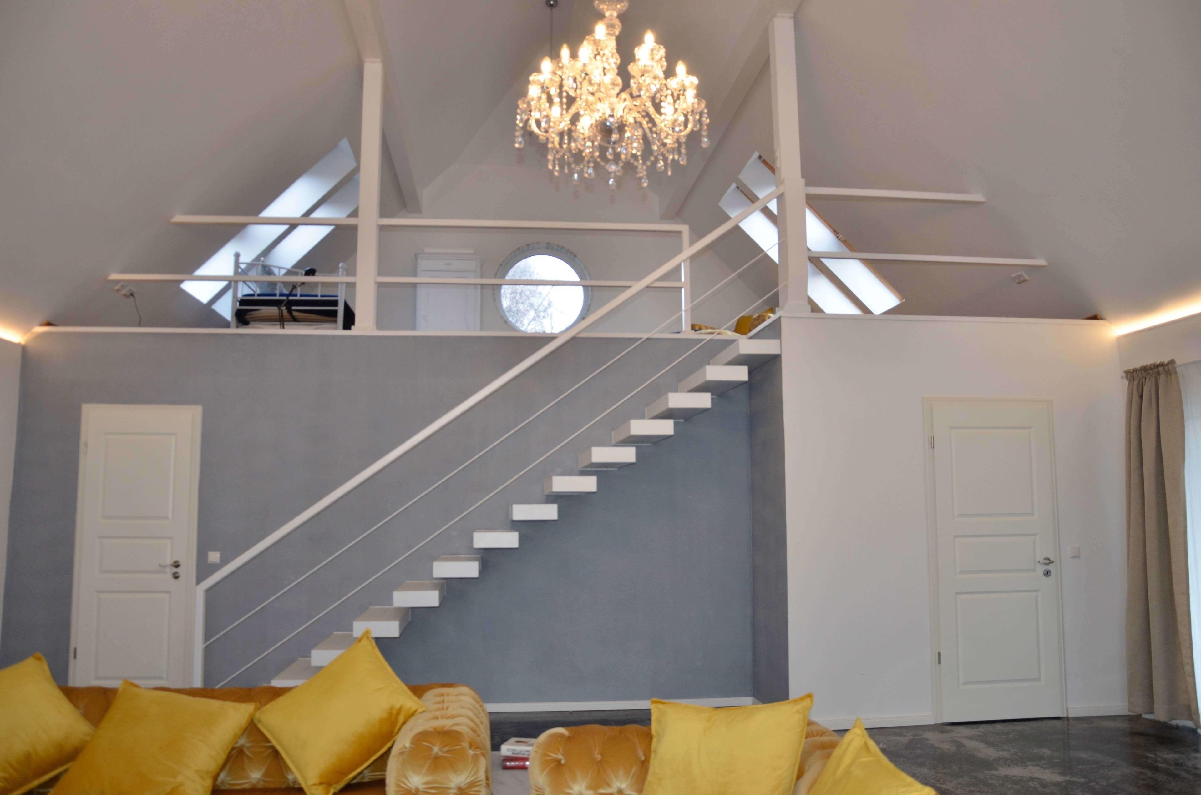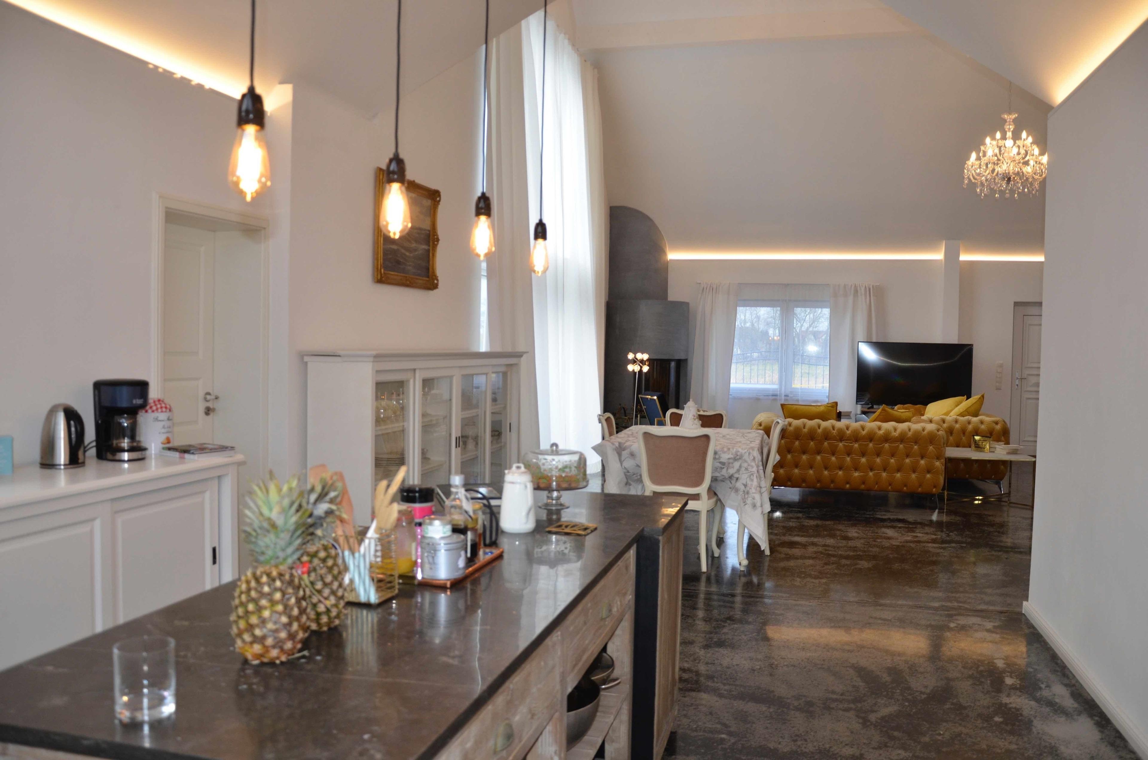 Wohnbereich, Empore, 2 Schlafzimmer (eines befindet sich auf der offenen Empore), 2 Badezimmer, Hauswirtschaftsraum mit Waschmaschine, offene Landhausküche mit Kücheninsel.