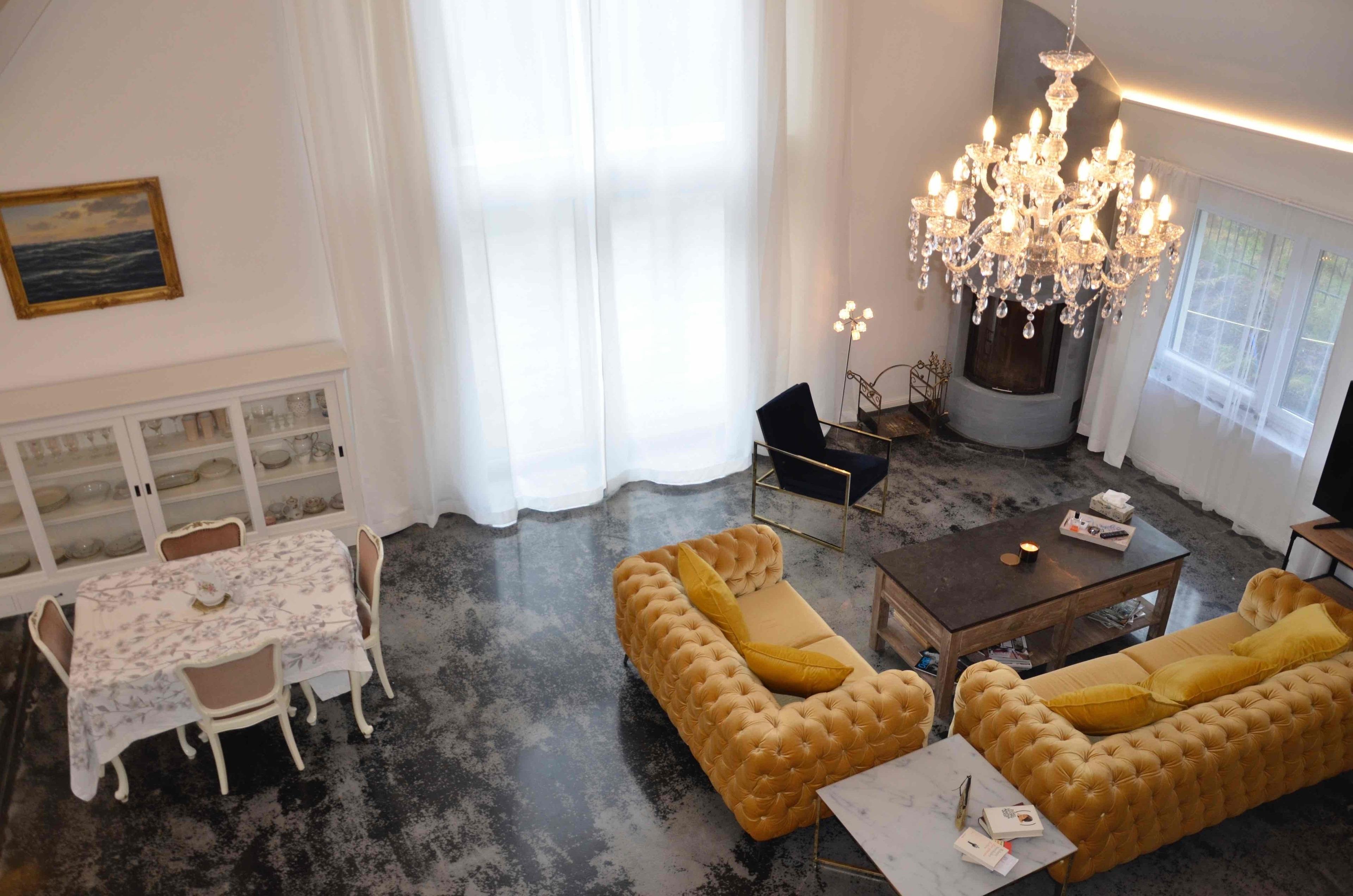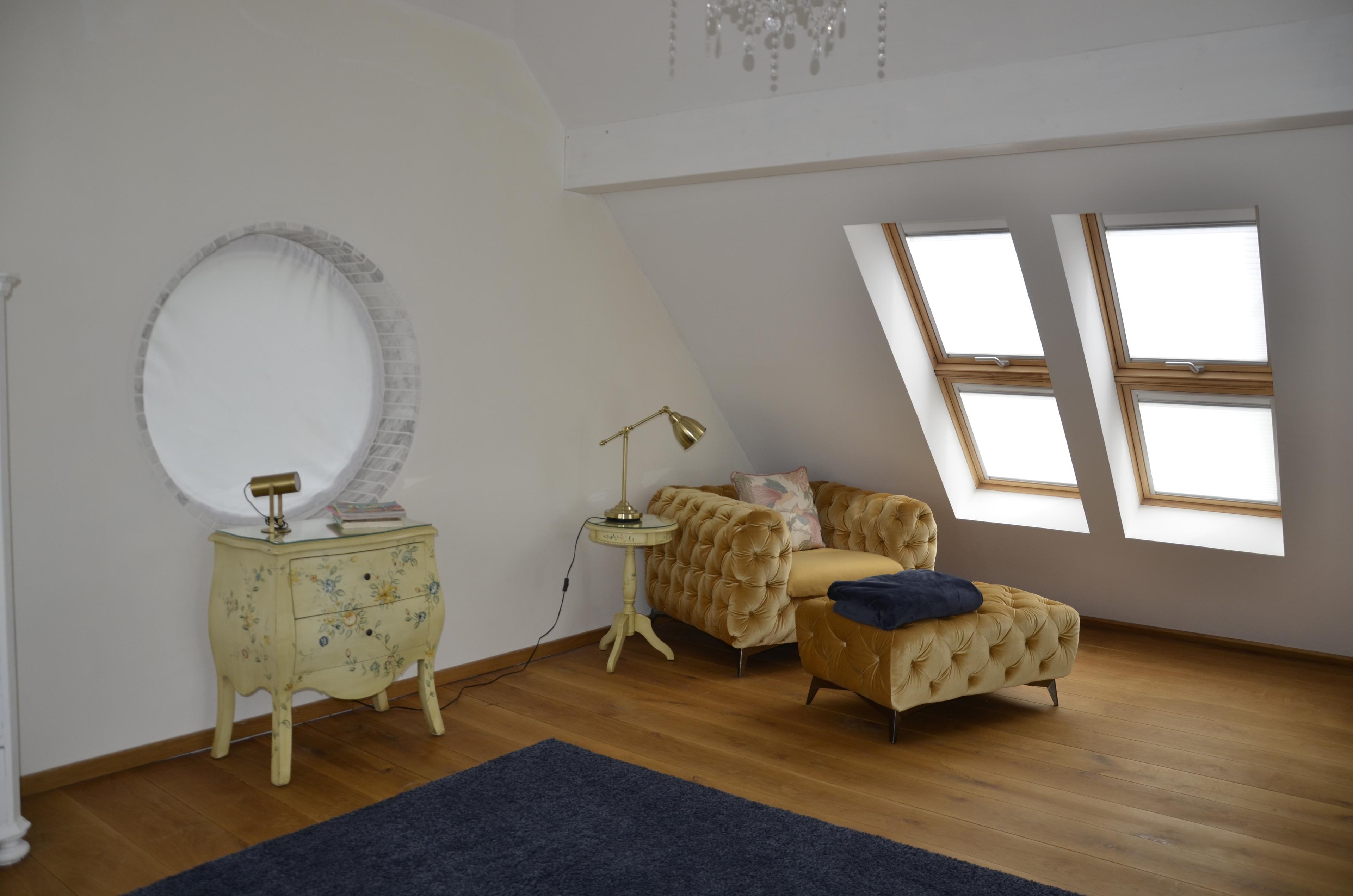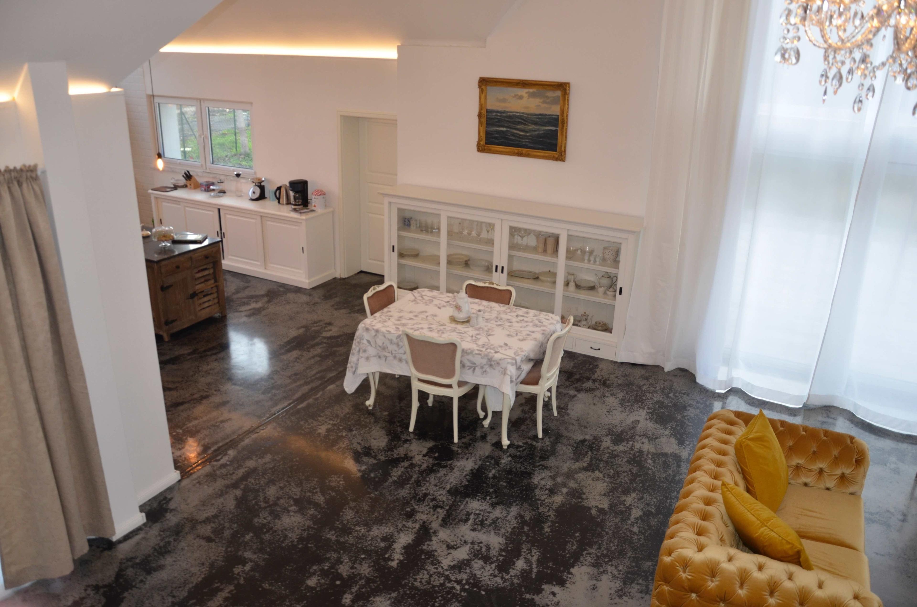 Wohnbereich, Empore, 2 Schlafzimmer (eines befindet sich auf der offenen Empore), 2 Badezimmer, Hauswirtschaftsraum mit Waschmaschine, offene Landhausküche mit Kücheninsel.