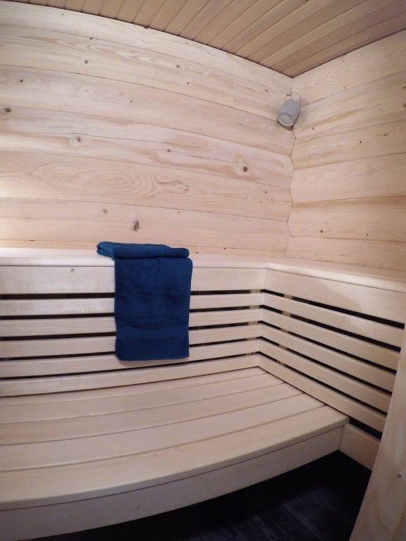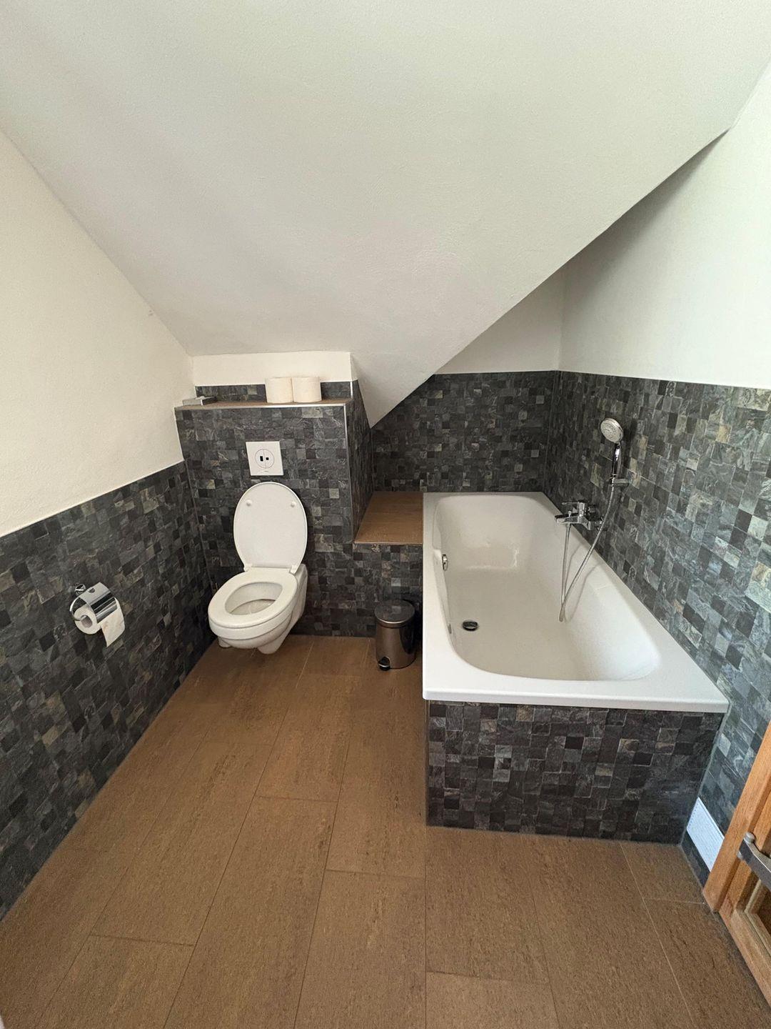 Das Badezimmer ist mit WC, Dusche und Badewanne ausgestattet und bietet direkten Zugang zur Sauna – perfekt für entspannende Stunden nach einem erlebnisreichen Tag. Von der Terrasse aus haben Sie Zugang zum Garten mit einer schönen Rasenfläche, wo Sie die frische Luft und die idyllische Umgebung genießen können.