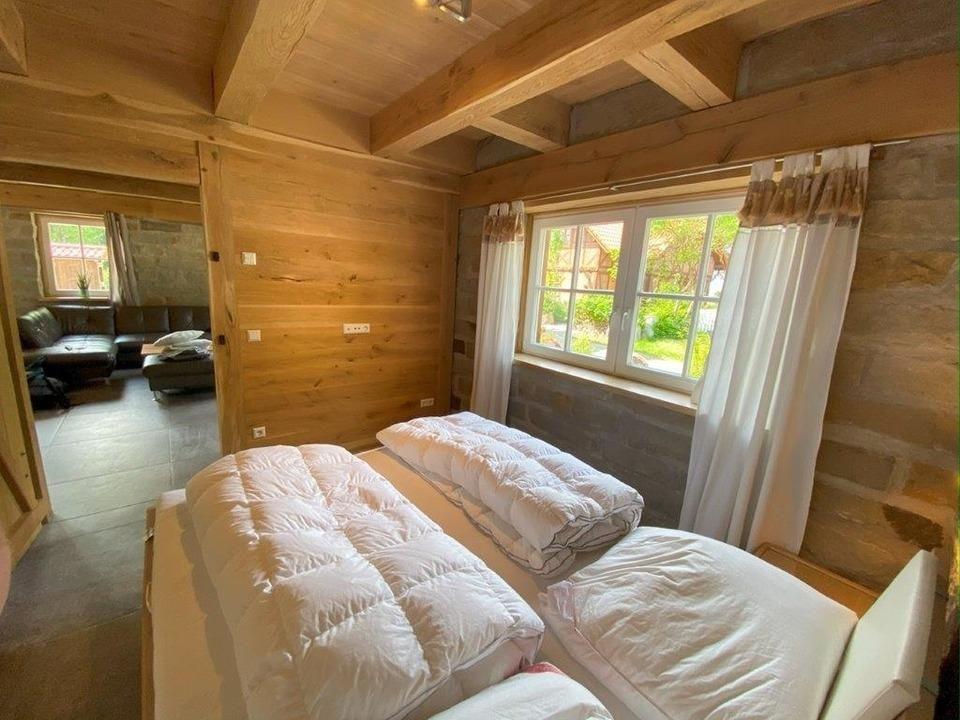 Unsere großzügige Ferienwohnung im Erdgeschoss bietet auf 82 m² Platz für bis zu vier Personen. Zwei gemütliche Schlafzimmer mit Doppelbetten garantieren erholsame Nächte. Der offene Wohnbereich ist mit einer großen Eck-Ledercouch ausgestattet und lädt zum Entspannen ein. Die offene Küche ist voll ausgestattet. Viel naturbelassenes Eichenholz und Natursteinmauern verleihen der Wohnung einen besonderen Charme. Der Kaminofen sorgt für wohlige Wärme und eine gemütliche Atmosphäre.