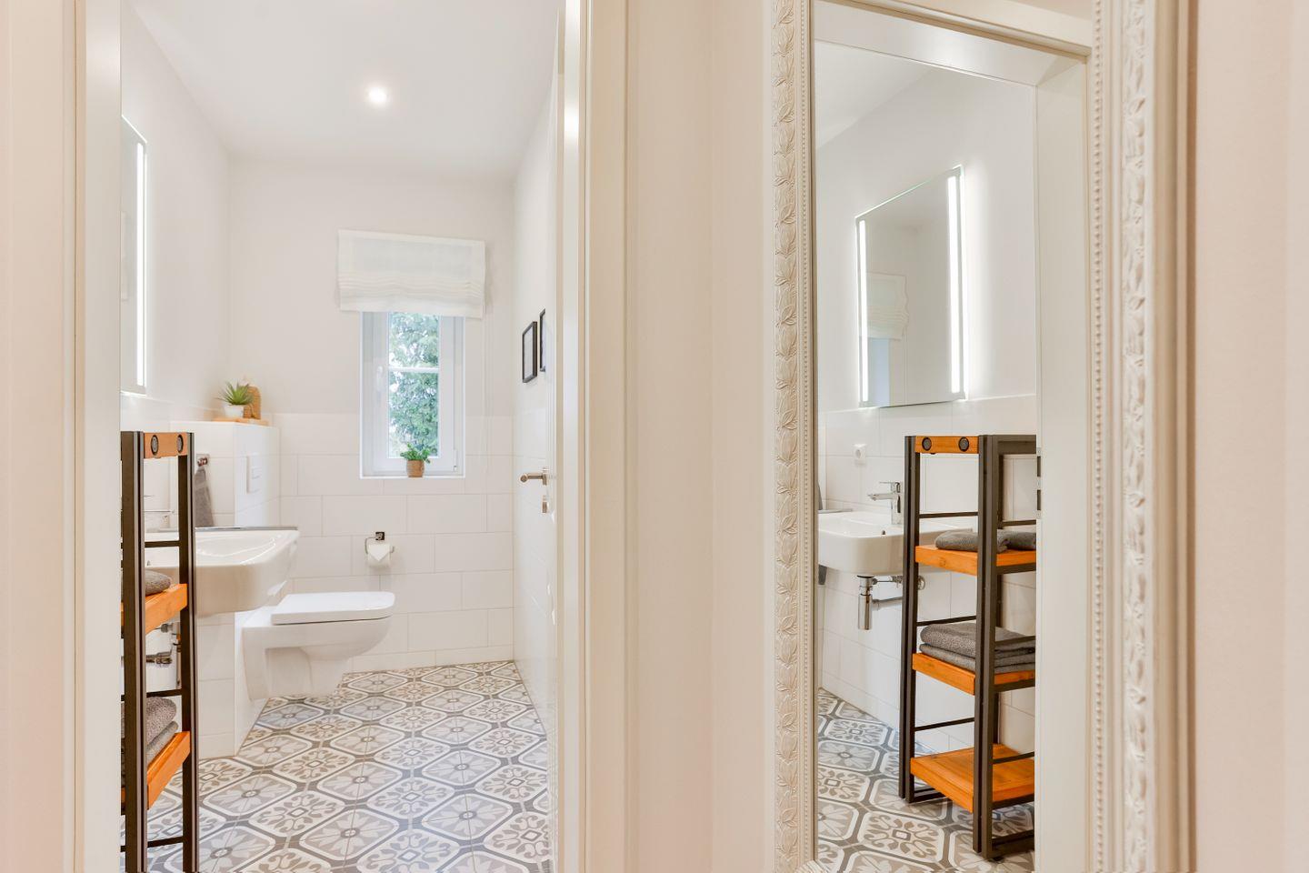 Das große Bad mit Wanne & Dusche oben, zusätzliches WC unten. Ein Hauswirtschaftsraum mit Waschmaschine, Bügeleisen & Reinigungsutensilien steht zur Verfügung.