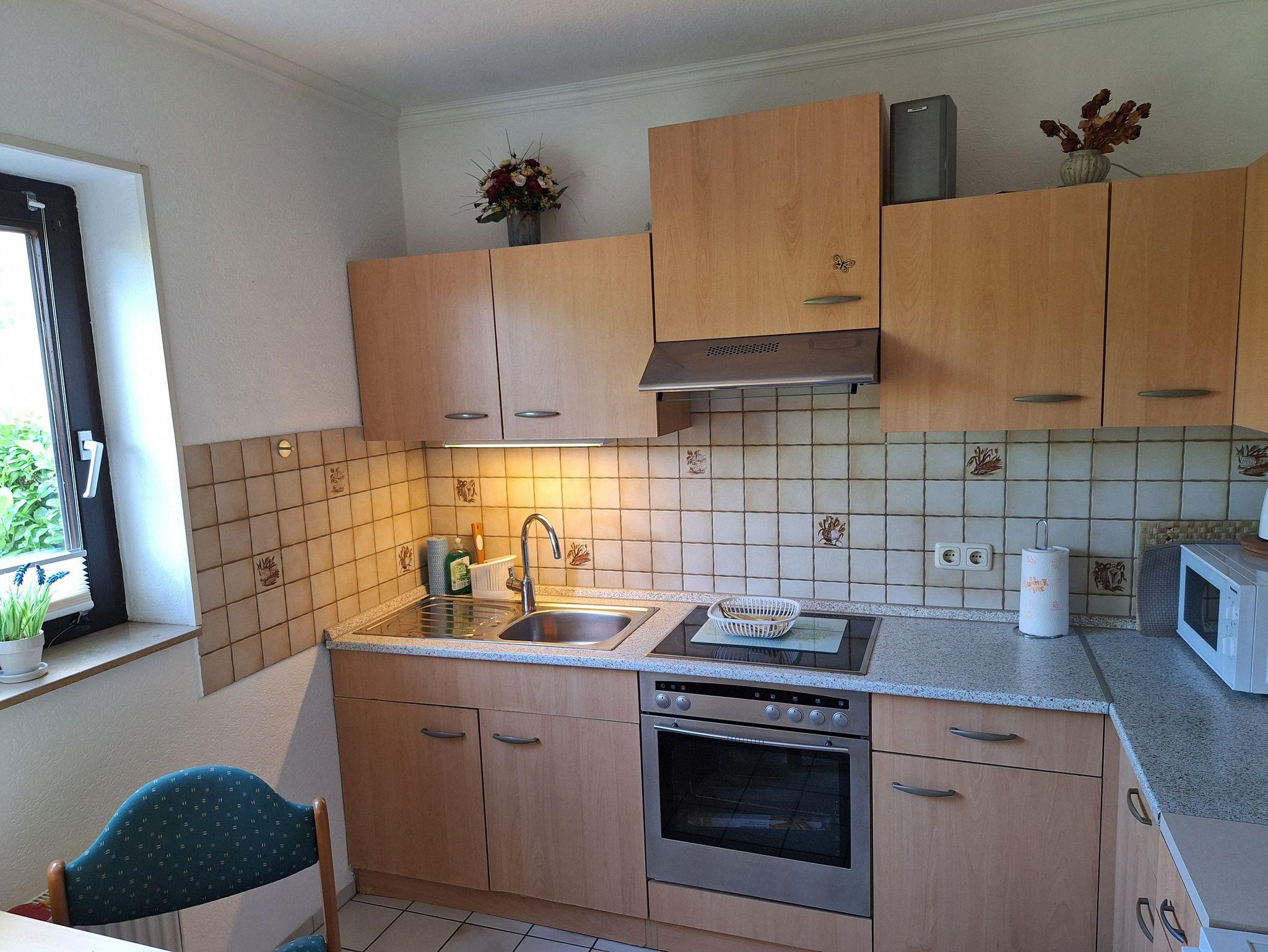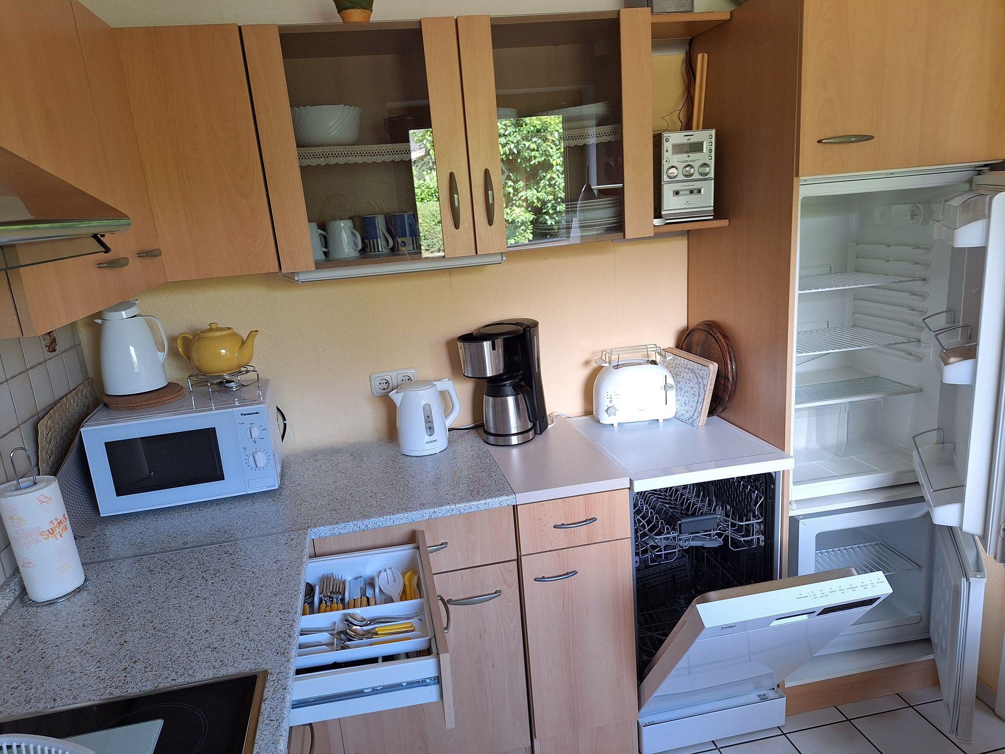 1 kpl. eingerichtete Einbauküche mit Fenster, kleiner Esstisch, Geschirrspüler, Mikrowelle, Herd mit Backofen, Gefrierschrank, Radio, und wenige Schritte zur eigenen möblierten Terrasse mit Grillmöglichkeit.