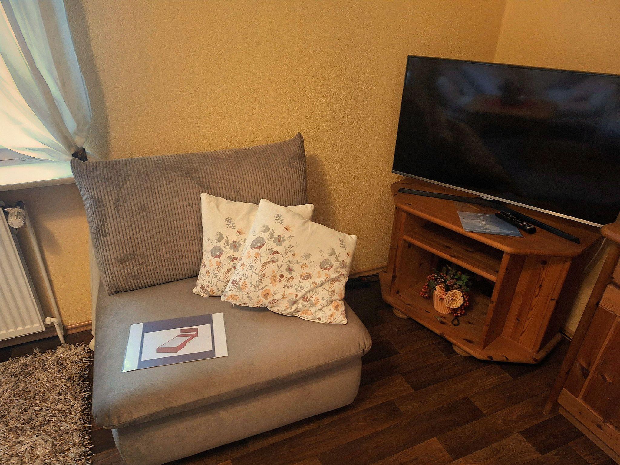 1 heller, freundlicher Wohnraum Südfenster mit Rollladen, Relaxsessel und bequemer Schlafsessel Wohnzimmer mit LED Fernseher