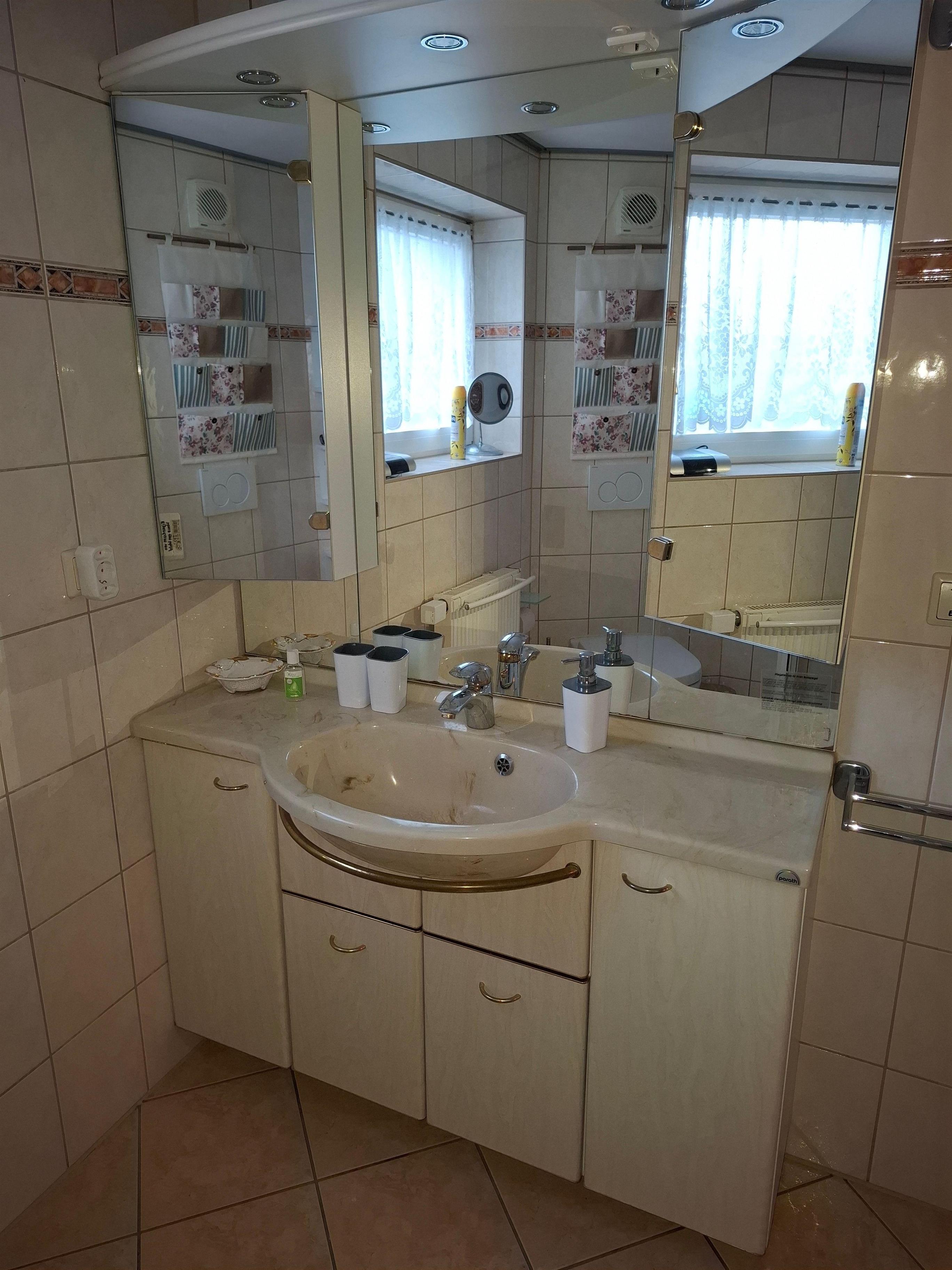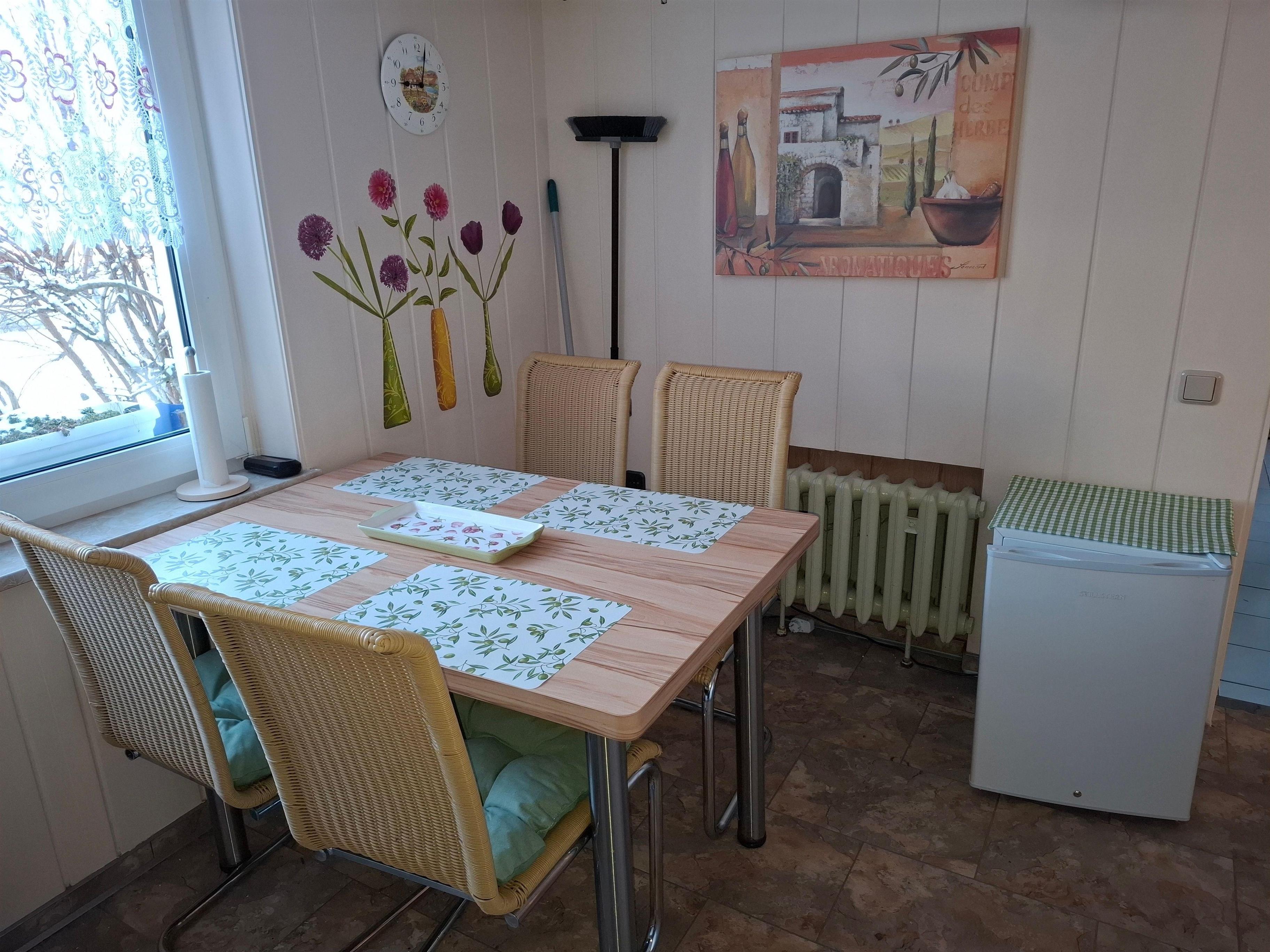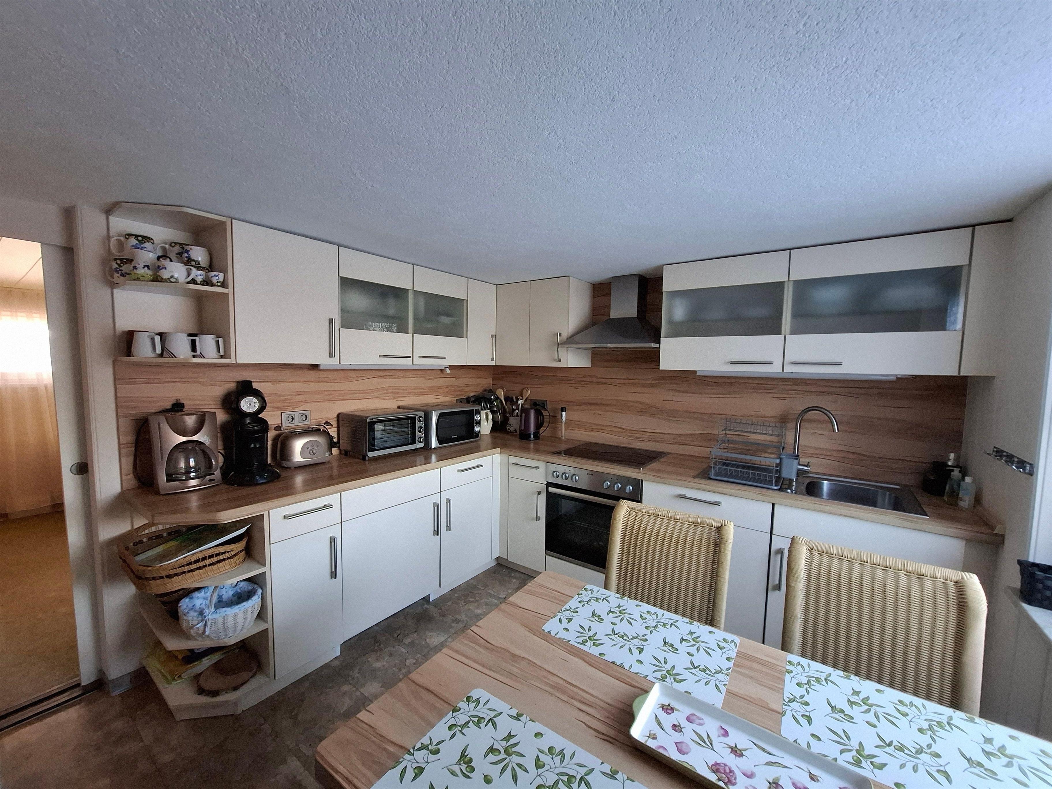 Die Einbauküche ist modern und funktional. Am Esstisch mit vier Freischwingern, habt ihr einen schönen Blick in den Garten. Es gibt einen Herd mit Backofen, Minibackofen, 42ltr. Gefrierschrank, Geschirrspüler, Mikrowelle, Wasserkocher, Toaster, Filterkaffeemaschine, Senseo Kaffeemachine, ausreichend Geschirr und vieles mehr....