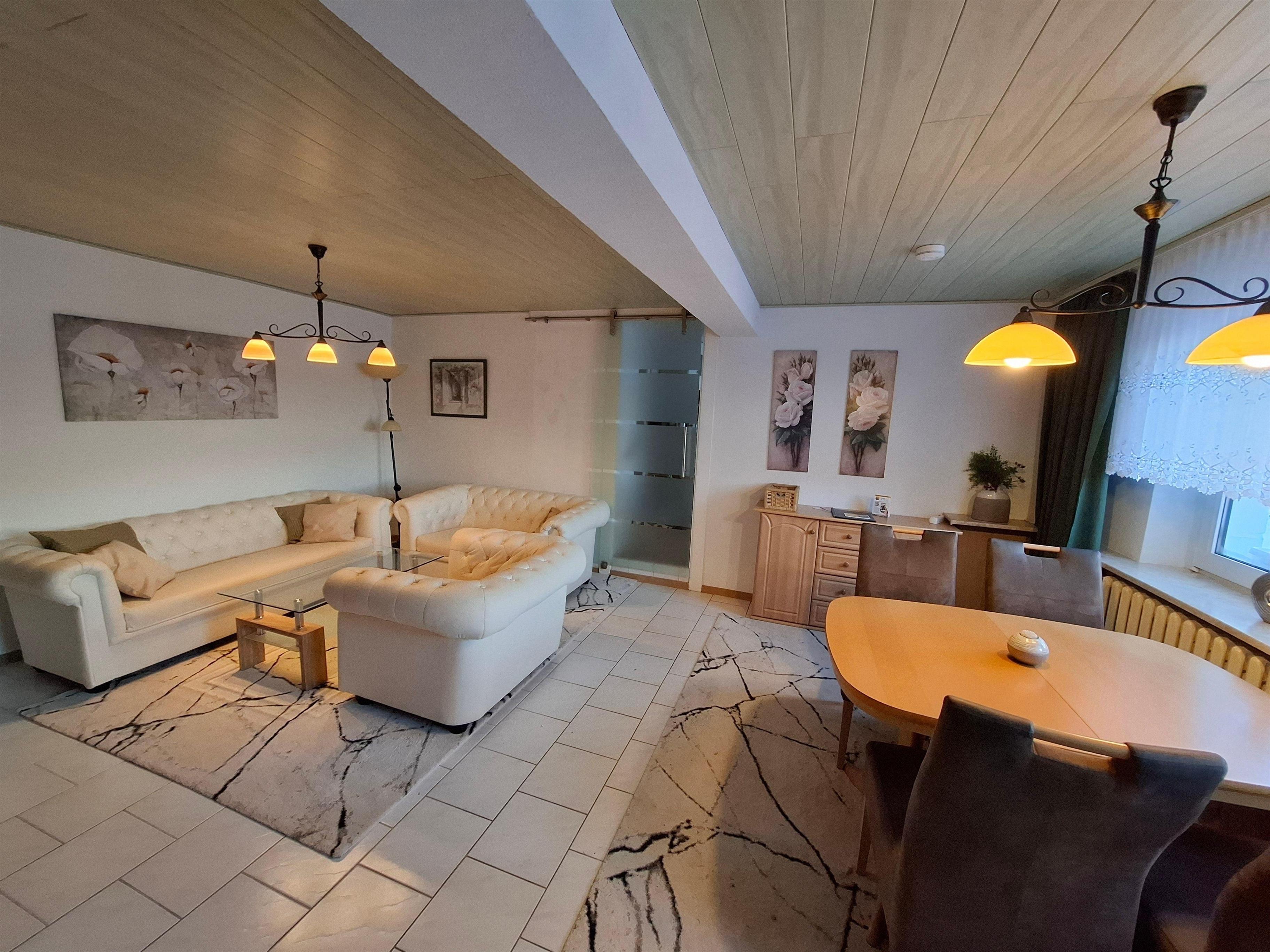 Das Wohnzimmer ist mit einer gemütlichen Couchgarnitur, Couchtisch sowie einem Esstisch mit 4 Stühlen ausgestattet.