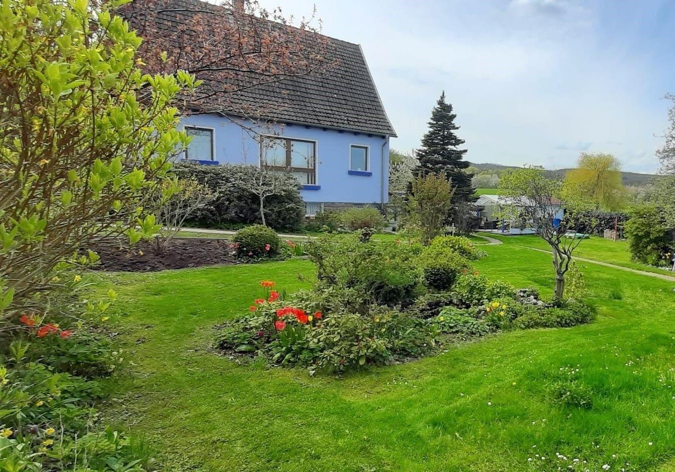 Großer eingezäunter eigener Gartenanteil mit herrlichem Blick auf die Teufelsmauer.