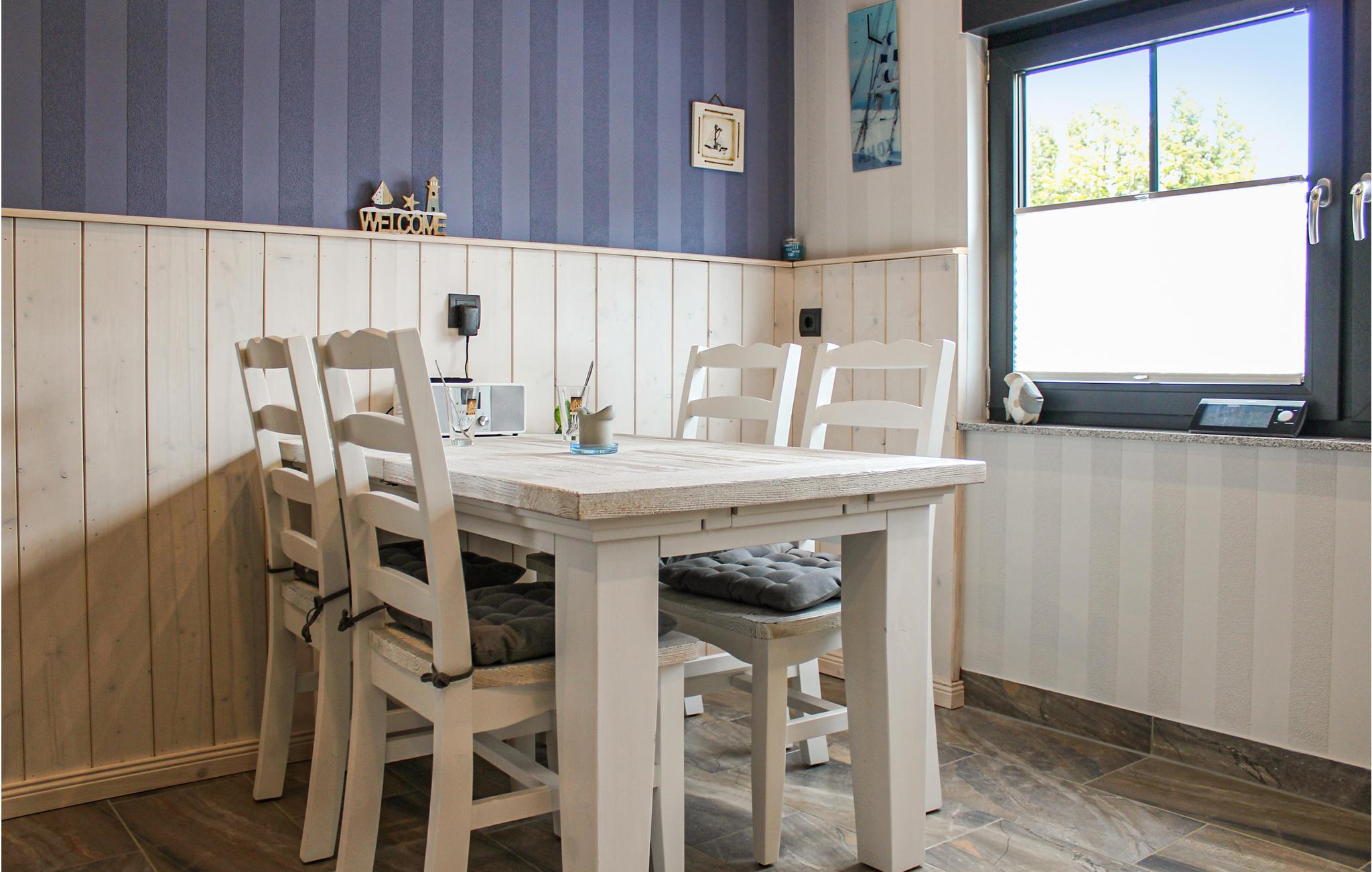 Lejligheden er dekoreret i maritime farver og udstråler ro. Der er en pilleovn i stuen, der giver hygge og varme. Du kan lave mad i det rummelige køkken. Prøv typiske østfrisiske retter såsom en snirtjebraten eller frugtgrød! Det store spisebord inviterer dig til at spise en omfattende morgenmad.