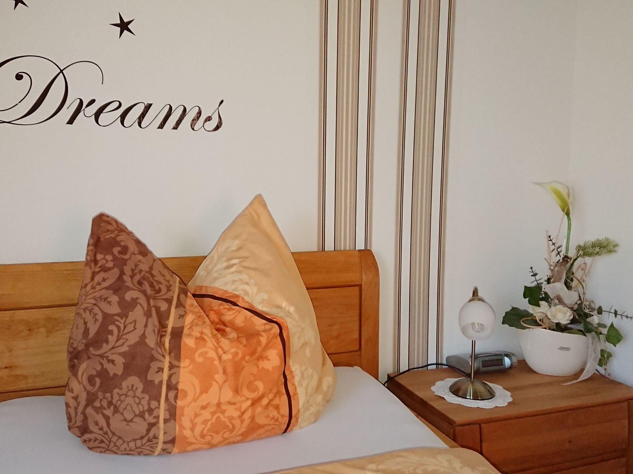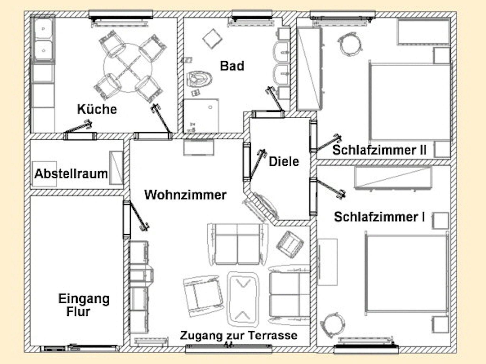 The holiday flat type Norderney is furnished for up to 4 adults. Peace and relaxation are guaranteed here! The flat has two large bedrooms, each with a double bed and a large wardrobe, and is approx. 70 m² in size and equipped with a modern kitchen including all appliances, such as a ceramic hob, oven, dishwasher, microwave, toaster, coffee machine, fridge and crockery. The living room has direct access to the covered terrace (with garden view). Telephone, digital satellite TV (LED flat screen incl. Sky TV) and free and unlimited internet access are standard in the flat. The bathroom has two washbasins, a walk-in shower and a WC.