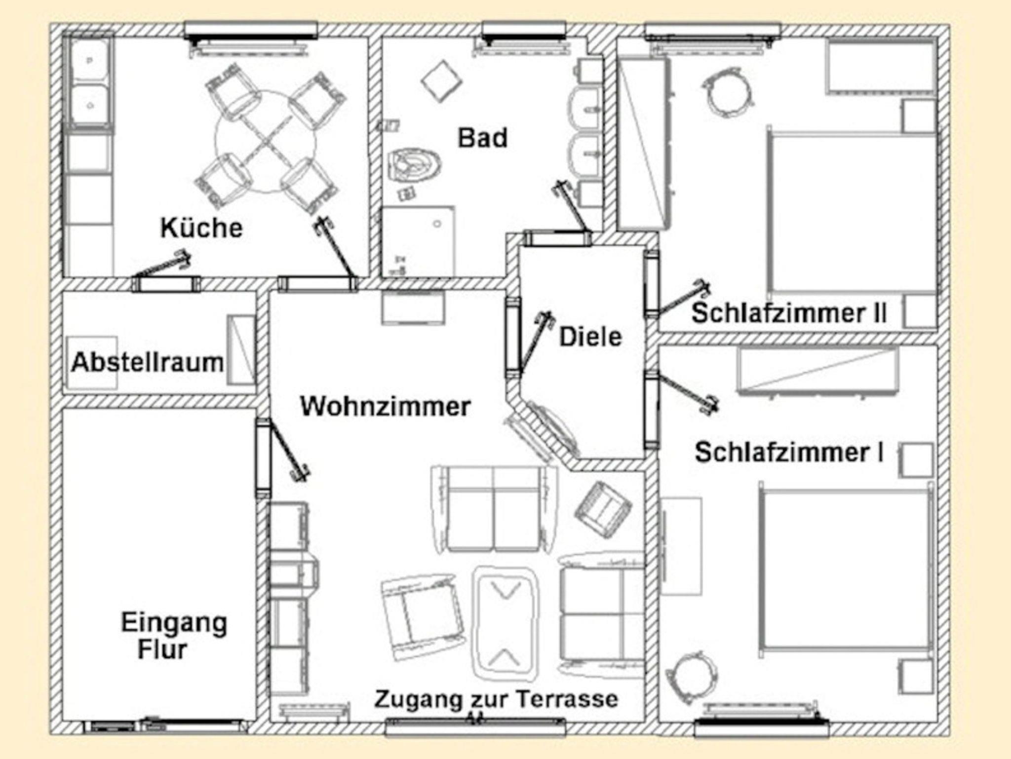 Wohnung ist ausgestattet mit zwei großzügigen Schlafzimmern mit jeweils einem Doppelbett ( 1 x mit Doppelbett 200 x 200 cm und 1 x mit Doppelbett 180 x 200 cm ), einer Küche inkl. allem was Sie zum
