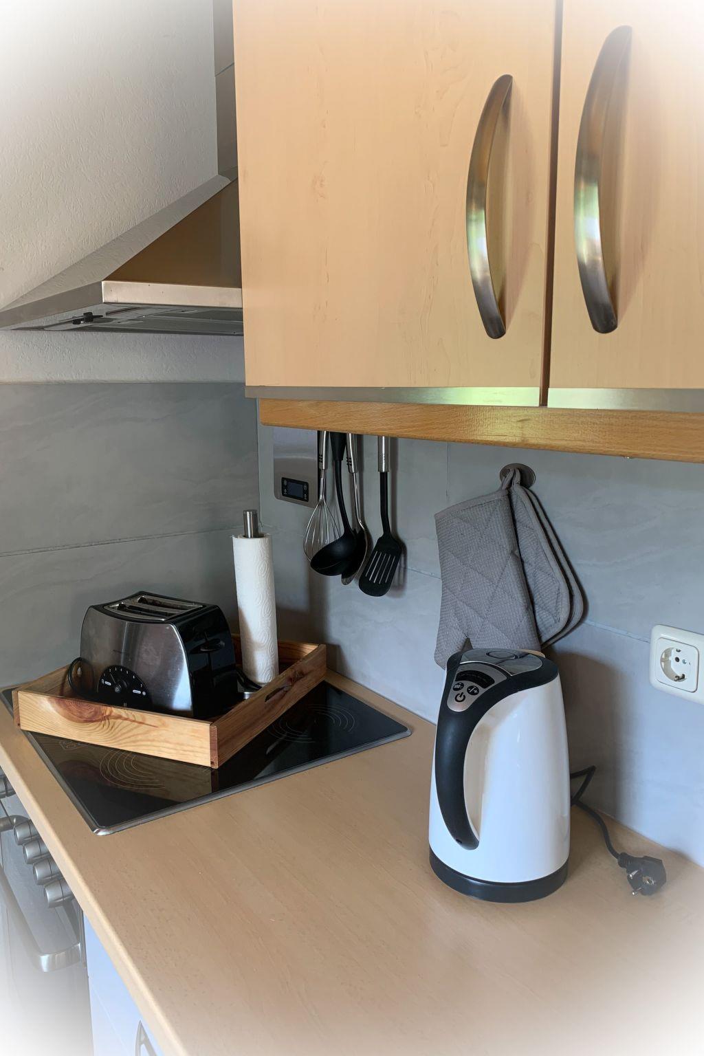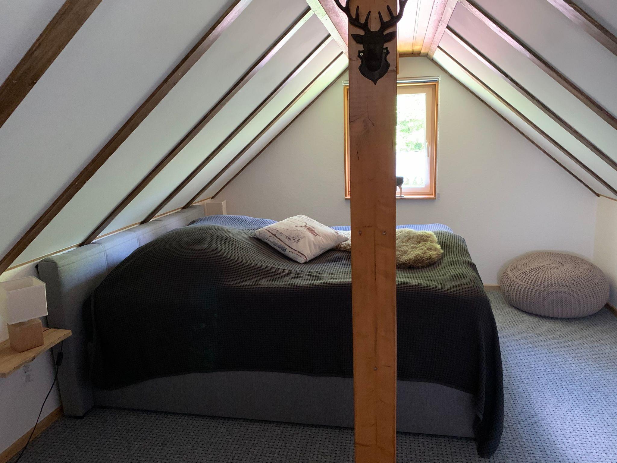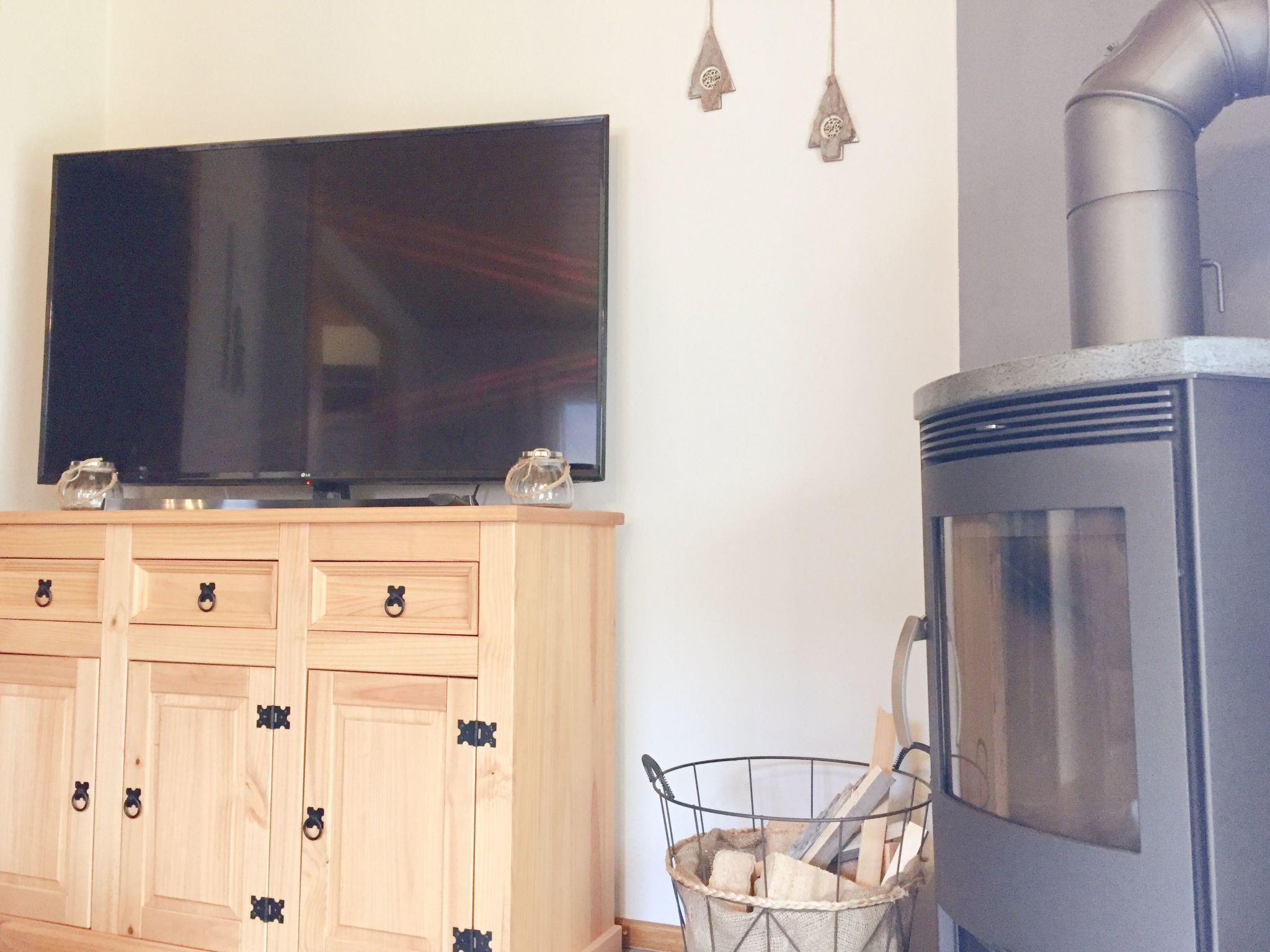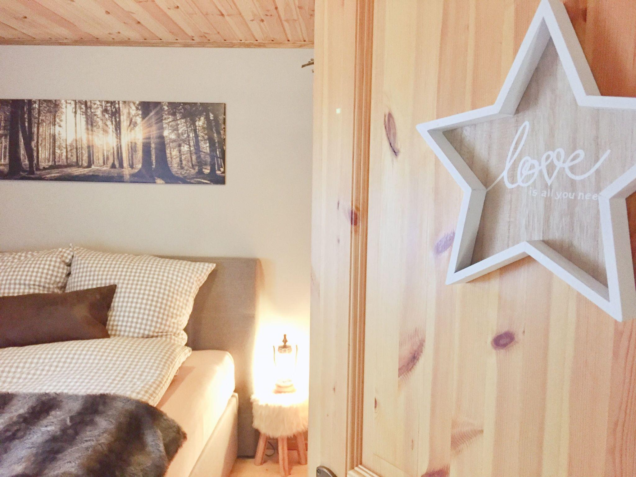 A special highlight is our infrared sauna in our own sauna house. Soothing warmth and deeply relaxing radiation are just the thing after an eventful day! Afterwards, relax in our integrated relaxation area and let your mind wander. But nothing beats a good night's sleep! On the ground floor you will find our small bedroom with a box-spring double bed, which ensures optimum sleeping comfort. Because only those who sleep well can face the next day with new energy. In bedroom no. 2, which is spread over the entire upper floor, you will also find a box-spring bed for two people as well as a single bed and a solid baby cot. If you are our guest in winter, you will certainly love our fireplace in the open-plan living area. It spreads a cosy warmth that makes you feel at home, especially on cold and uncomfortable days. The flickering flames in the fireplace and the moving flames will calm your body and mind. Relaxation is guaranteed! The open-plan living area with cosy seating and a Smart TV is integrated into our very well-equipped kitchen with a rustic bench and a wooden table where you can enjoy hearty meals together.