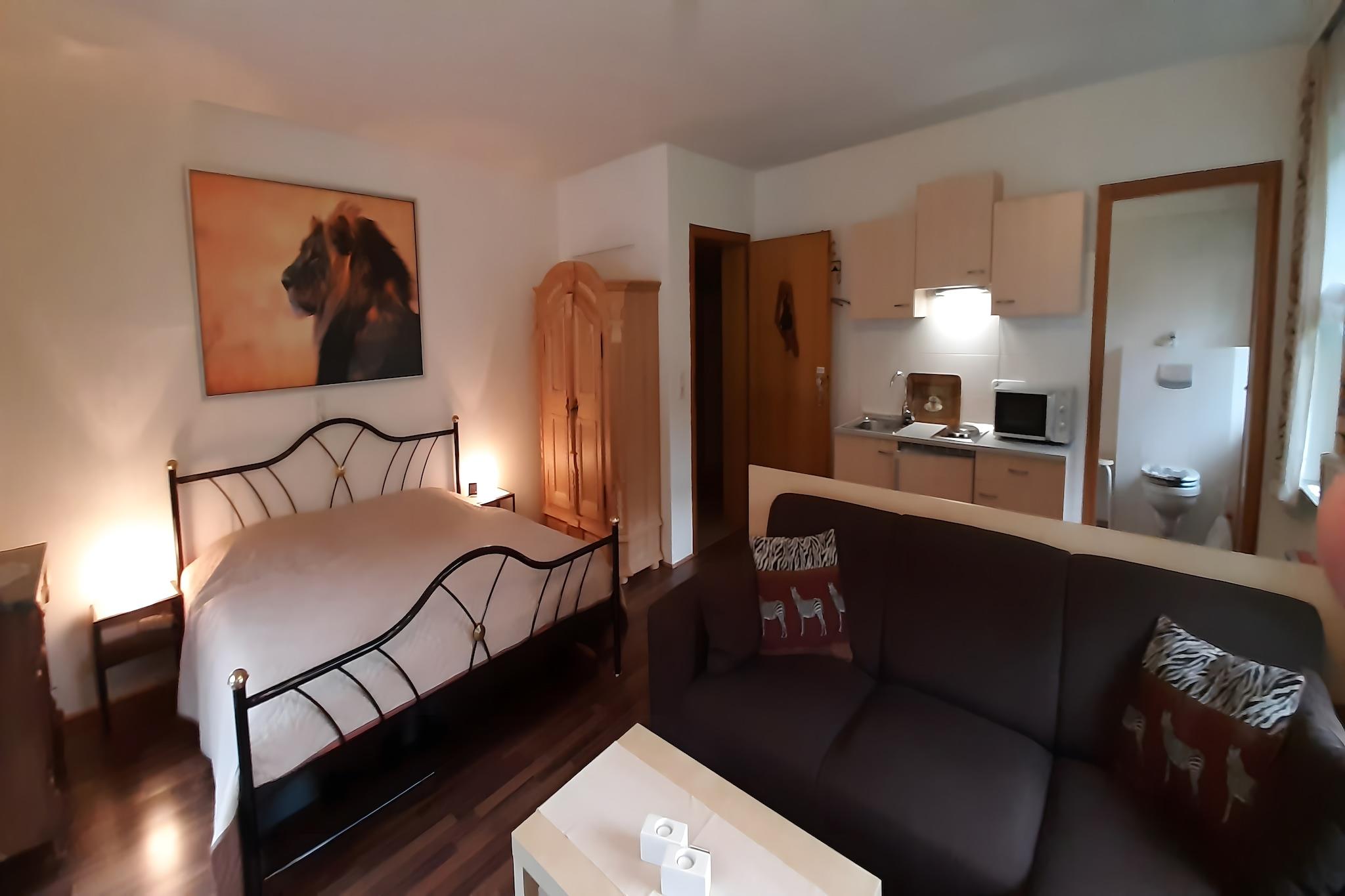 Denne kæledyrsvenlige studiolejlighed i Wildemann tilbyder et hyggeligt og bekvemt ophold kun 100 meter fra byens centrum og skov. Perfekt til par eller solorejsende, det er en ideel base for at udforske Harzen-regionens rige historie og naturlige skønhed. Nærliggende attraktioner omfatter 19-Lachter-Stollen-minen, det kejserlige palads i Goslar og Gustav Adolfs stavkirke i Hahnenklee. For naturskønne vandreture er klippeformationerne Feigenbaumklippe og Treppenstein et must-besøg. Lejligheden har en lys stue/soveværelse med dobbeltseng, fladskærms-tv med kabelkanaler, spisebord og opholdsområde. Det åbne køkken er udstyret med kaffemaskine, mikroovn, køleskab og 2-koger - ideel til at tilberede enkle måltider. Et privat badeværelse med bruser, centralvarme og parkering på stedet sikrer komfort og praktisk gennem hele dit ophold. Omgivet af skovstier og kun 7 km fra skiløjperne, er beliggenheden perfekt til udendørs eventyr året rundt. Spisemuligheder i nærheden omfatter det hjertelige Harzer Speisekammer, den indbydende Cafe am Bohlweg Georgiew og den italiensk-inspirerede Piccolo Mondo Hahnenklee.