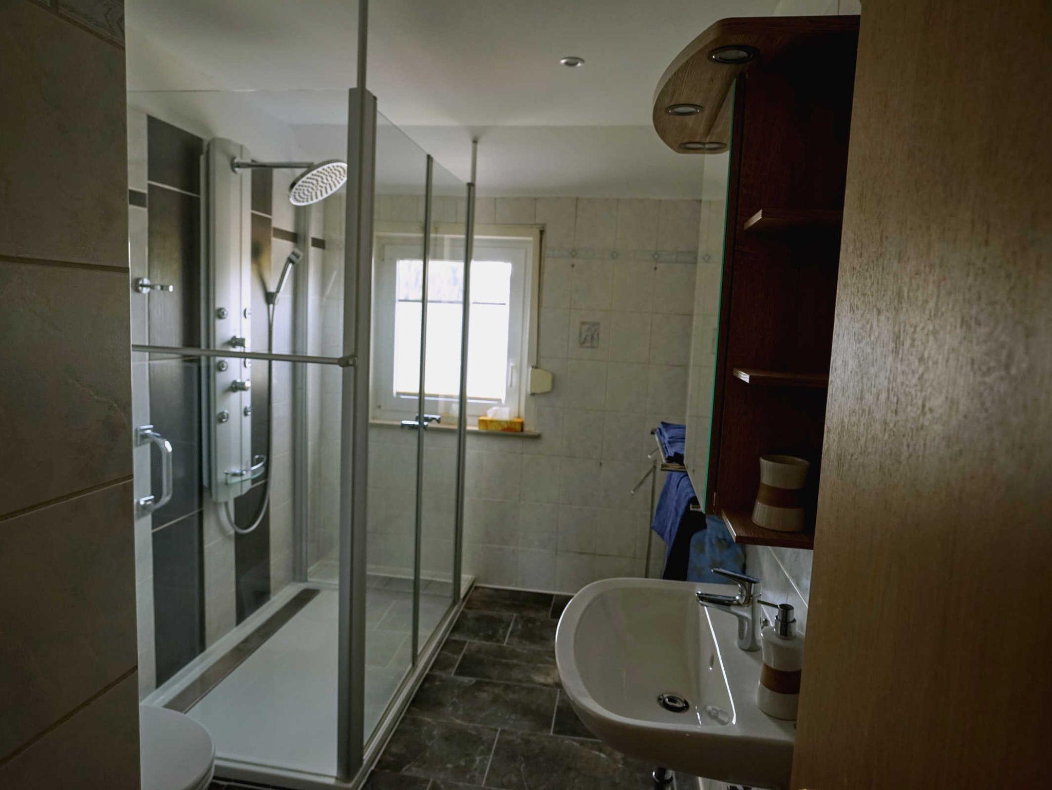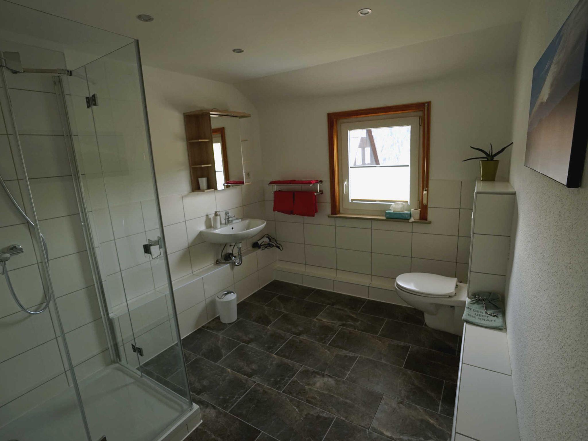 Die Ferienwohnung liegt im ersten Stock. Sie bietet neben drei individuell gestalteten Schlafzimmern zwei moderne Badezimmer, die jeweils mit Waschbecken, Dusche und WC ausgestattet sind.