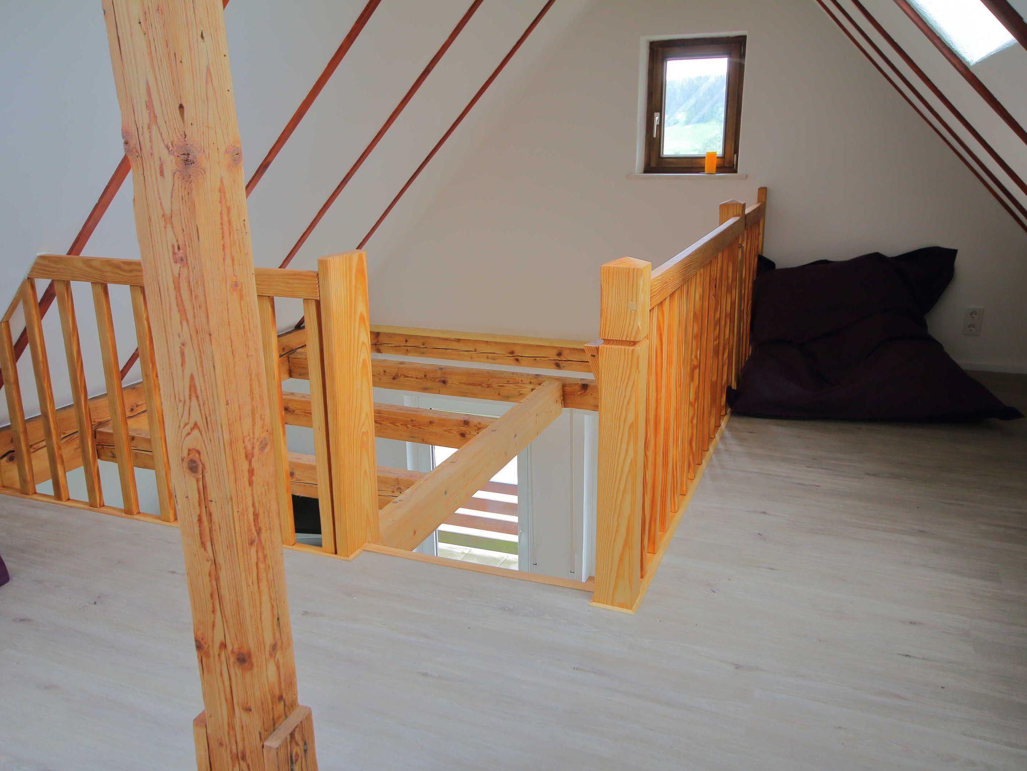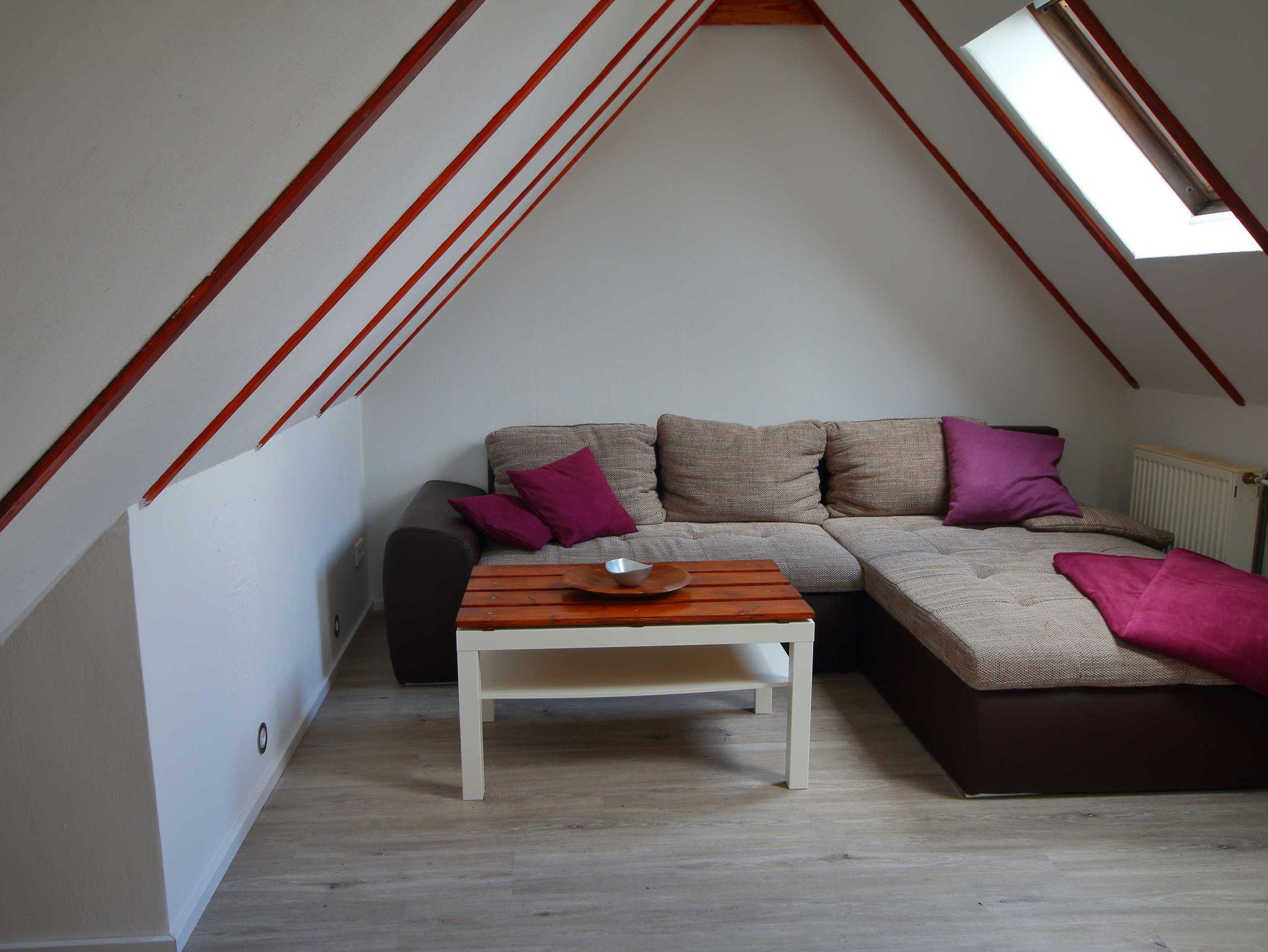 Gesellige Abende könnt ihr im offen gestalteten Wohnzimmer verbringen. Hier sind zwei gemütliche Sitzecken vorhanden. Eine mit Fernseher im unteren Bereich und über die Holztreppe kommt ihr ins Giebelzimmer.