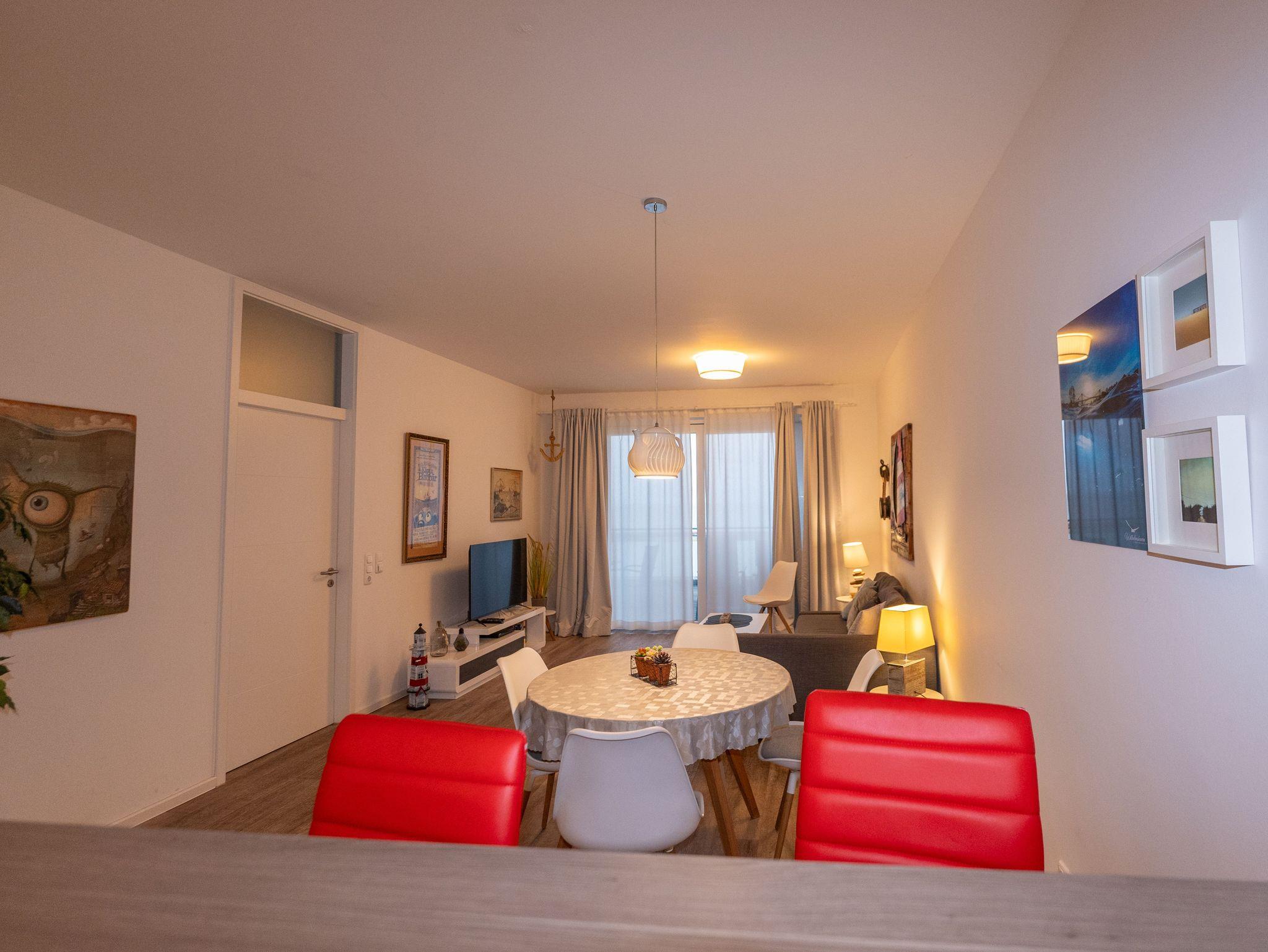 Nach dem Betreten der Wohnung in der 1.Etage gelangt man durch einen Flur in den großzügigen Wohn- und Essbereich, der gemütlich, stilvoll eingerichtet und lichtdurchflutet ist. Die moderne Küche mit einem Esstresen ist umfangreich ausgestattet. Ein Esstisch mit vier Stühlen lädt zum Essen, Spielen oder Arbeiten ein.