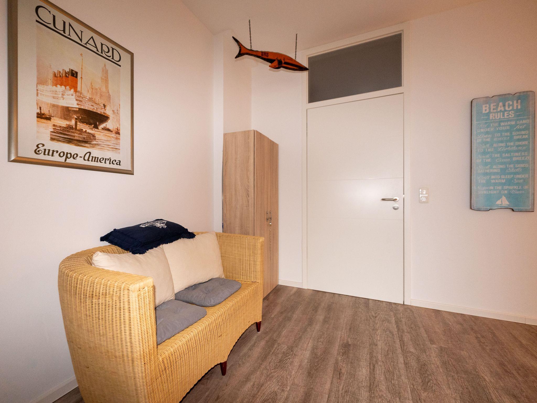Das Sofa kann zu einer zusätzlichen Schlafgelegenheit umgebaut werden. Im Schlafzimmer befindet ein großes Doppelbett und ein Kleiderschrank. Vom Wohn- und Schlafzimmer gelangen Sie auf den Balkon mit Blick auf die Nordsee bis hin zum Leuchtturm Arngast.