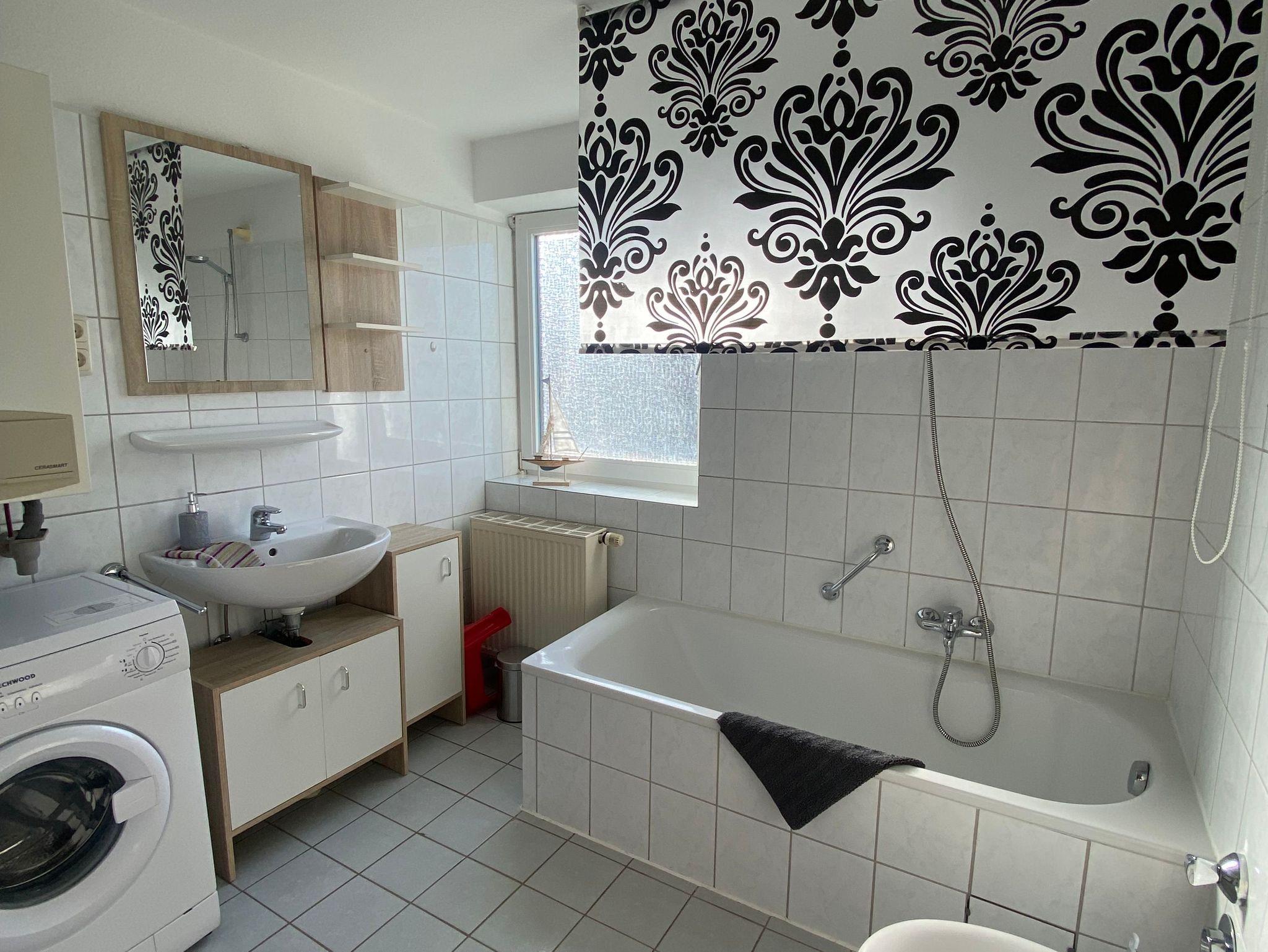 Das Bad ist ausgestattet mit einem Wannenbad, welches schnell zur Dusche umfunktioniert werden kann.