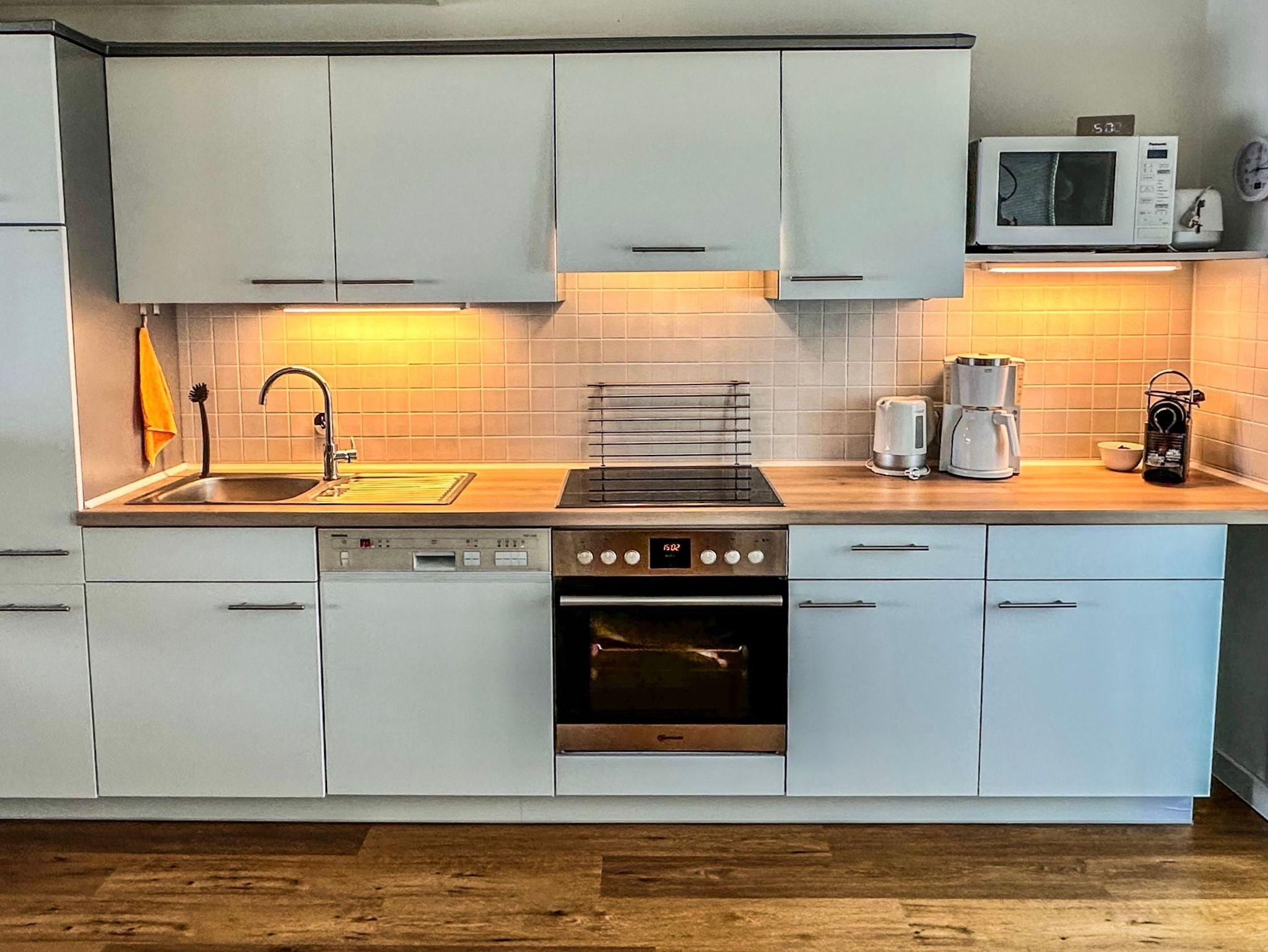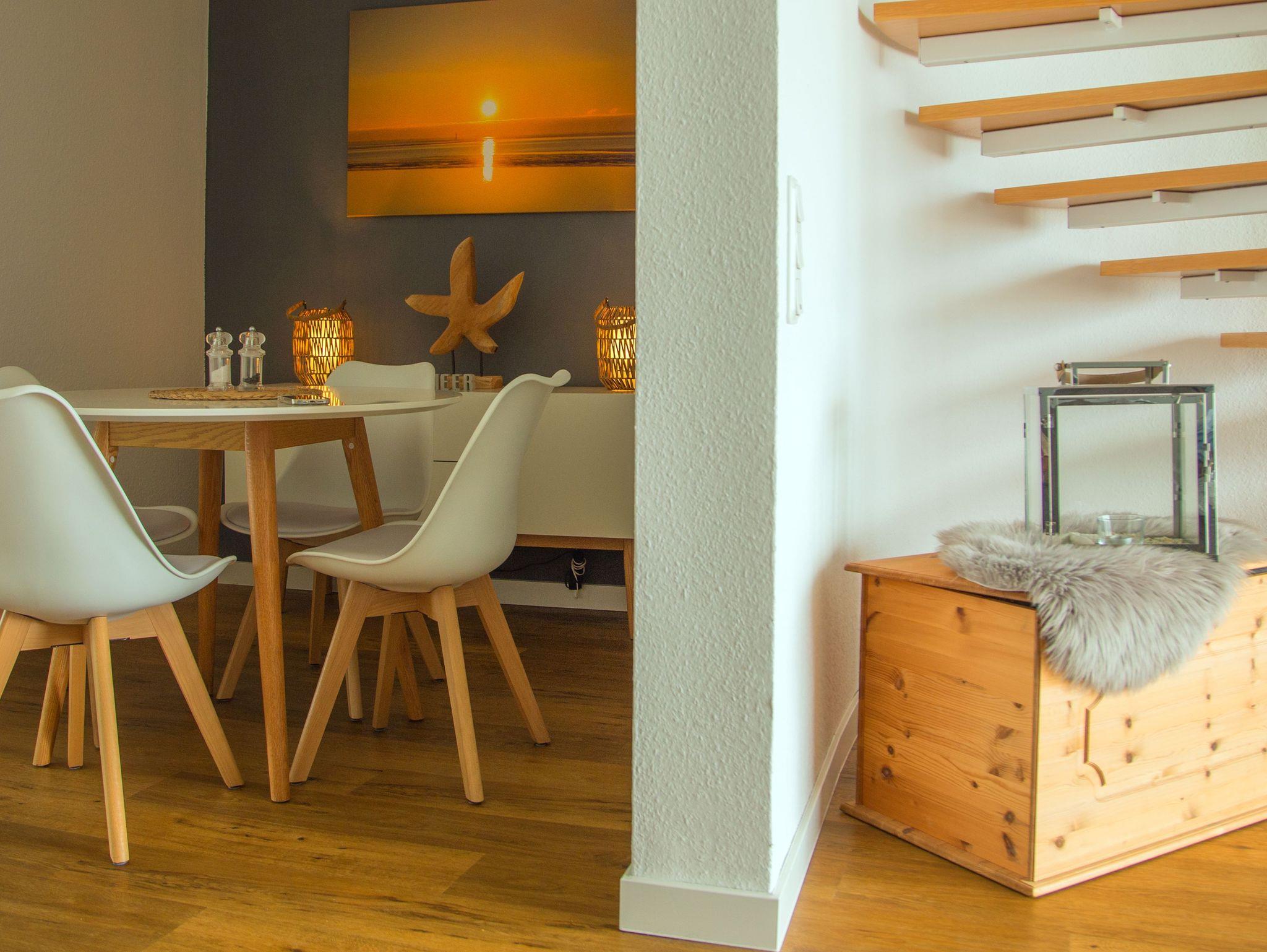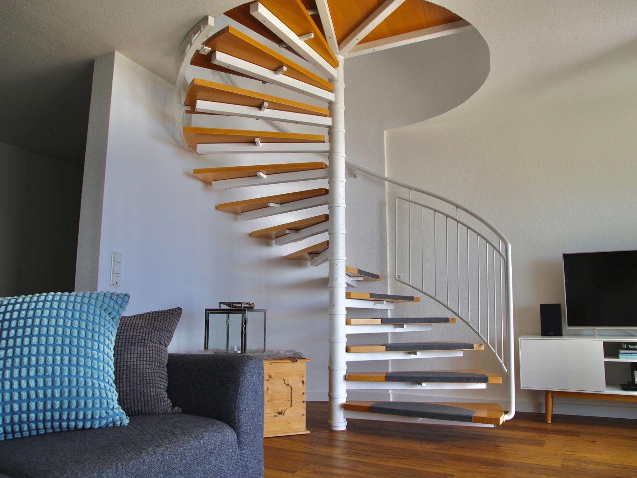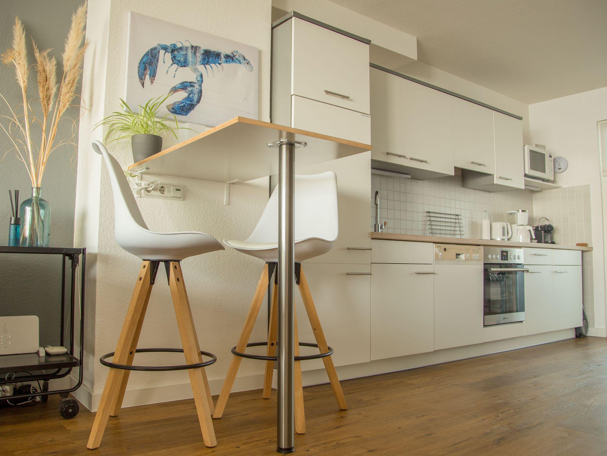 Die 80qm große Ferienwohnung ist für maximal 3 Personen ausgelegt. Aufgrund der offenen Wendeltreppe ist die Wohnung für Kleinkinder nicht geeignet. Sie verfügt über einen großen, offenen Wohn- und Kochbereich, zwei Schlafzimmer, einem Bad und einem Flur. Die Küche ist umfangreich ausgestattet. Über eine Nespresso- und Kaffeemaschine, einer Mikrowelle, einem Wasserkocher, dem Ceranfeld-Herd mit Backofen, einem Geschirrspüler bis hin zum Kühlschrank mit Eisfach ist alles vorhanden. Ein moderner Fernseher, ein DVD/BlueRay-Player laden zum Verweilen auf dem Sofa ein. Das Schlafzimmer verfügt über ein großes Boxspringbett und TV, das zweite Schlafzimmer ist mit einer komfortablen Schlafcouch ausgestattet. Wir bieten den Gästen kostenlosen WLAN an.