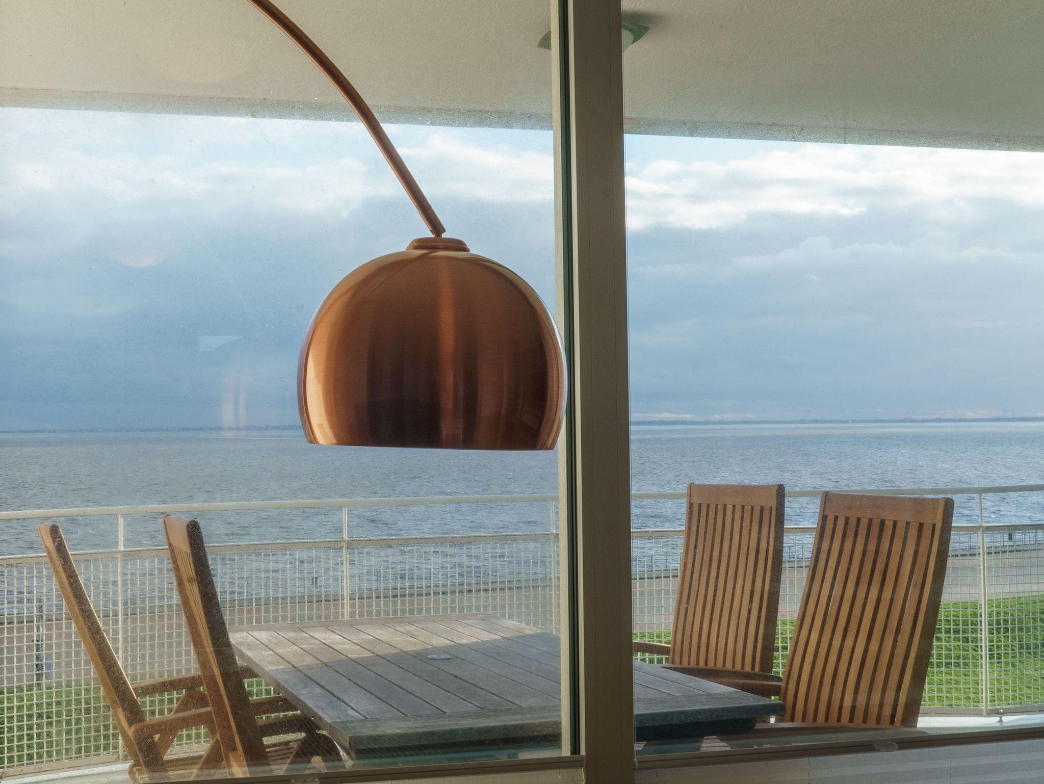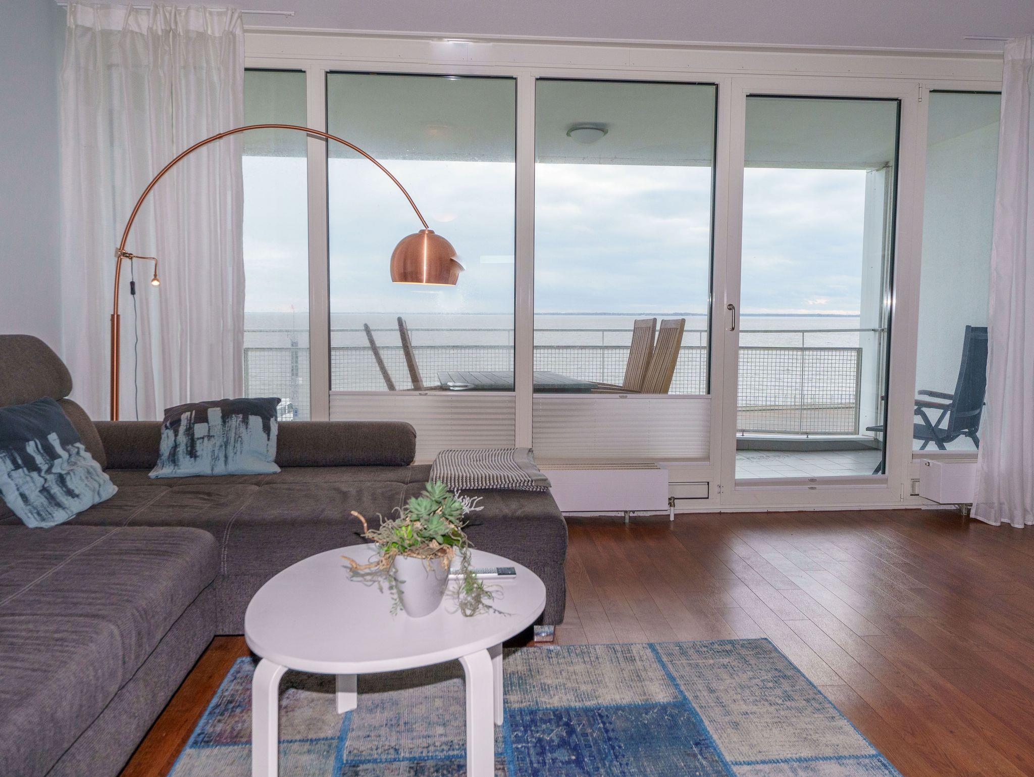 Diese große Ferienwohnung ist für maximal vier Personen ausgelegt. Sie verfügt über einen großen, offenen Wohn-, und Kochbereich, zwei Schlafzimmer, einem Bad und einem Flur. Die Küche ist umfangreich ausgestattet. Über den Geschirrspüler, einer Kaffemaschine für die Kaffeezubereitung, einer Mikrowelle, einem Wasserkocher, dem Ceranfeld-Herd mit Backofen bis hin zum Kühlschrank mit Eisfach ist alles vorhanden. Ein moderner Fernseher, ein DVD-Player lädt zum Verweilen auf dem Sofa ein. Das Schlafzimmer verfügt über ein großes Doppelbett, das zweite Schlafzimmer ist kleiner und mit einem Etagenbett ausgestattet. Beide Schlafzimmer bieten ebenfalls den grandiosen Blick auf die Nordsee. Diese Wohnung bietet den Gästen WLAN an.