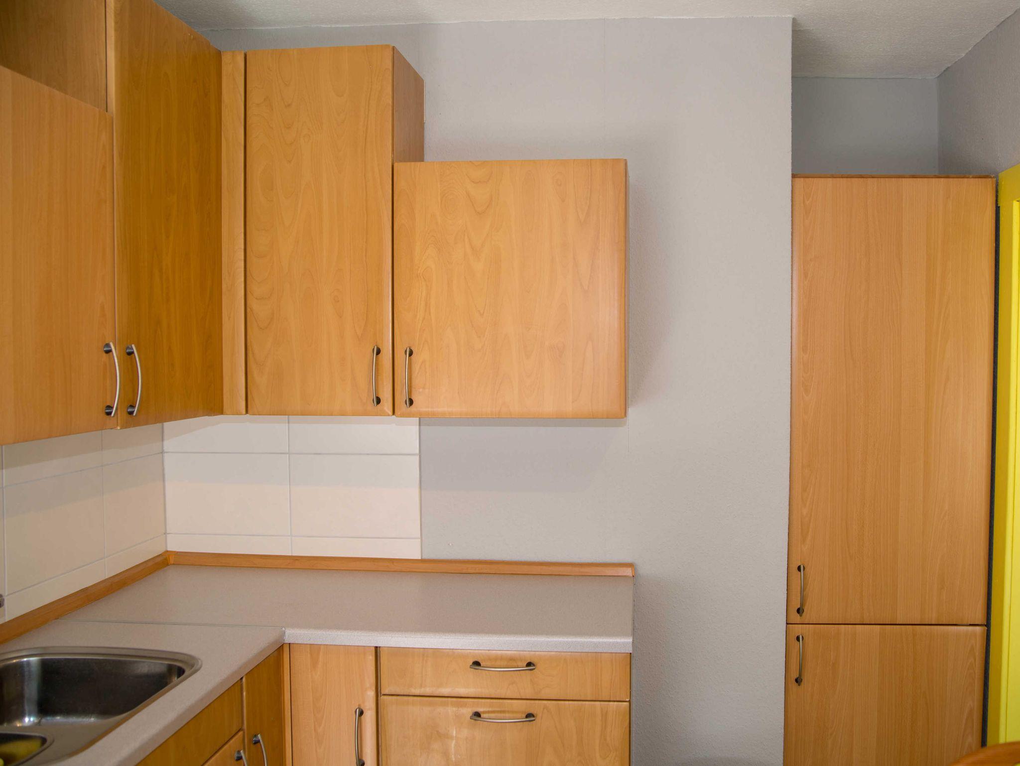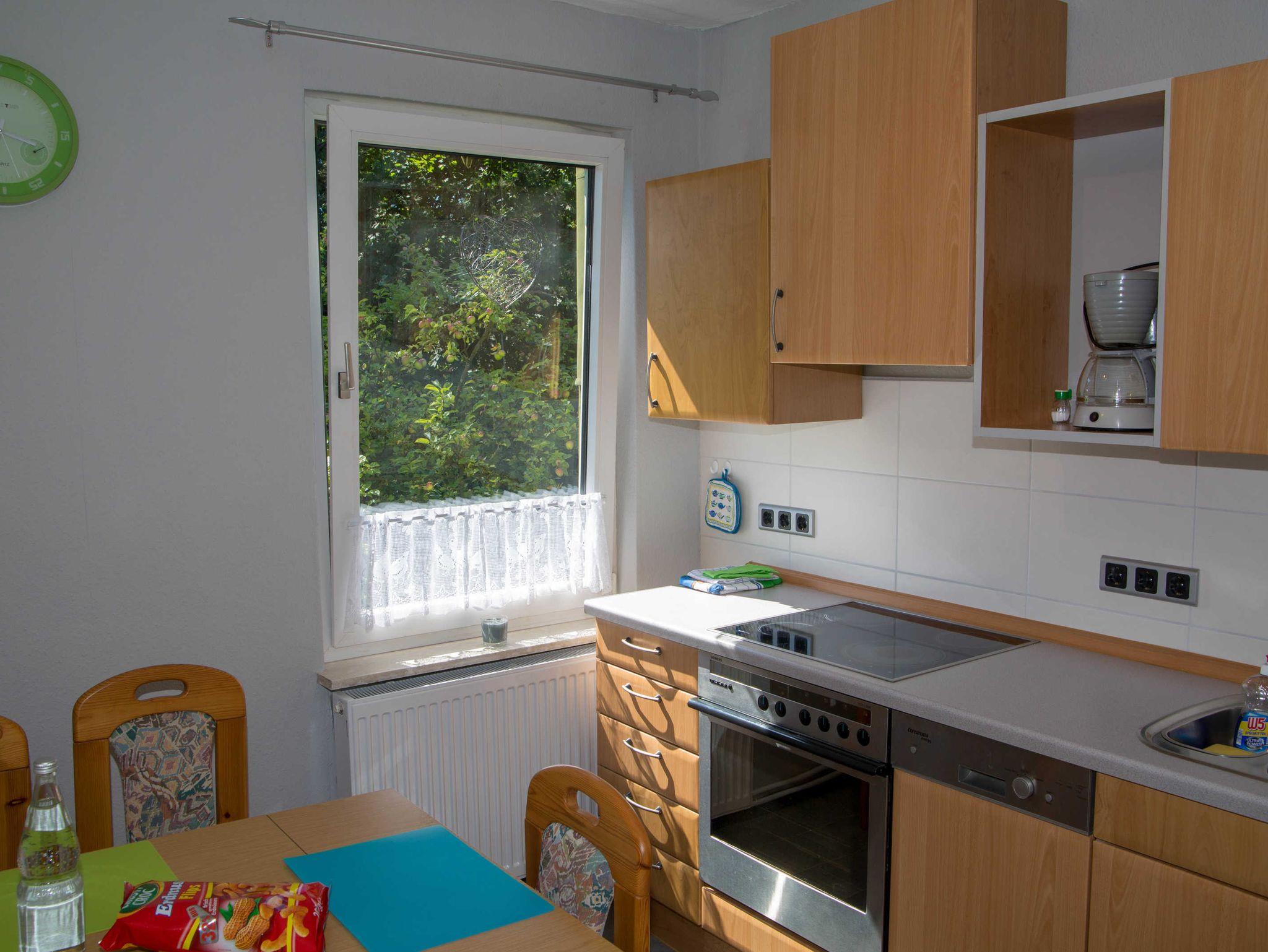 In der Küche steht ein Esstisch, der Platz zum Essen bietet. Spüle, Geschirrspüler, Kombikühlschrank und Arbeitsplatte statten die Küche aus. Ein Elektroherd mit Ceranfeld und Backofen bietet Gelegenheit zu kochen. Toaster, Kaffeemaschine, Eierkocher, Wasserkocher und ausreichend Geschirr sind vorhanden. Bügelbrett und Bügeleisen stehen zur Verfügung.