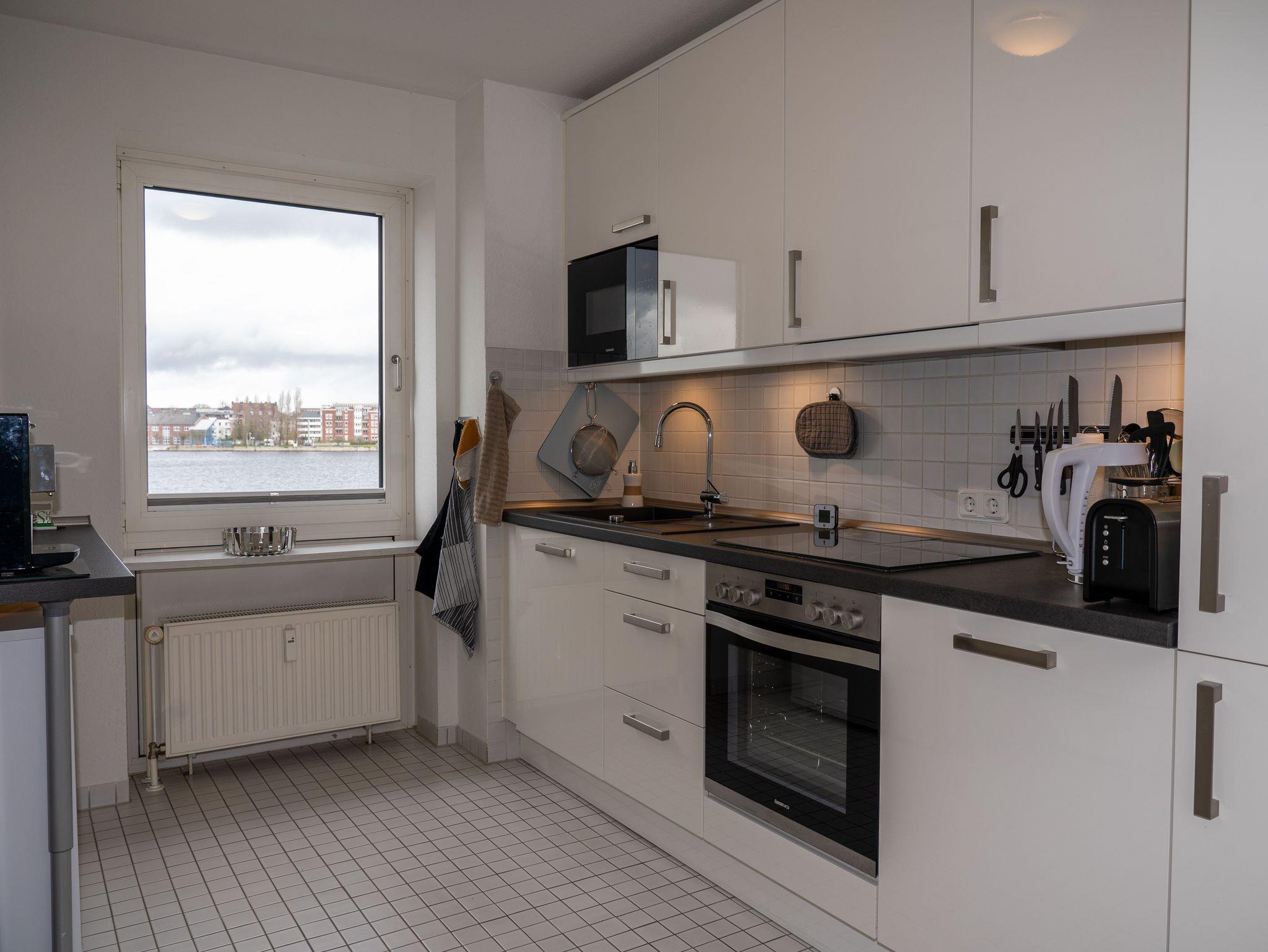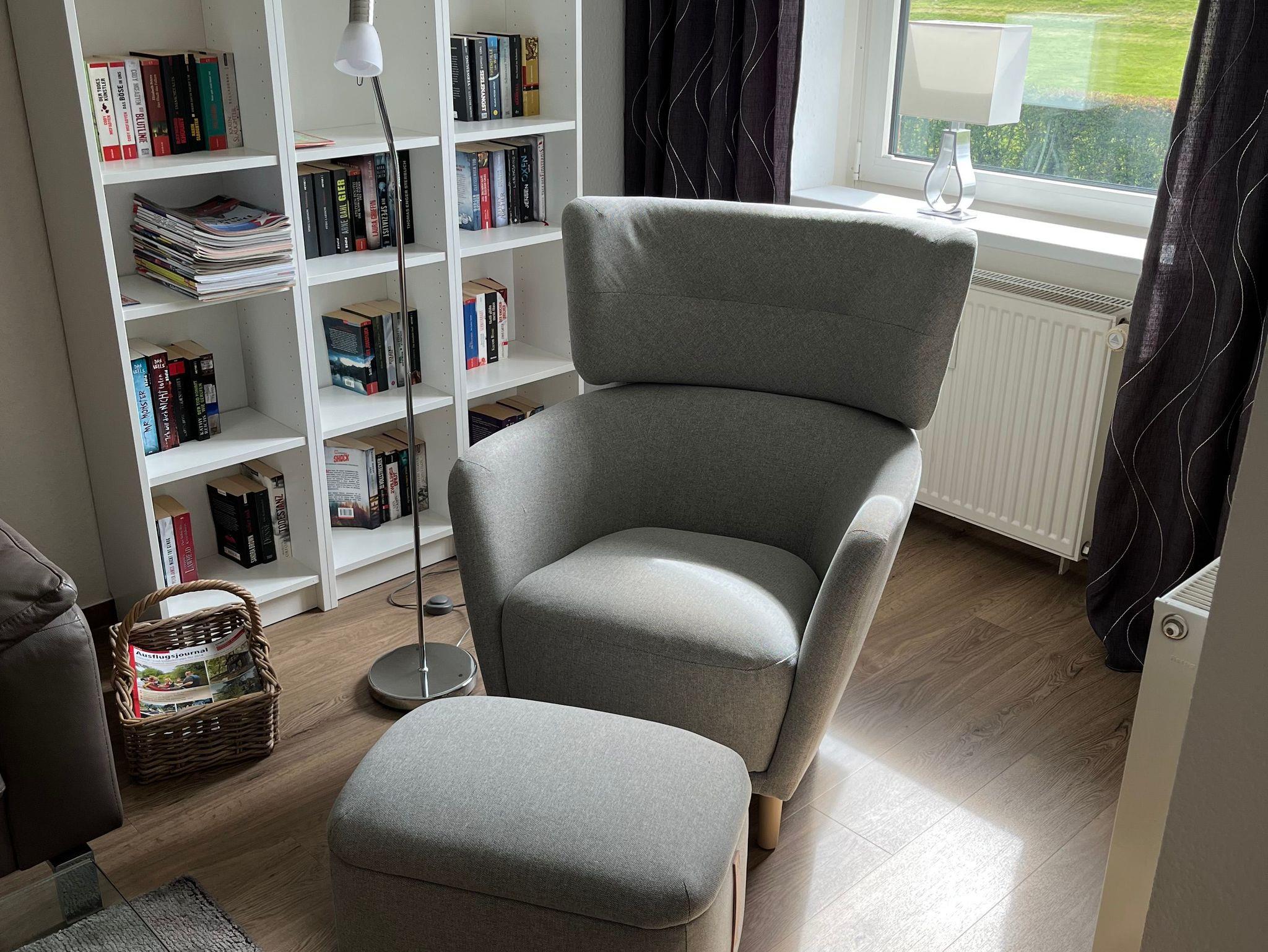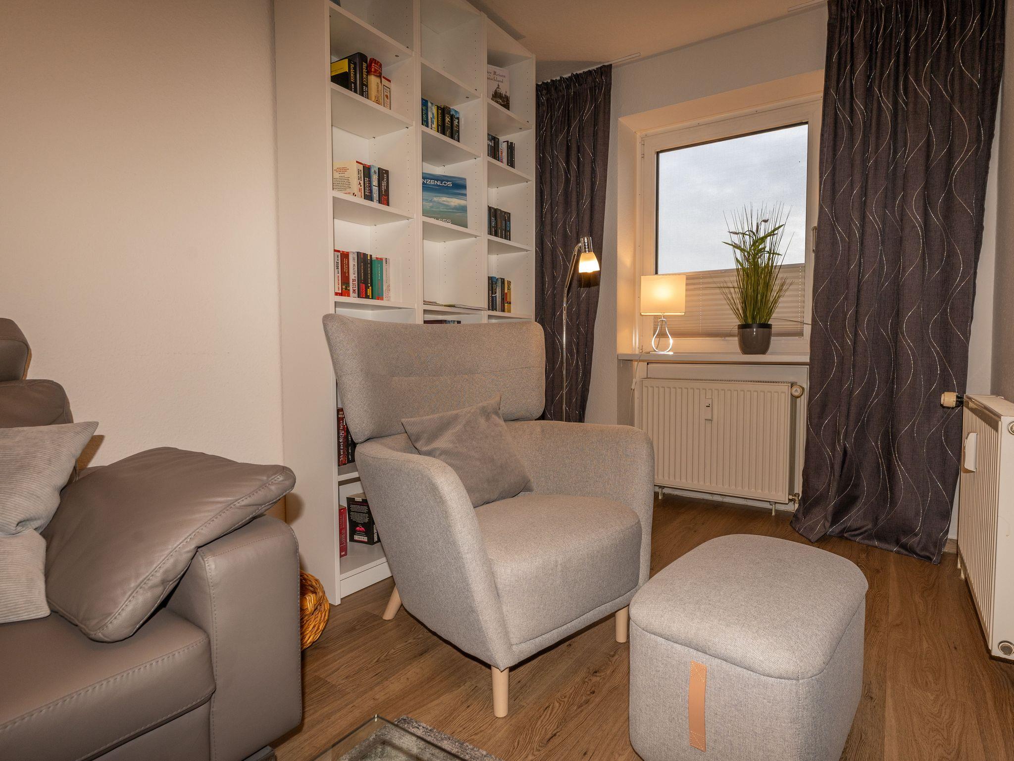 Am Fenster läd ein gemütlicher Lesesessel und eine gut bestückte Bücherwand zum Lesen ein. Die hochwertig ausgestattete Küche lässt kaum einen Wunsch offen.Ein E-Herd mit Backofen, eine Mikrowelle, ein Geschirrspüler, eine Kaffeemaschine sowie eine Senseo-Kaffeemaschine, ein Wasserkocher, ein Toaster und ein Kühlschrank mit Gefriermöglichkeit sowie ein Sodastream bieten die Möglichkeiten kulinarisch zu zaubern.