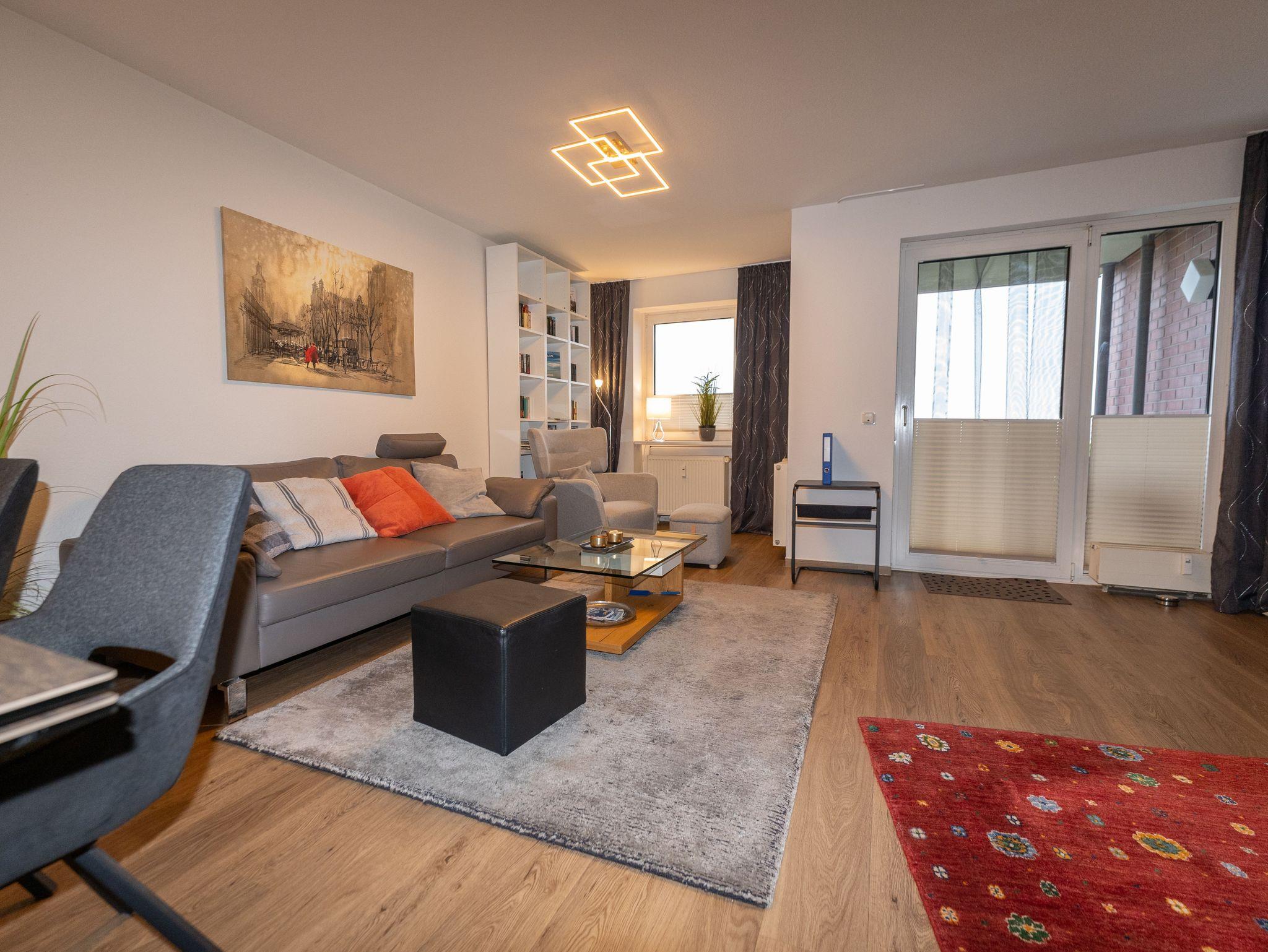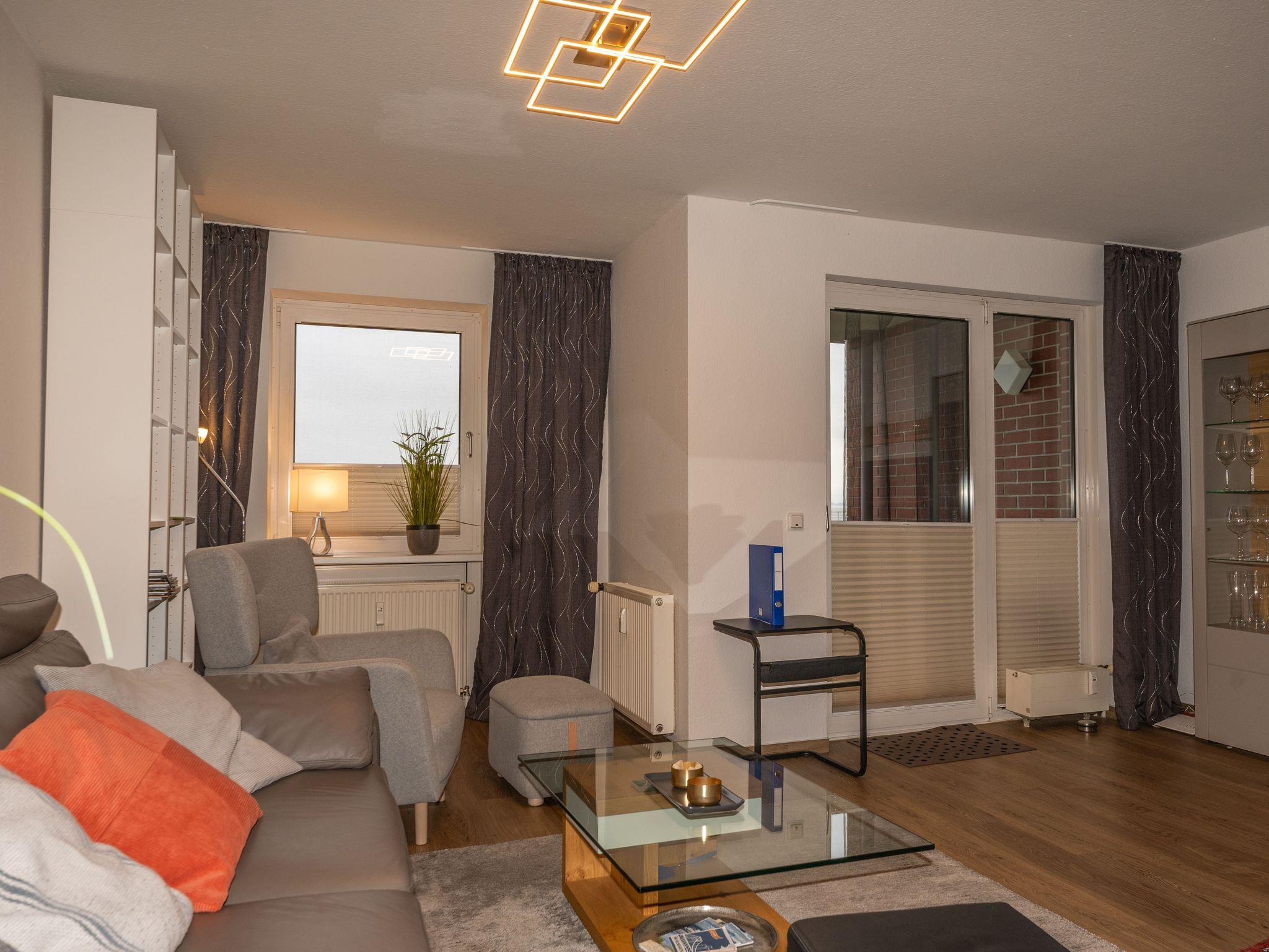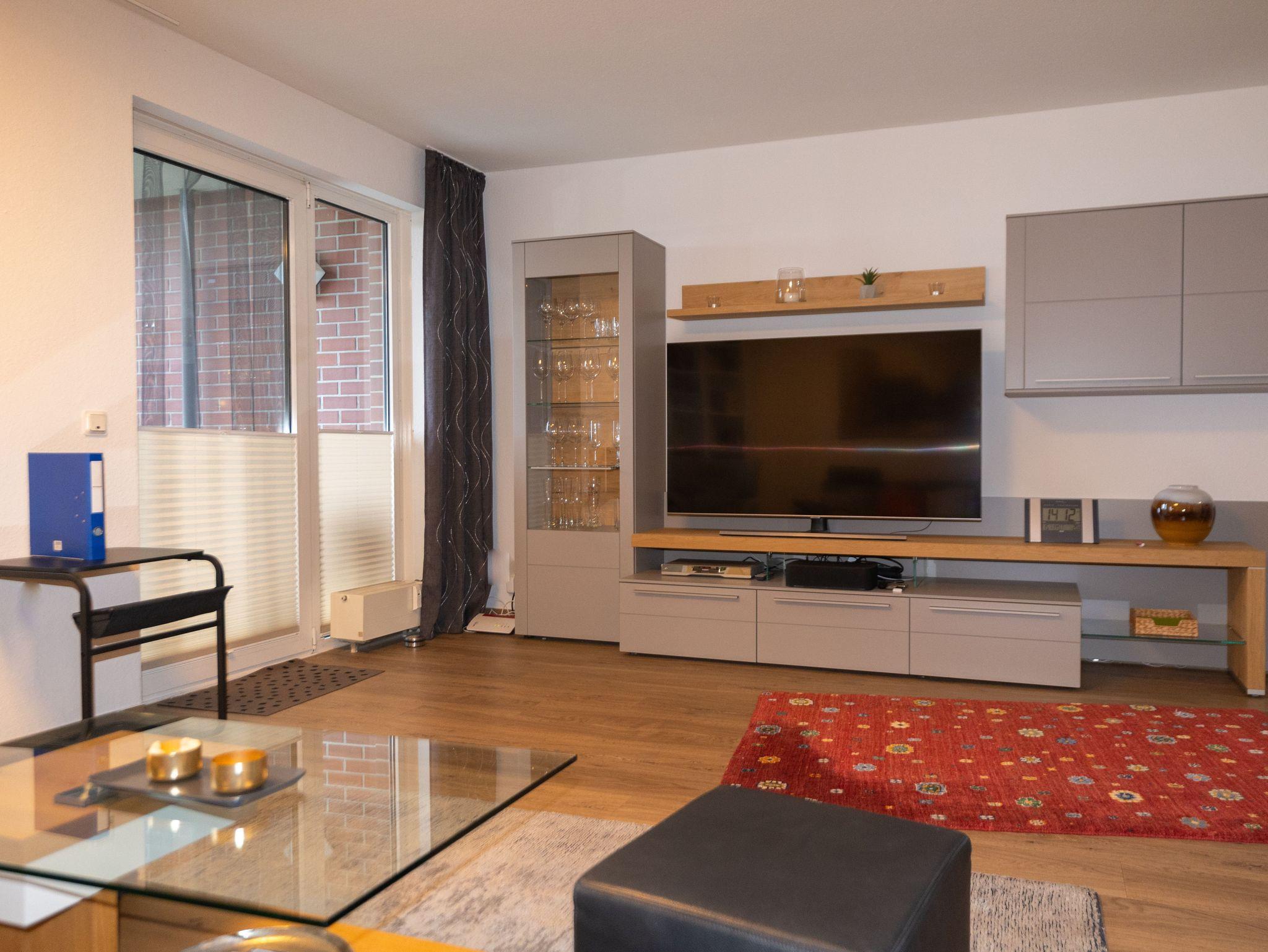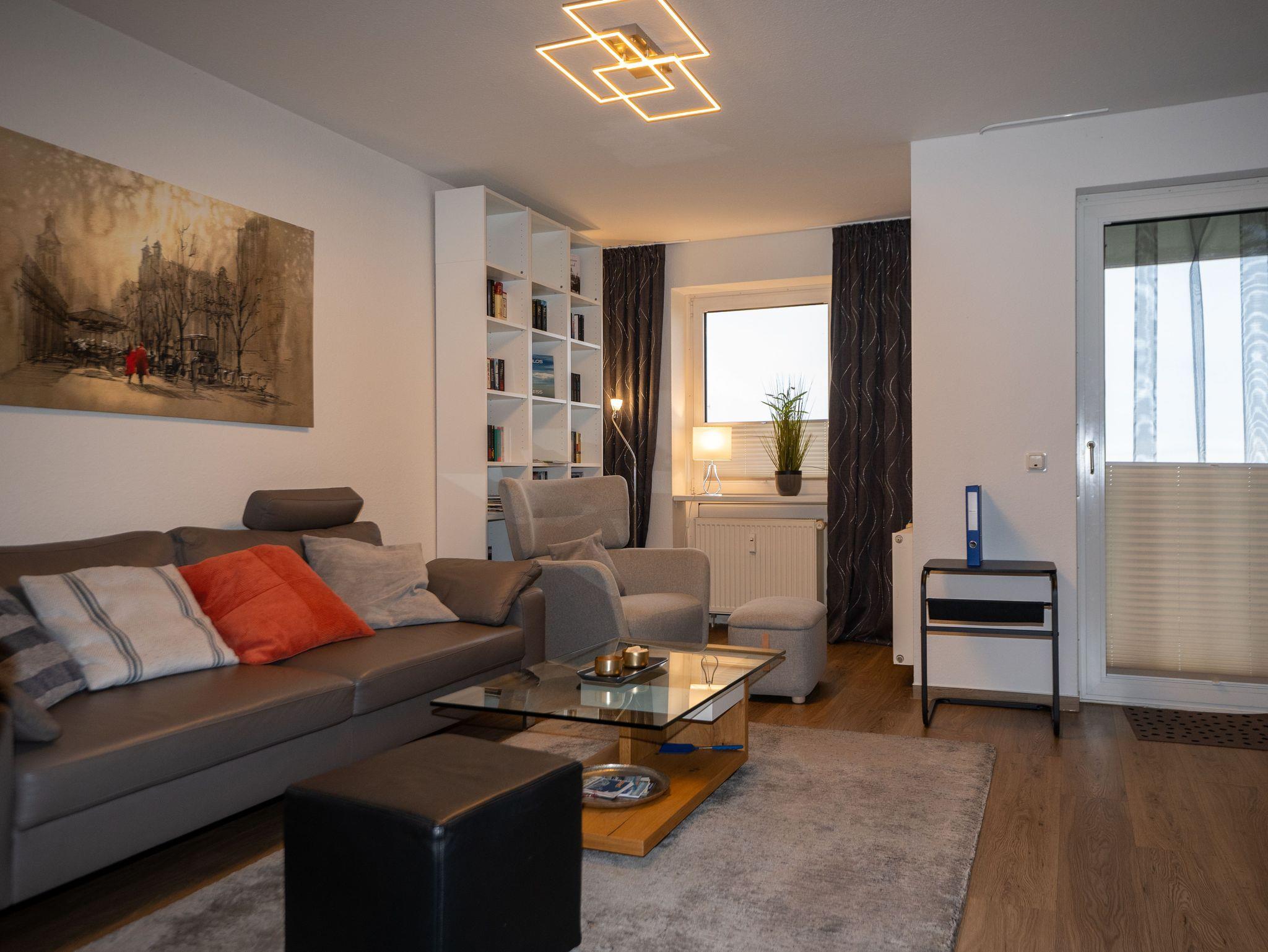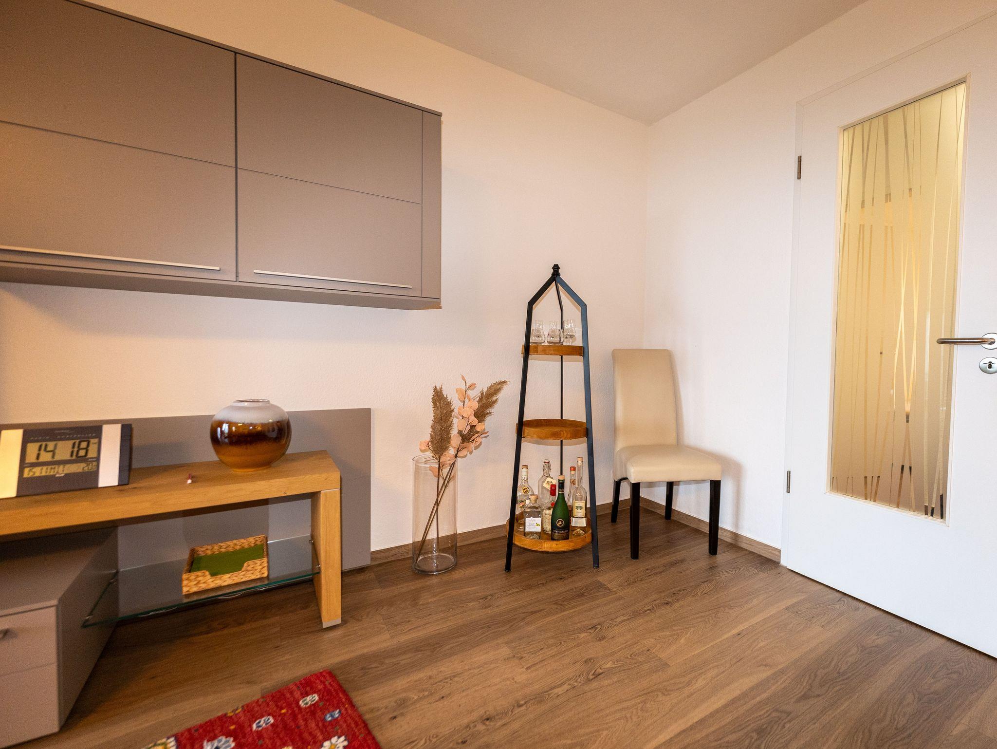 Exklusiv ausgestattete Ferienwohnung auf einer Ebene ohne Treppen mit zwei Schlafzimmern, Wohnzimmer, Küche, Abstellraum, inkl. Pkw-Außen-Stellplatz, Lift, sehr schnellem WLAN und Handtüchern und Bettwäsche.