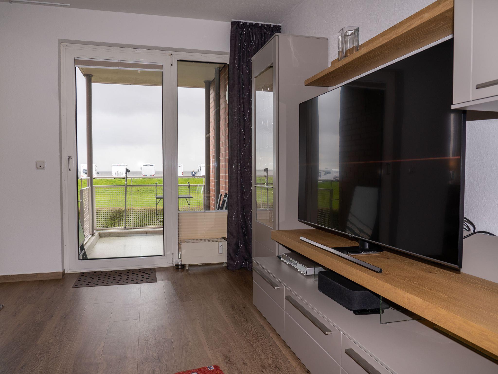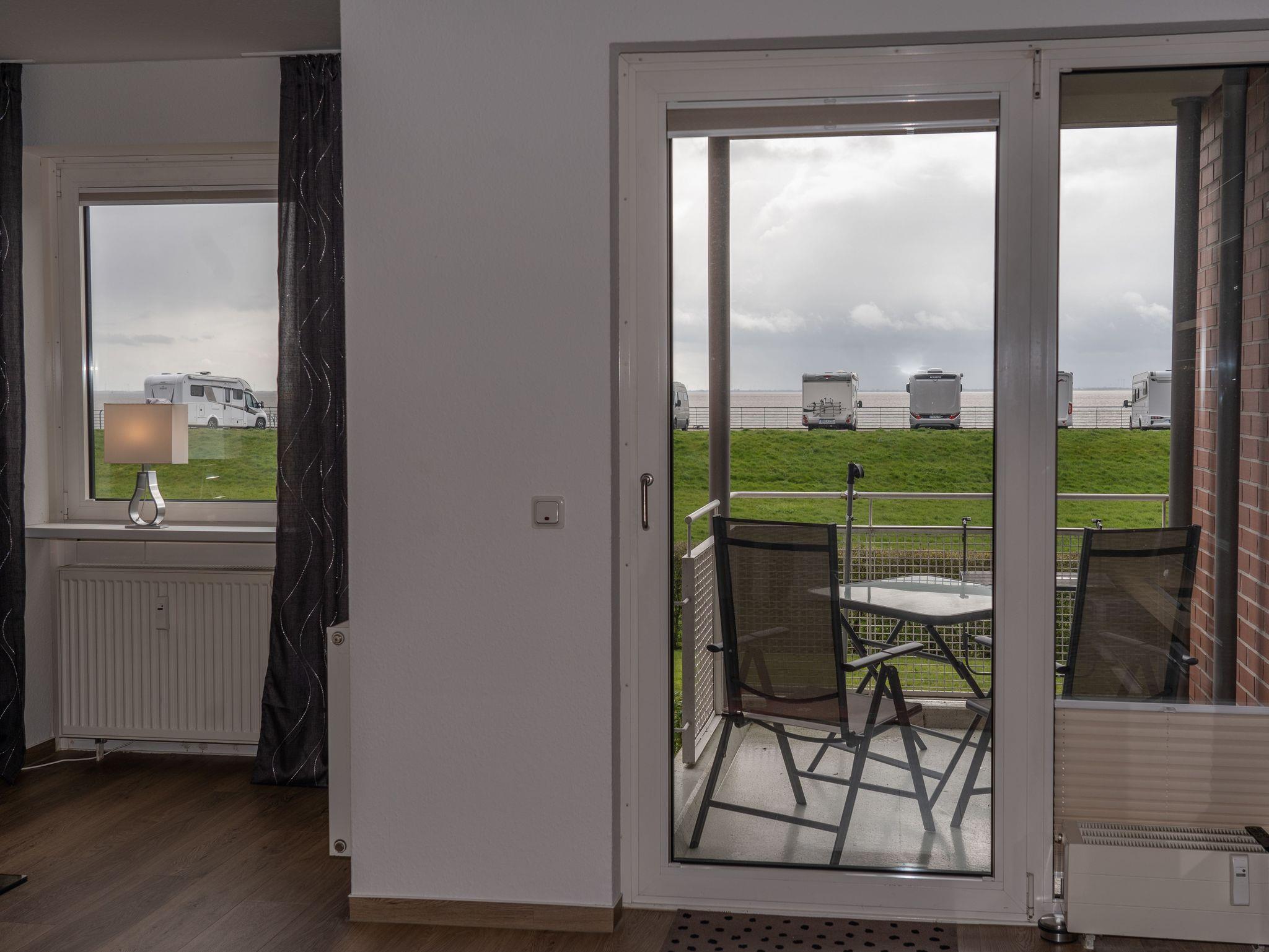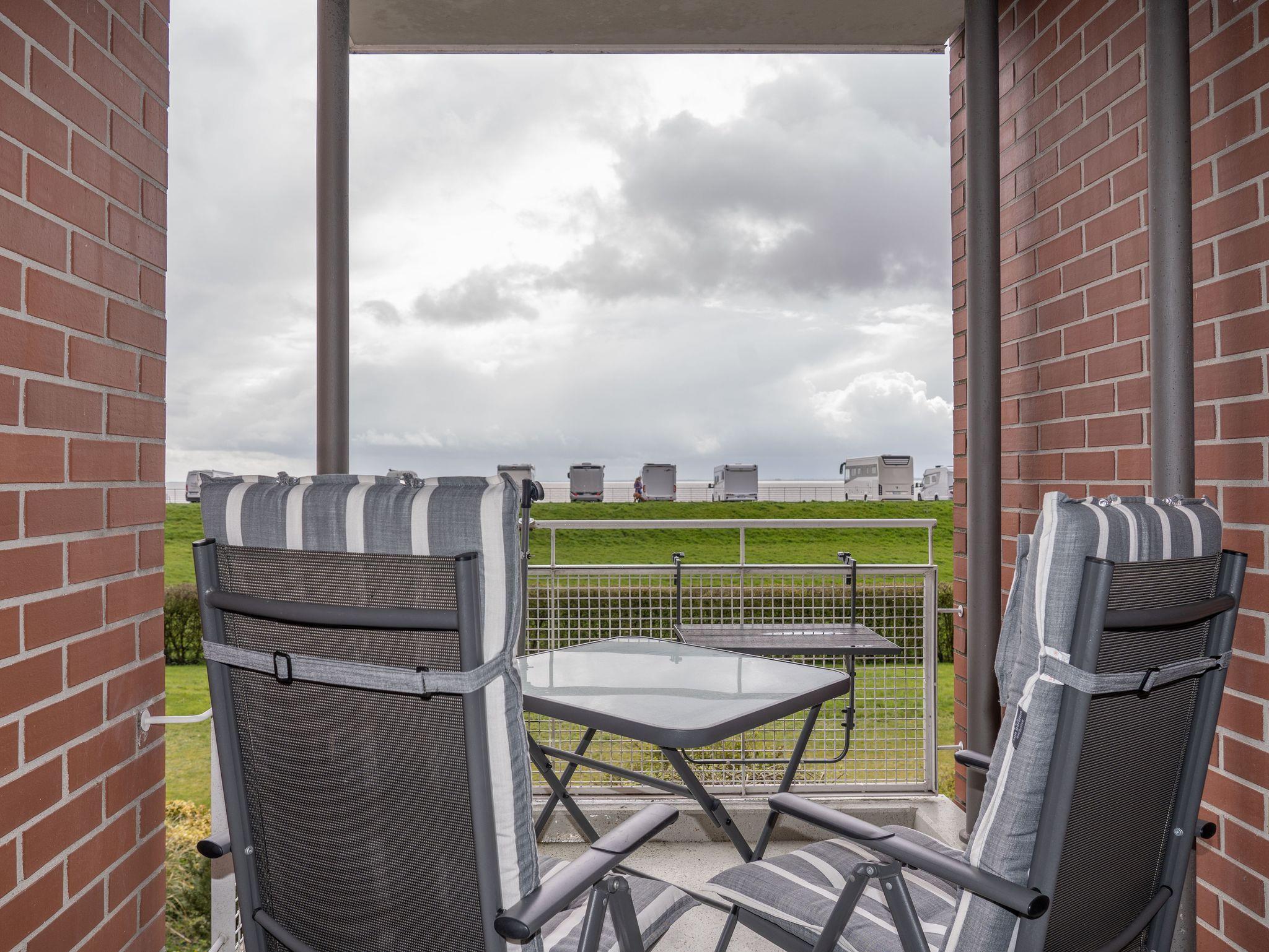 Der Balkon ist gut windgeschützt von drei Seiten. Zwei gemütliche Stühle nebst Tisch laden ein, dass Naturschauspiel Wattenmeer mit seinen wechselnden Gezeiten hautnah zu erleben.