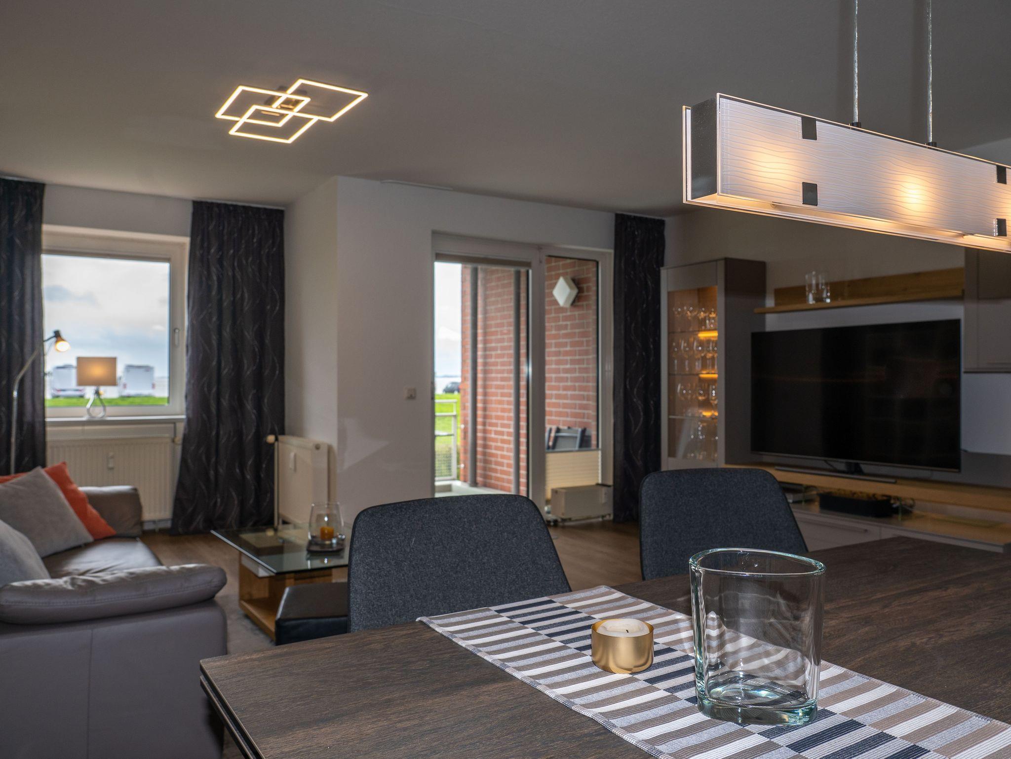 Der stilvoll eingerichtete offene Wohn-, Essbereich ist mit einer gemütlichen Sitzecke und einem Multimedia-Angebot , d.h.Fernseher LCD-TV 65 Zoll, Sky Soundbox, Blueray Player sowie einer 500 MBIT WLAN ausgestattet.