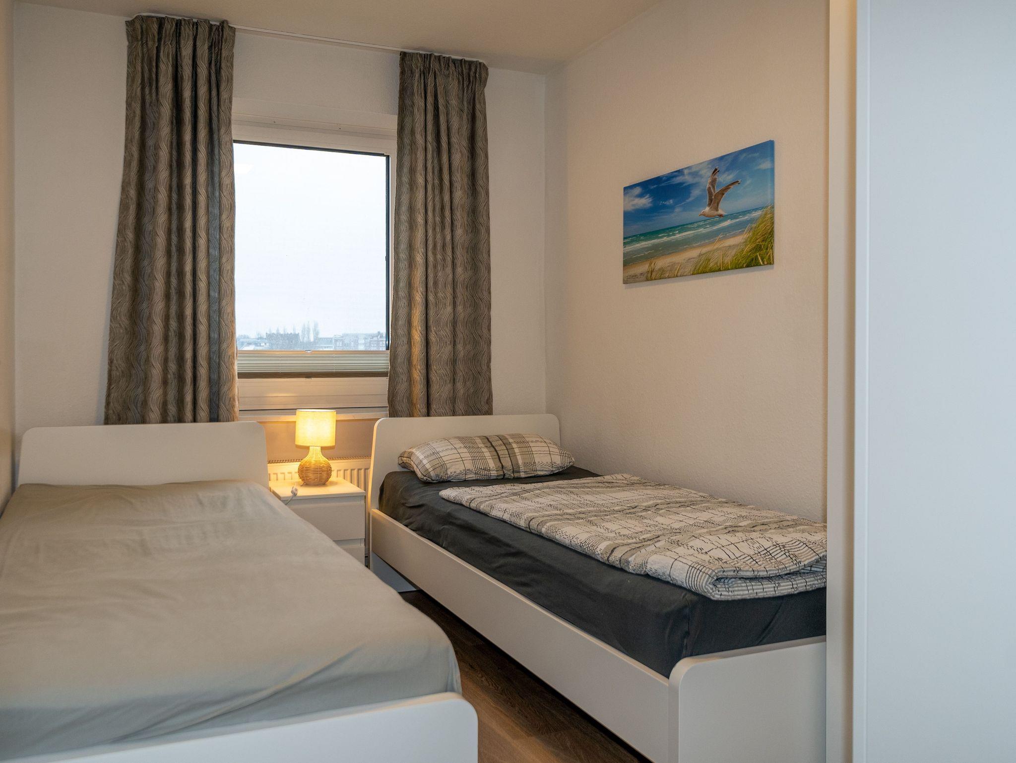 Das schön ausgestattete Schlafzimmer mit Boxspringbett und Blick auf den Innenhafen, das zweite Schlafzimmer mit seinen 2 Einzelbetten, sowie das Bad mit Badewanne lassen den Aufenthalt zum Urlaubserlebnis werden.