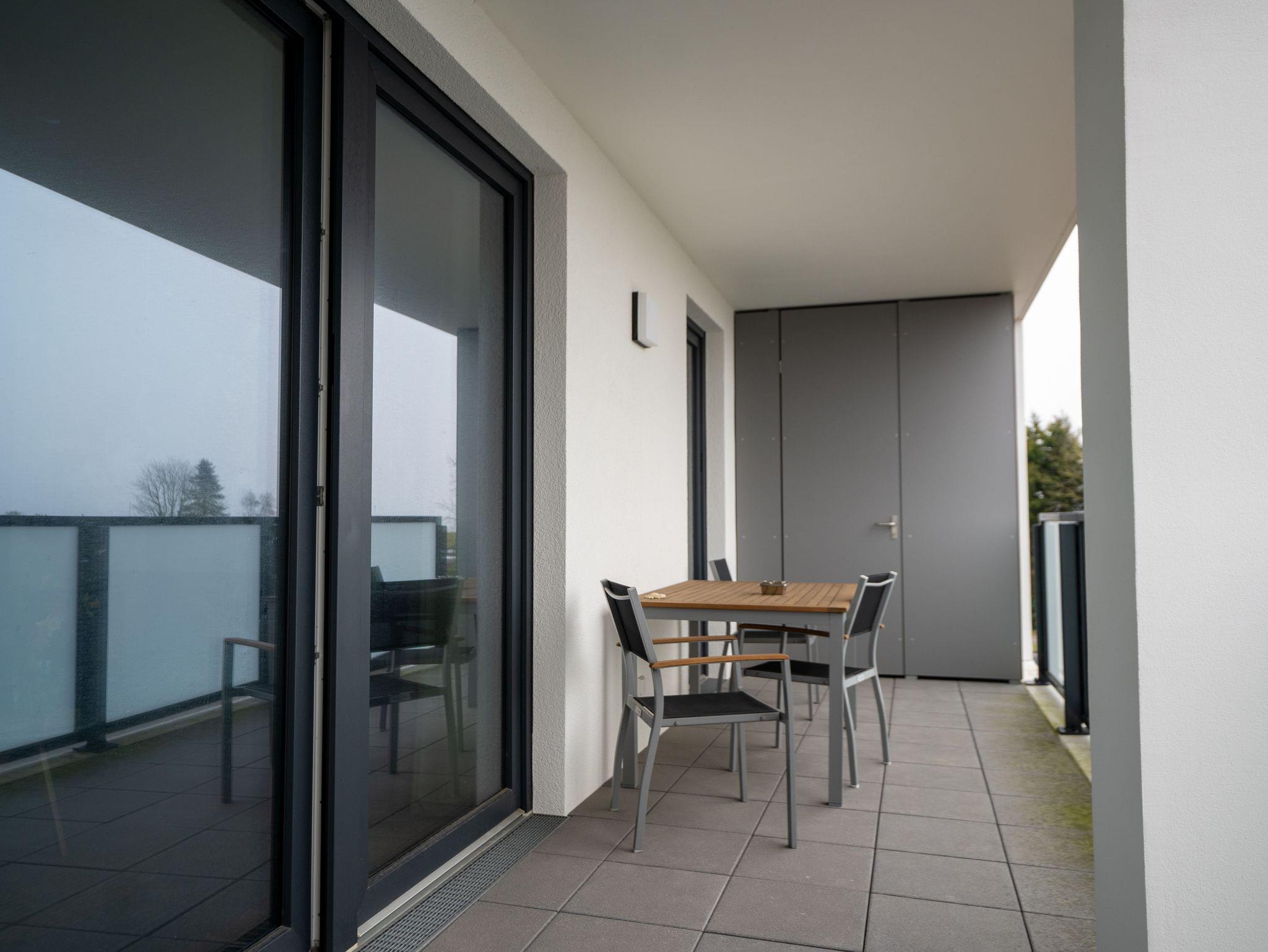Auf dem überdachten Westbalkon finden Sie Gartenmöbel mit Auflagen sowie zwei Sonnenliegen.