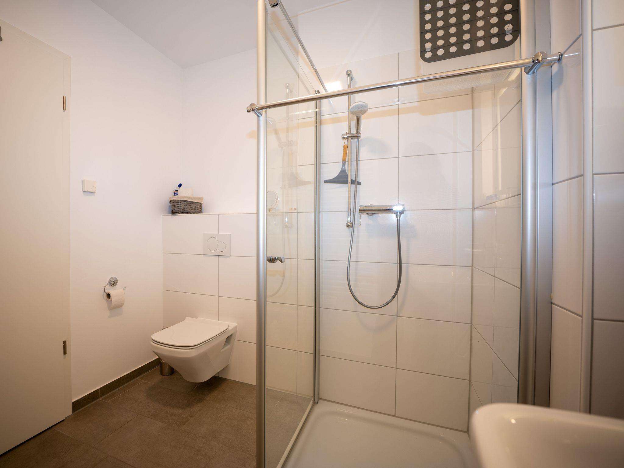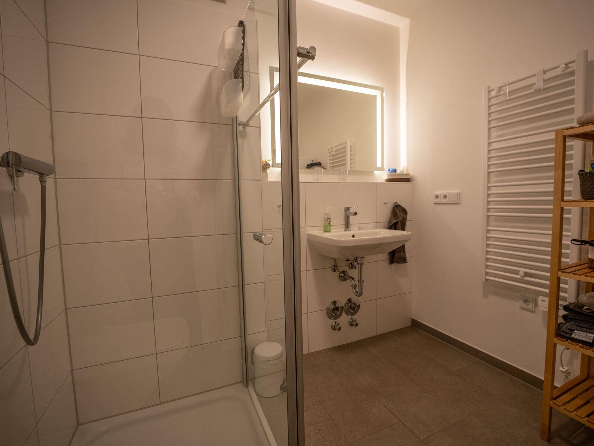 Im Bad sind neben, der Dusche, der Toilette und dem Waschbecken noch eine Waschmaschine und ein Trockner untergebracht.