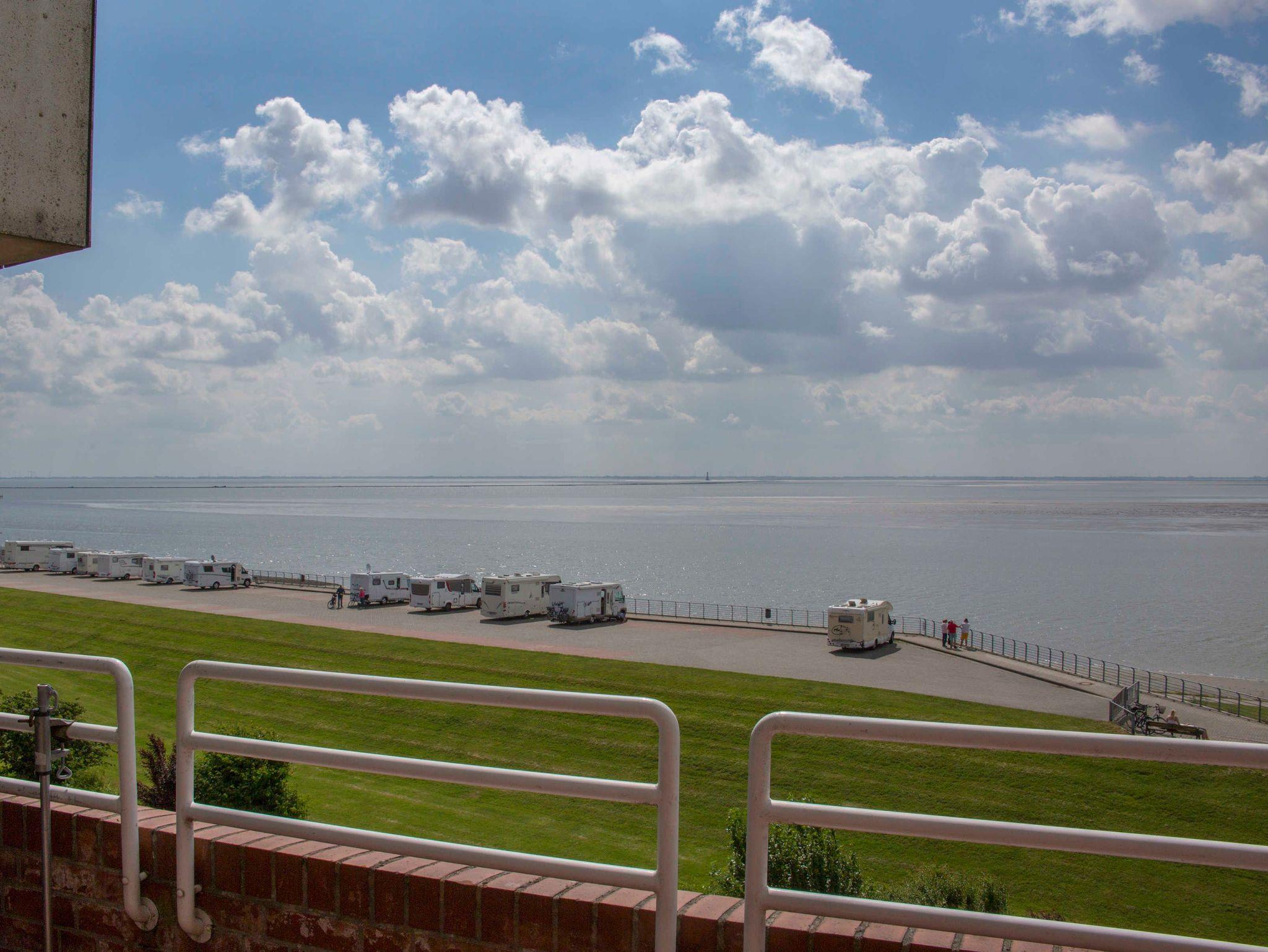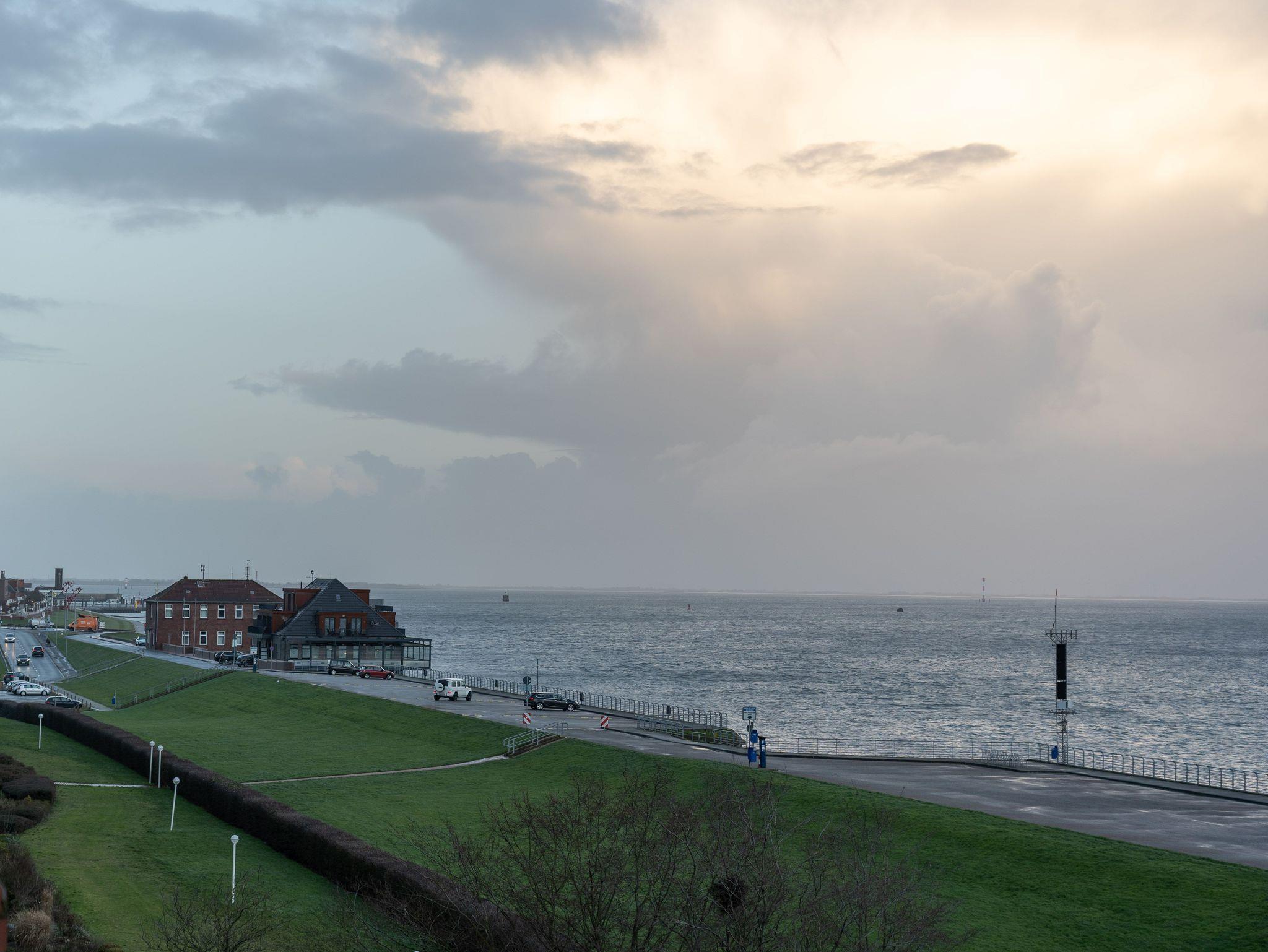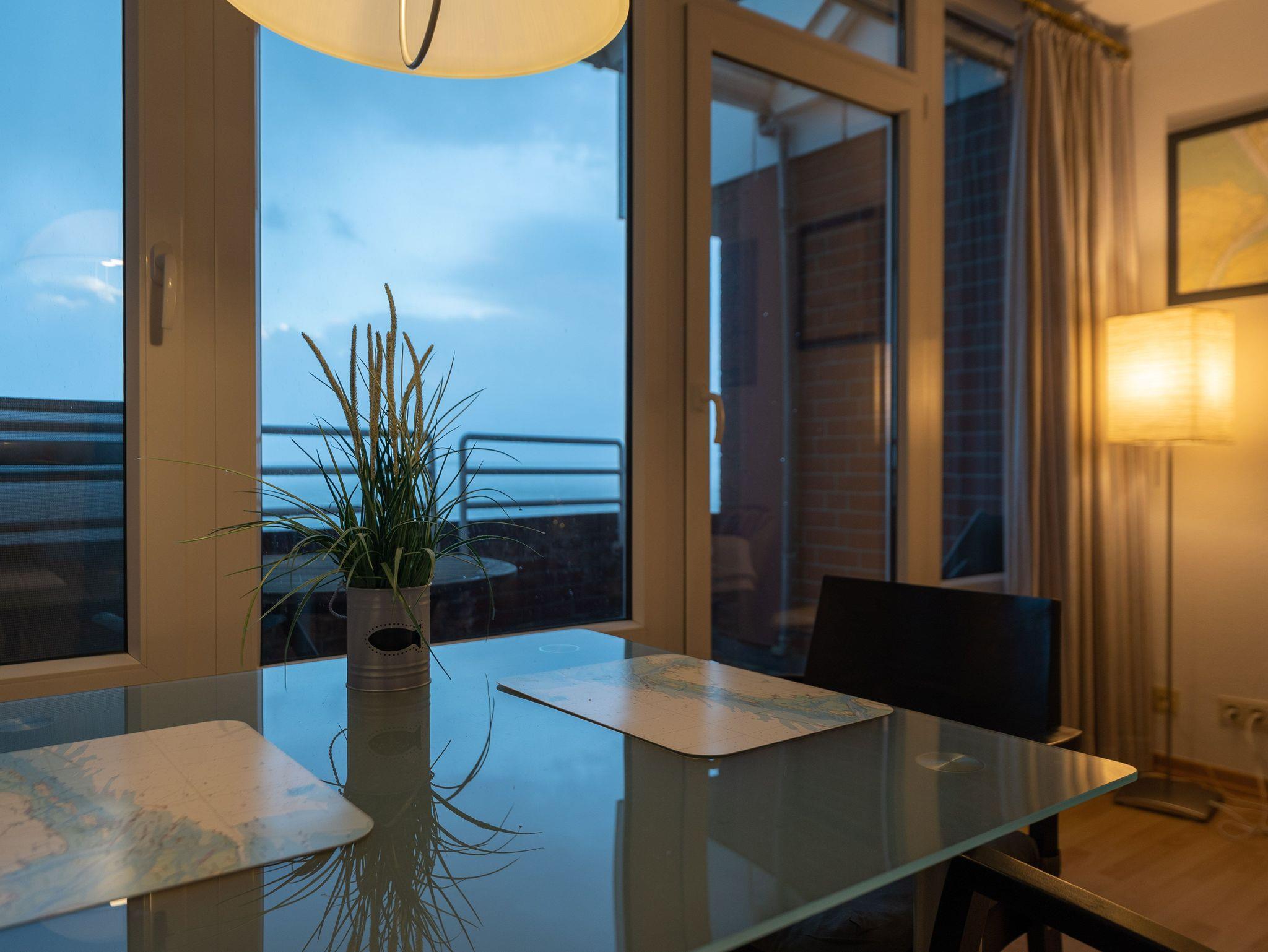 Die 65 qm große Ferienwohnung befindet sich im 5 Stock des beliebten Panoramahauses in Wilhelmshaven auf einer schmalen Landzunge zwischen Nordsee und großem Hafen. Wasser wohin man sieht.