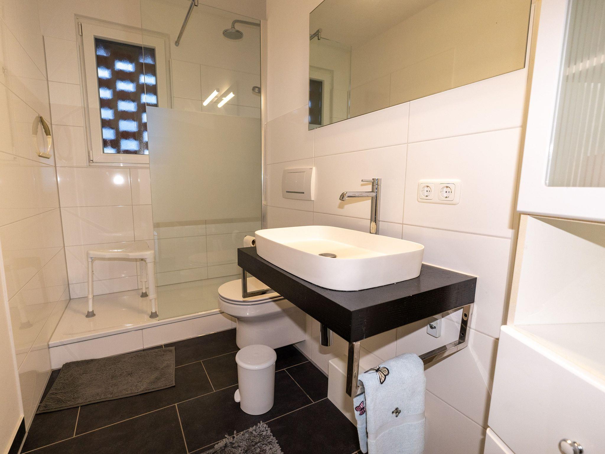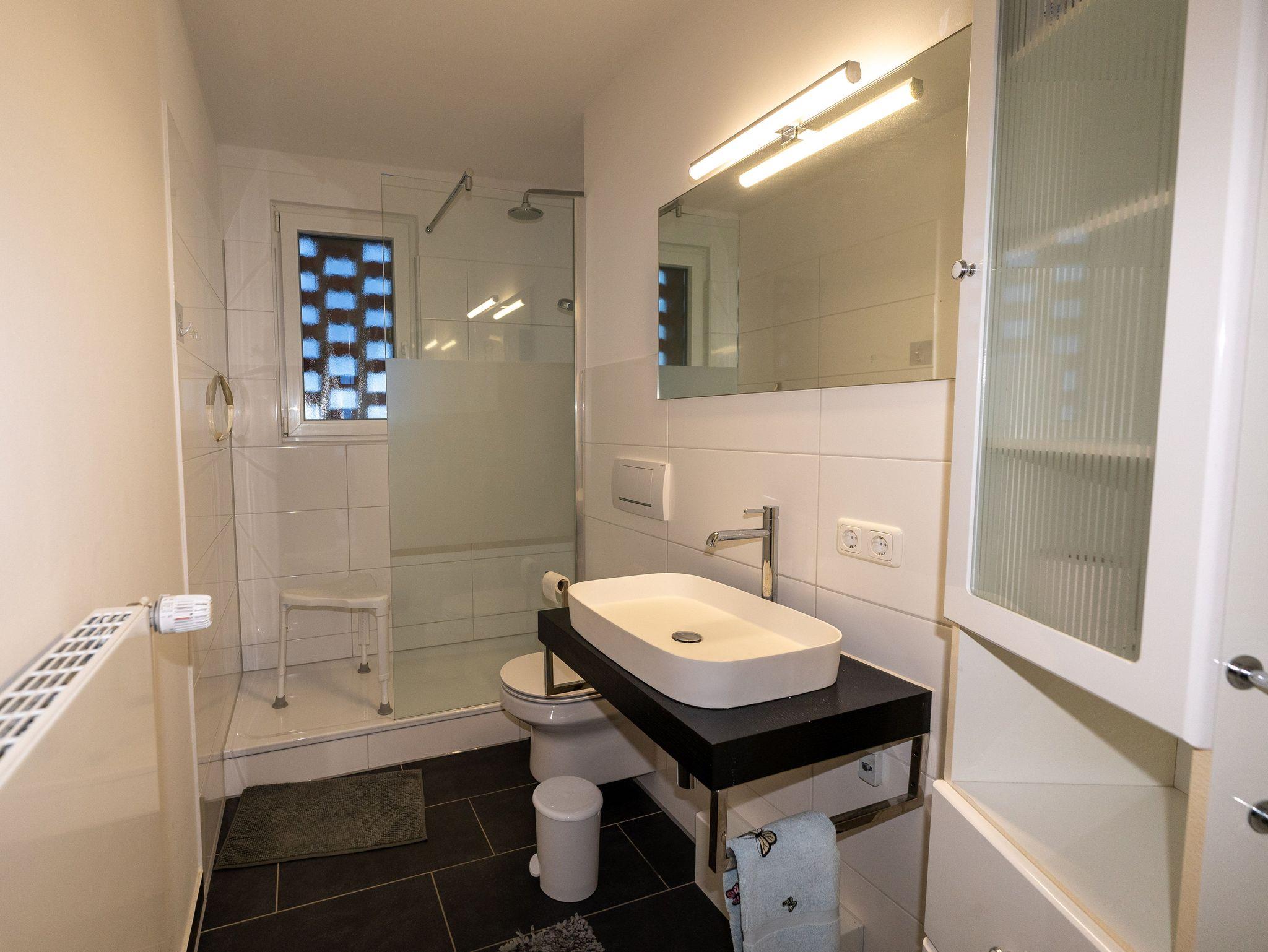 Das recht große Tageslichtbad ist mit einer Dusche ausgestattet und wurde in 2021 komplett saniert. Auch ein Föhn liegt für den Gast bereit.