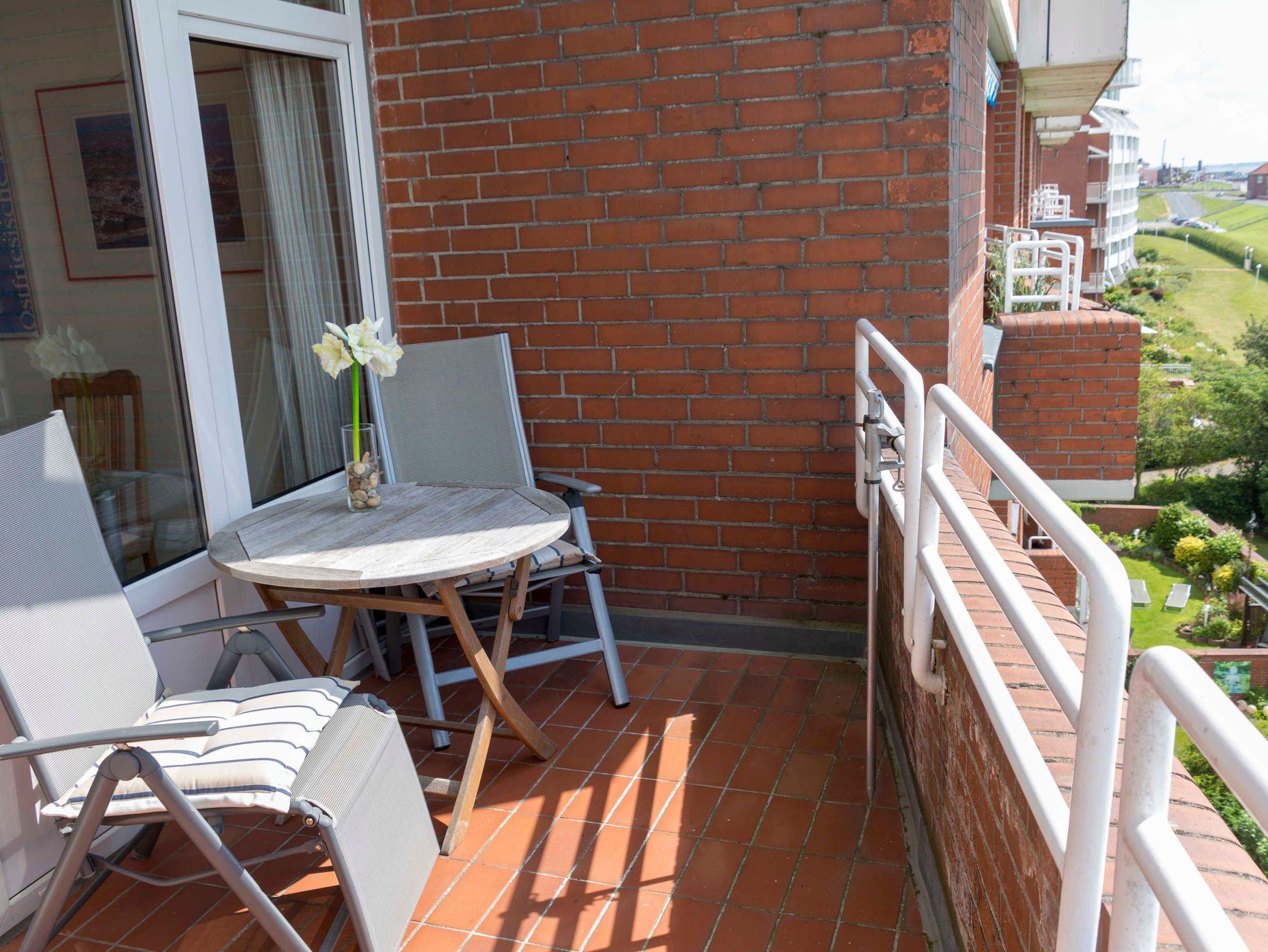 Der gemütliche, überdachte Balkon ist mit Tisch und Stühlen ausgestattet. Genießen Sie das Naturschauspiel Wattenmeer hautnah!