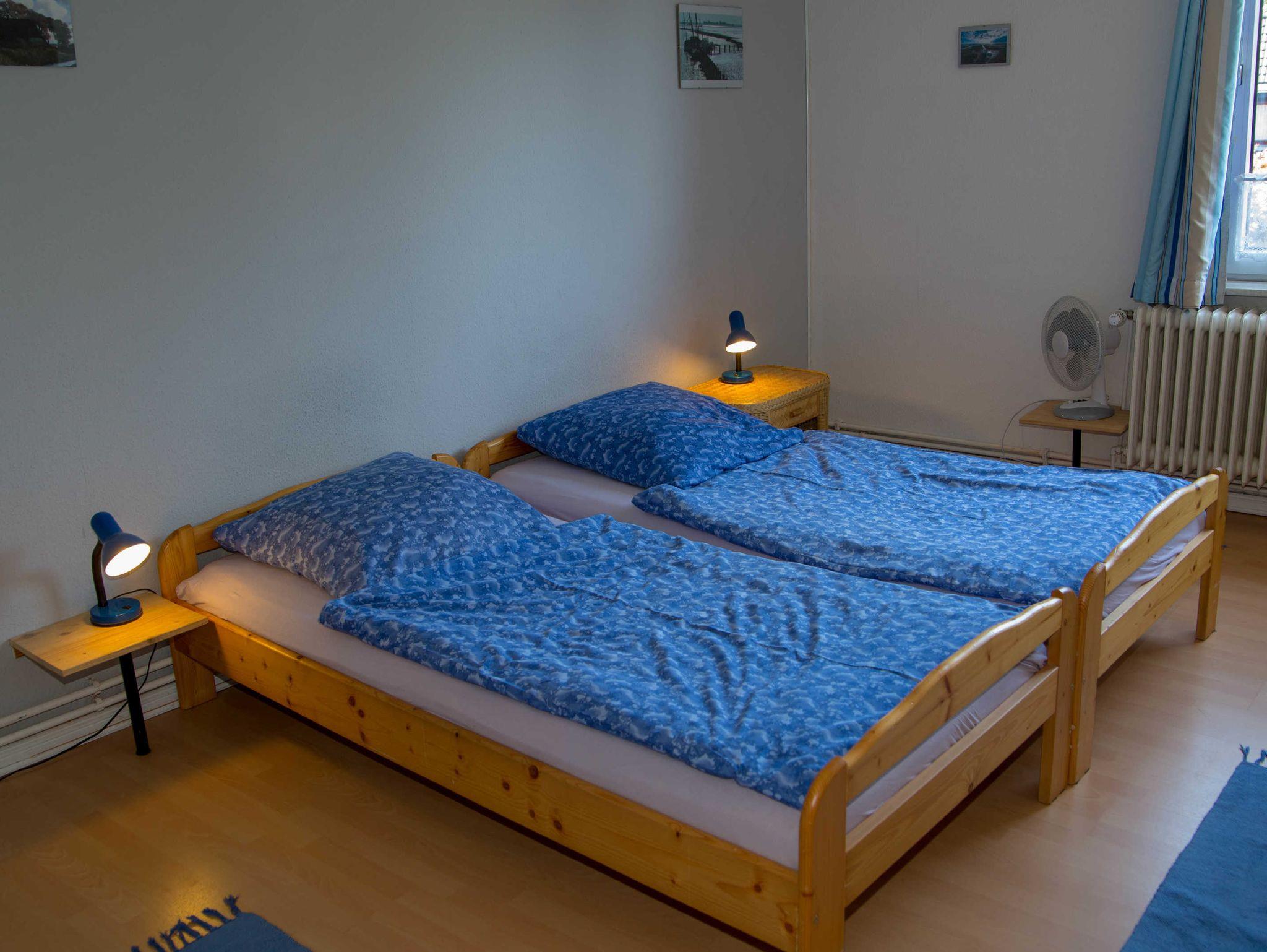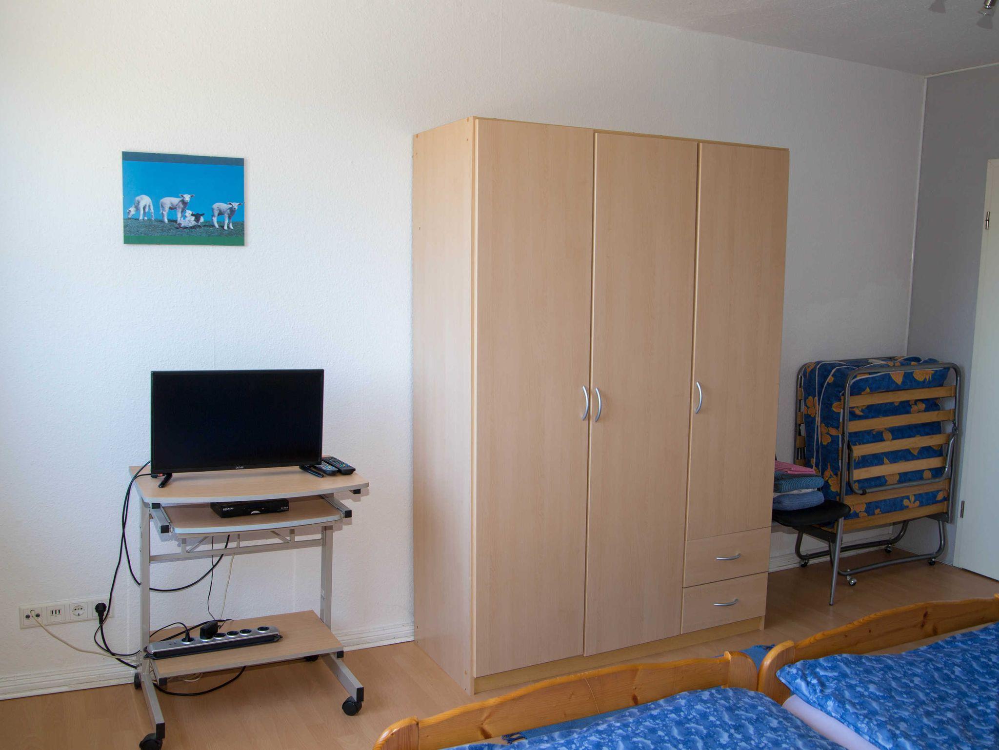 Das Schlafzimmer ist mit zwei Einzelbetten ausgestattet, die bei Bedarf zusammengestellt werden können. Der dreitürige Kleiderschrank bietet viel Platz. Auch in diesem Raum steht ein kleiner Fernseher.