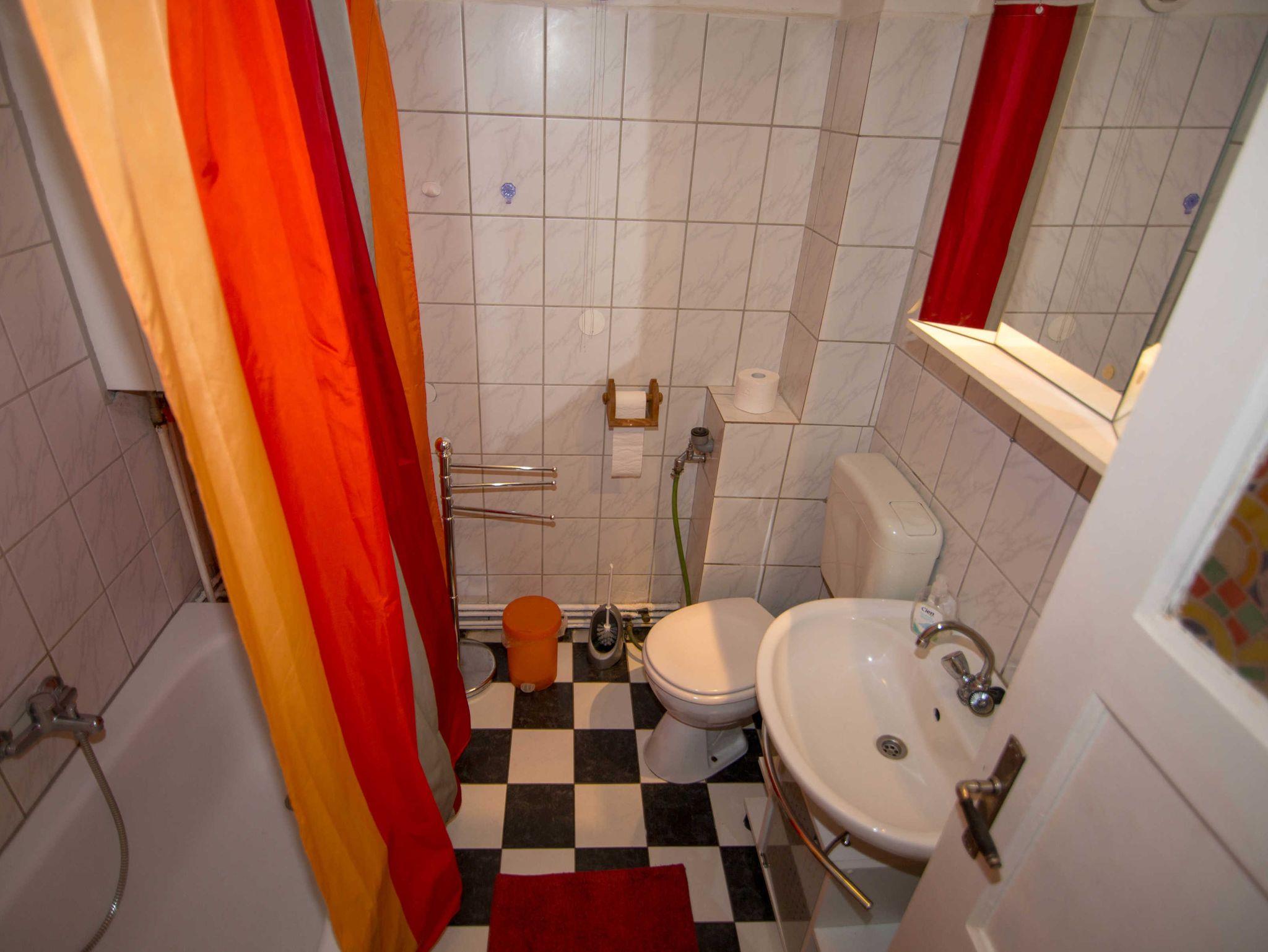 Das Badezimmer ist mit einer Wanne versehen. Ein Schrank unter dem Waschbecken, Spiegelschrank und Handtuchhalter statten das Badezimmer aus.