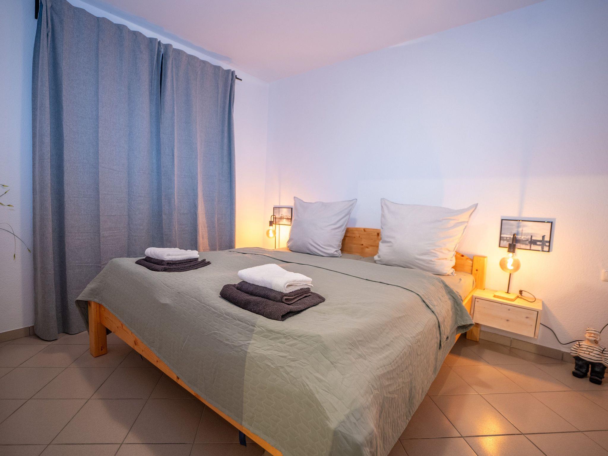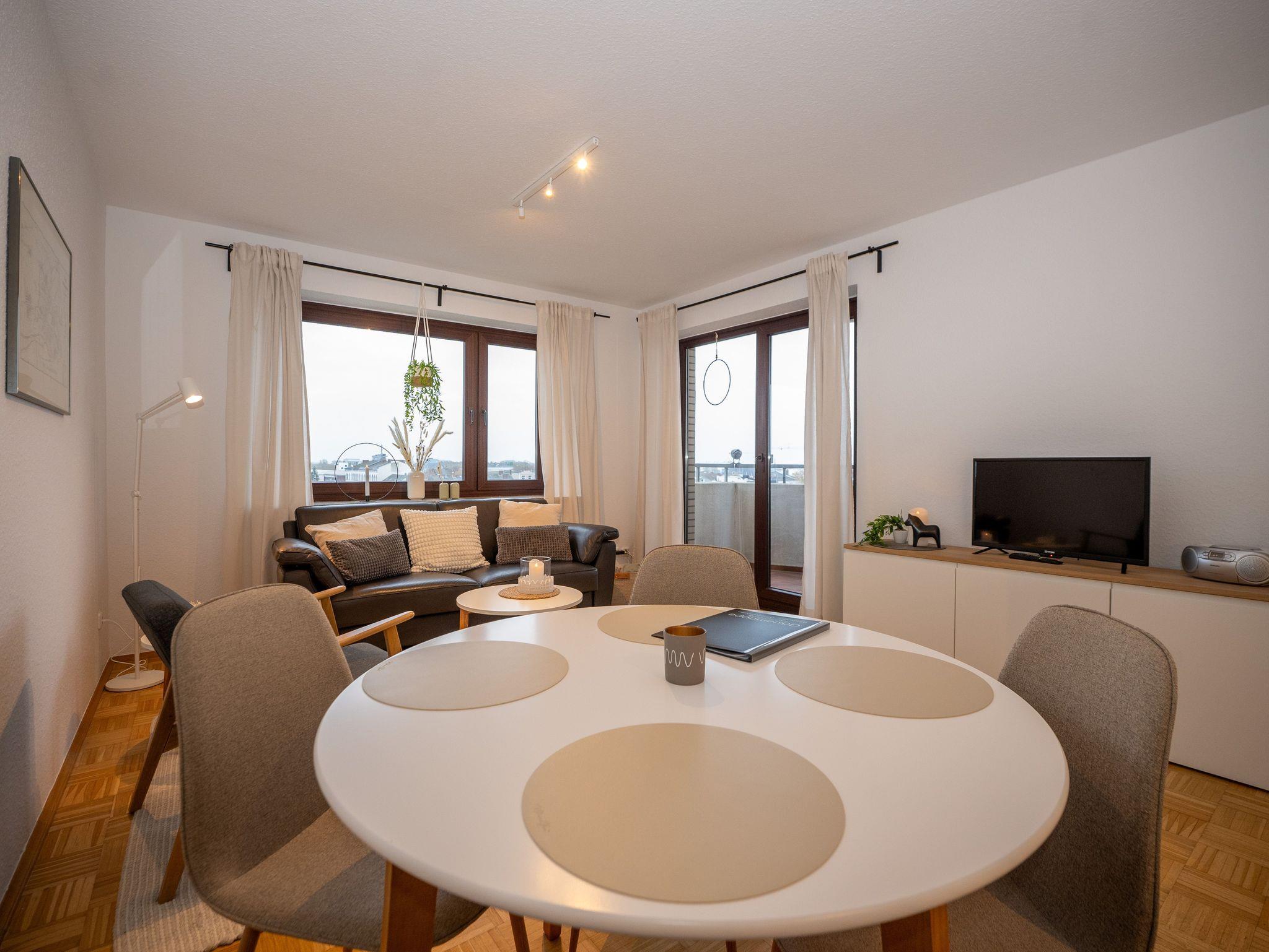 Die Ferienwohnung verfügt über ein Schafzimmer, eine Couch im Wohnzimmer, ein Bad mit WC und Dusche, einem großen Wohnzimmer mit offener, angrenzender Küchenzeile. Ein Balkon, der Frühstücken in der Morgensonne ermöglicht, machen diese gemütliche Wohnung zum perfekten Feriendomizil. Kabel-TV, eine komplett ausgestattete Küche mit Kaffee-Pad-Maschine und einem Geschirrspüler, runden die Ausstattung der Wohnung ab. Kosten für den PKW-Stellplatz, WLAN sowie Handtücher und Bettwäsche sind bereits im Übernachtungspreis enthalten. Die Wohnung ist ebenerdig.