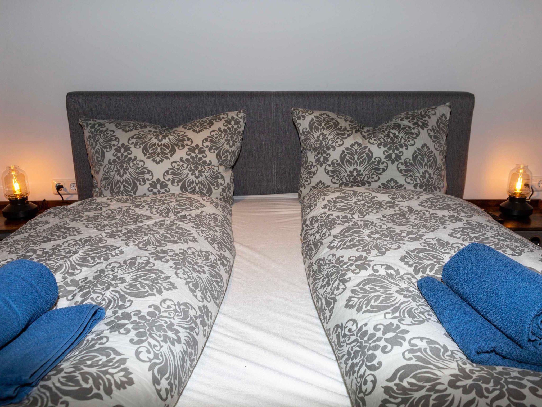 Zwei Schlafzimmer mit komfortablen Betten ( 1,80 x 2,00m) mit TV, ein Schlafzimmer mit französischem Bett, eine voll ausgestattete Küche mit Wasserkochter, Toaster, Mikrowelle, Kühl/ Gefrier-Kombi, Ceranfeld-Herd, Backofen, Geschirrspüler sowie zwei Badezimmer mit Dusche, sowie ein großes Wohnzimmer mit Essplatz und viel Blick ins Grüne warten auf Sie!