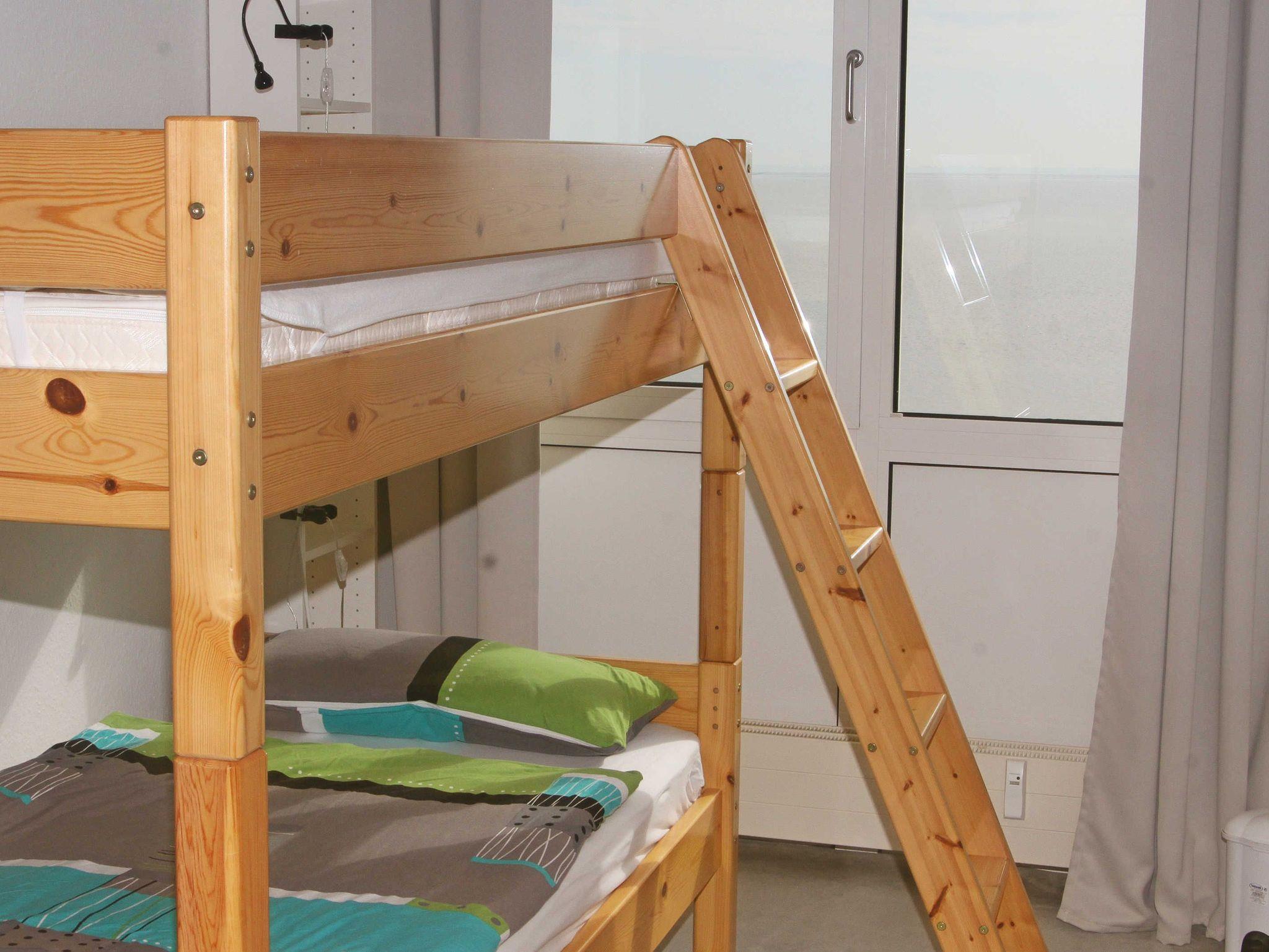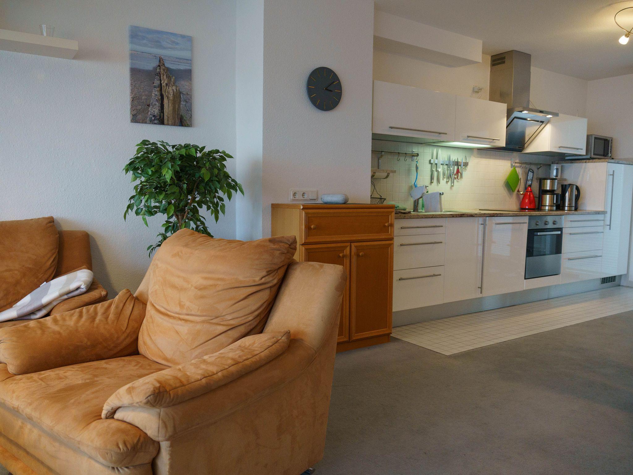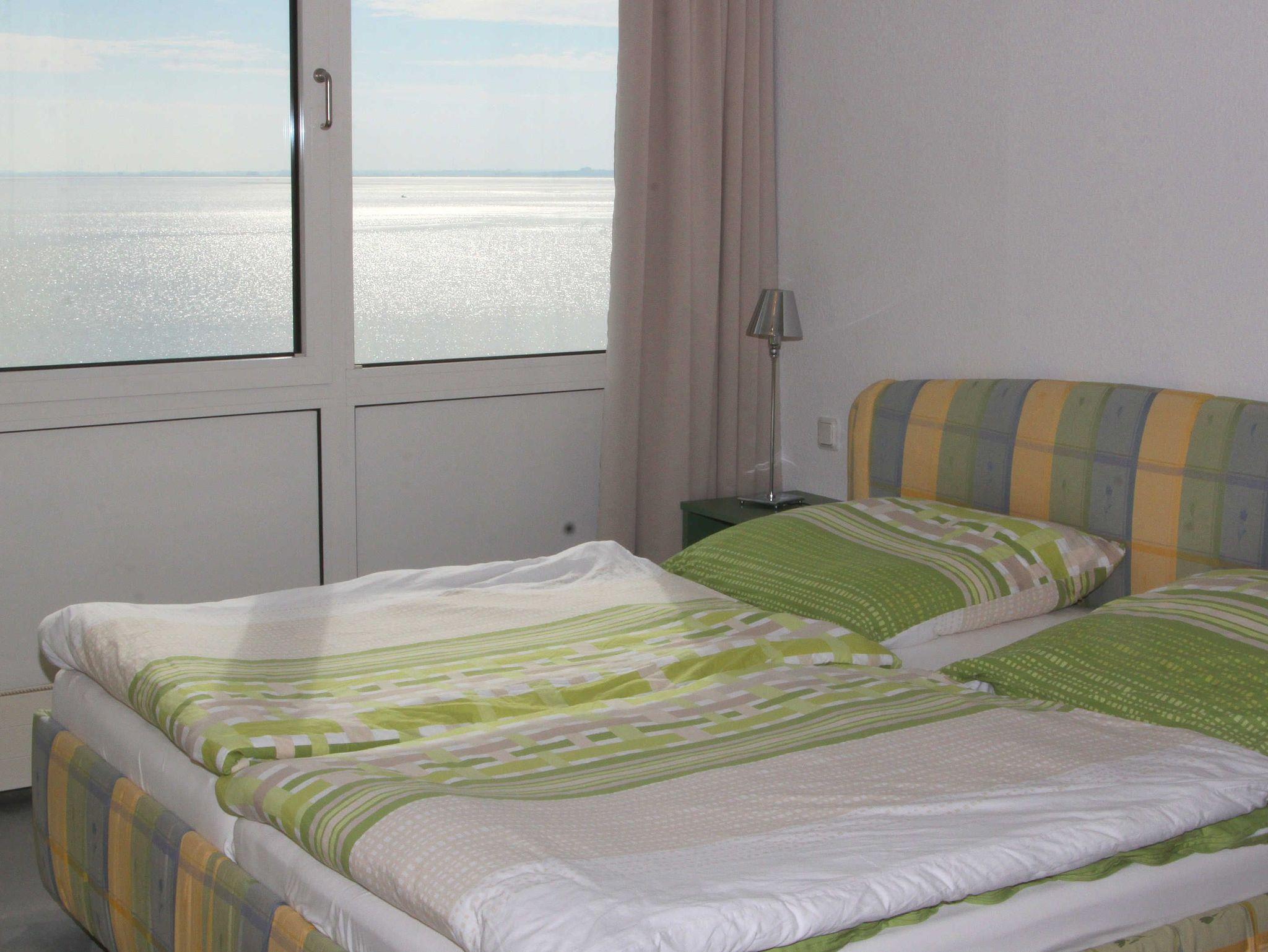 Diese große Ferienwohnung ist für maximal vier Personen ausgelegt. Sie verfügt über einen großen, offenen Wohn-, und Kochbereich, zwei Schlafzimmer, einem Bad und einem Flur. Die Küche ist umfangreich ausgestattet. Über den Geschirrspüler, einer Kaffemaschine für die Kaffeezubereitung, einer Mikrowelle, einem Wasserkocher, dem Ceranfeld-Herd mit Backofen bis hin zum Kühlschrank mit Eisfach ist alles vorhanden. Ein moderner Fernseher, ein DVD-Player lädt zum Verweilen auf dem Sofa ein. Das Schlafzimmer verfügt über ein großes Doppelbett, das zweite Schlafzimmer ist kleiner und mit einem Etagenbett ausgestattet. Beide Schlafzimmer bieten ebenfalls den grandiosen Blick auf die Nordsee. Diese Wohnung bietet den Gästen WLAN an.