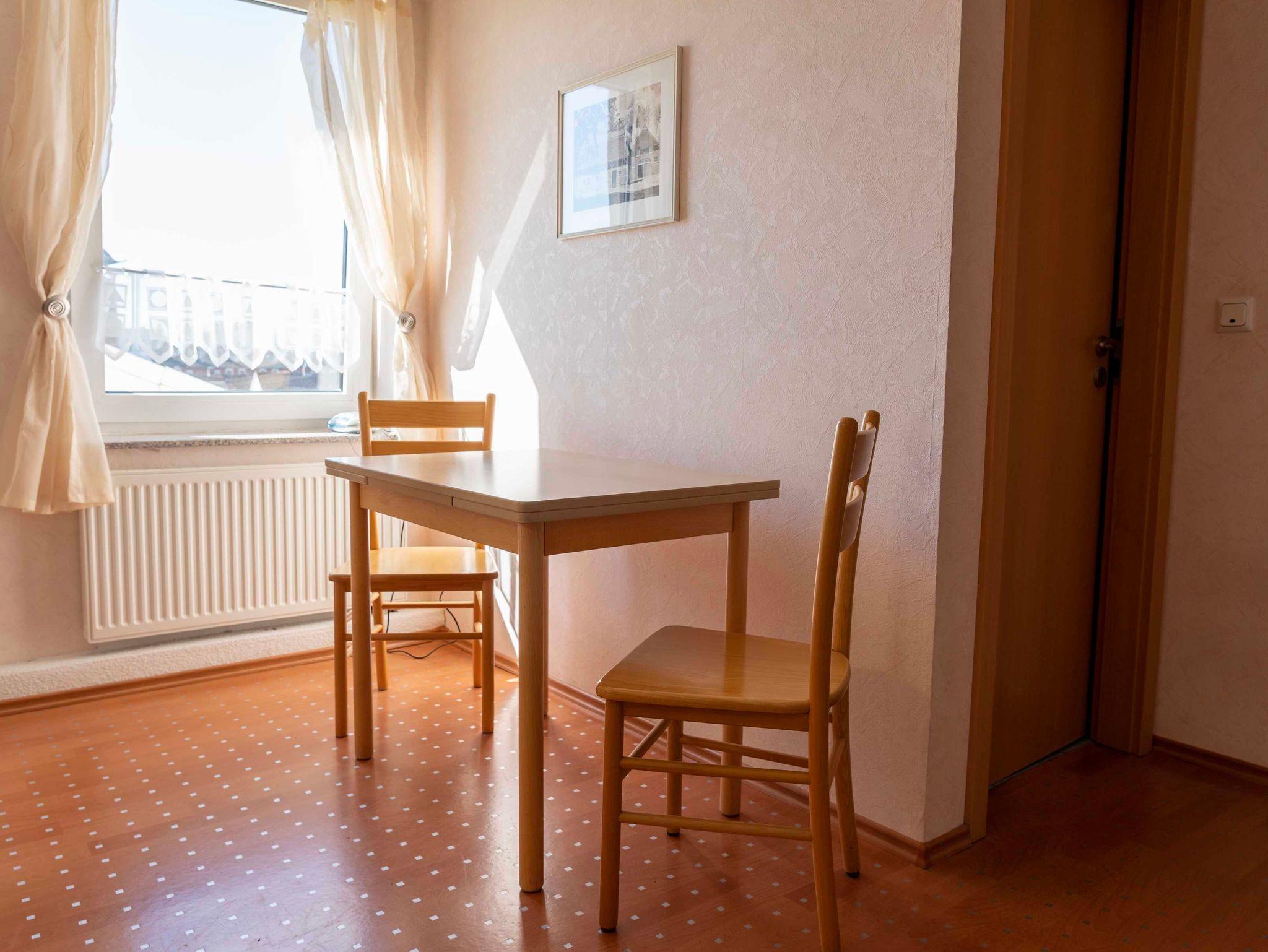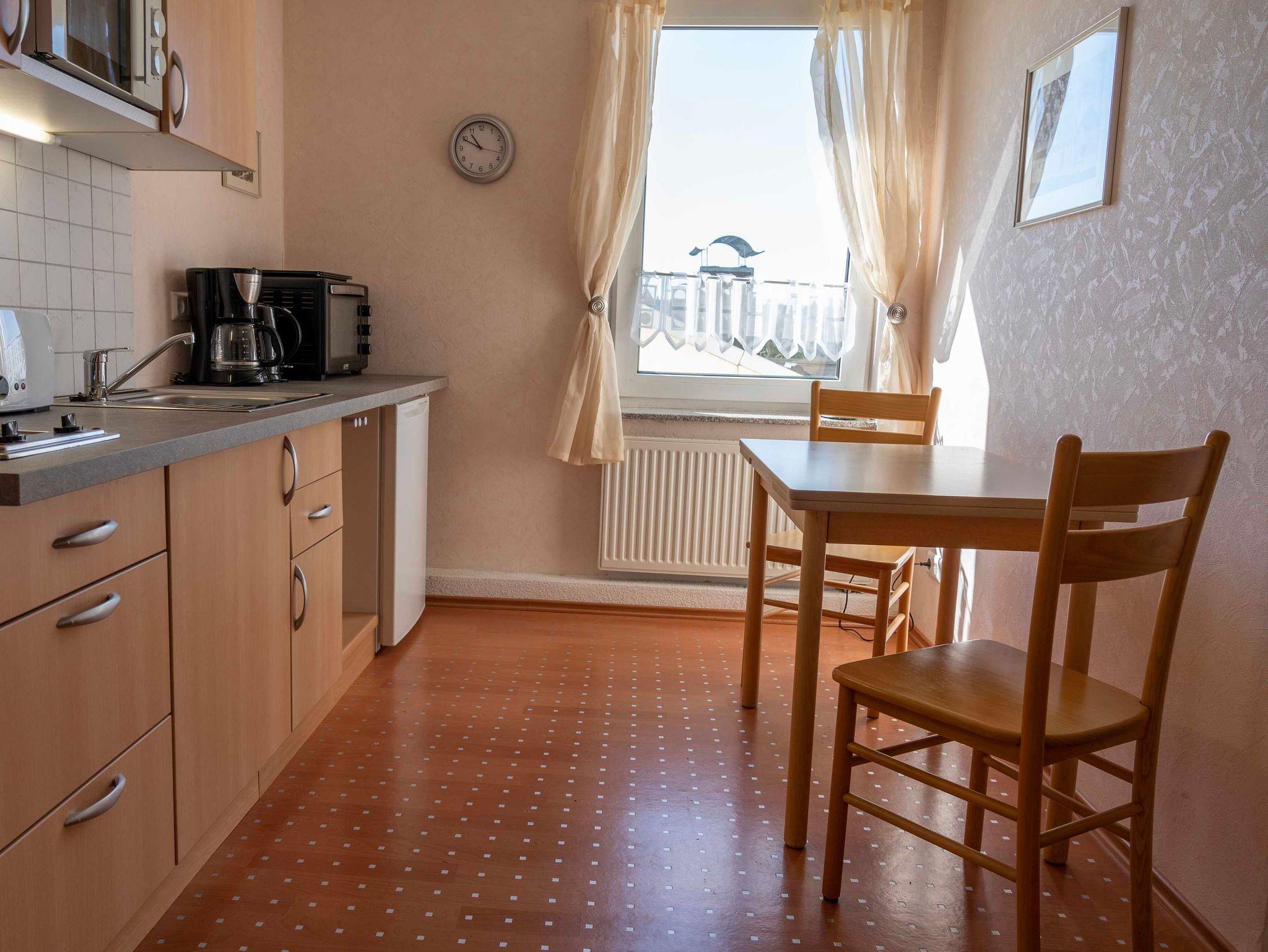 Die kleine Küche ist komplett ausgestattet mit Kühlschrank mit Gefrierfach, Ceranfeld mit Backofen, Mikrowelle, Kaffemaschine, Toaster und Wasserkocher. Hier ist auch ein kleiner Essplatz untergebracht.