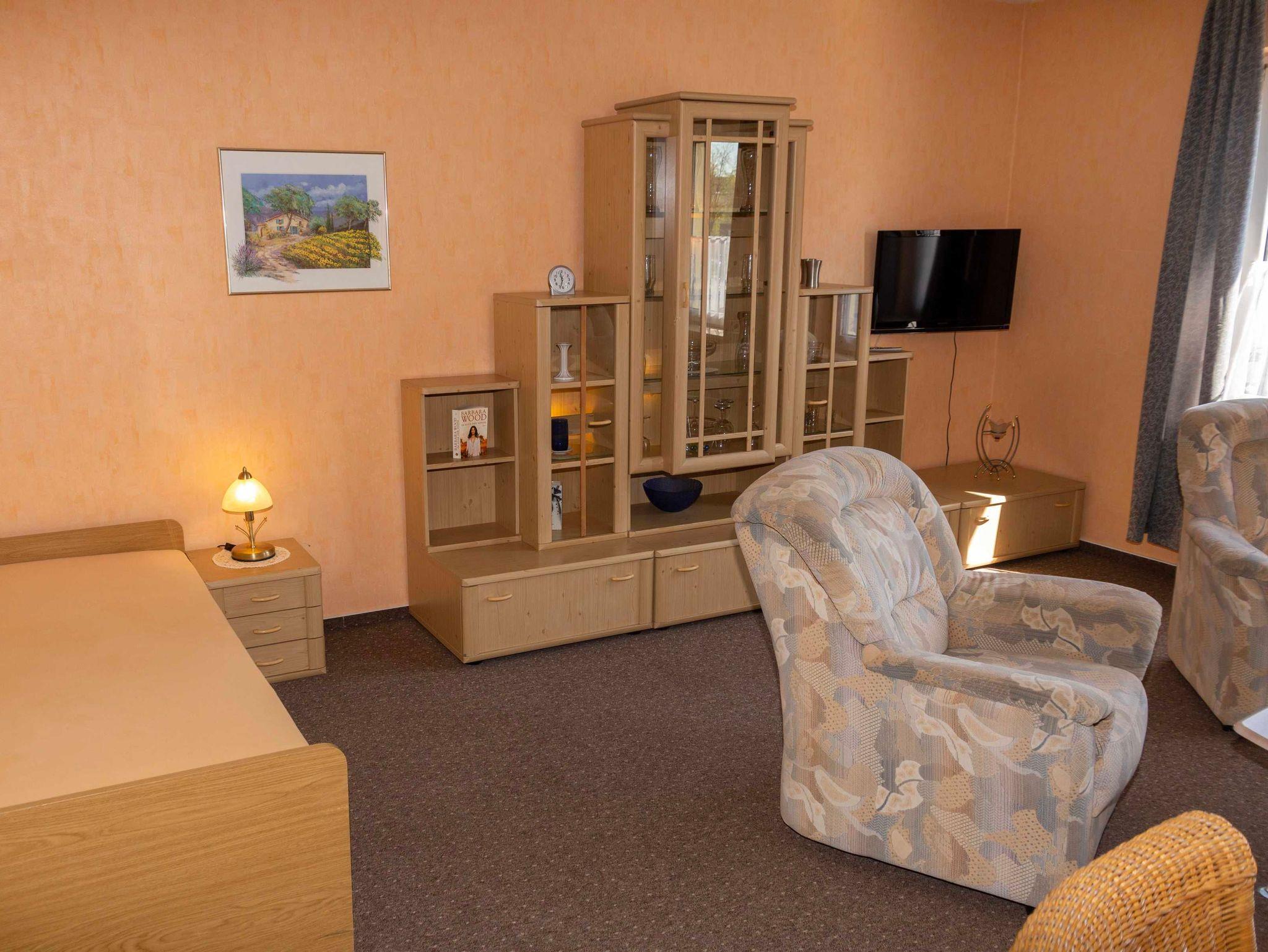 Im großen Wohnzimmer befinden sich neben der gemütlichen Sitzecke eine feste Schlafmöglichkeit (Einzelbett).